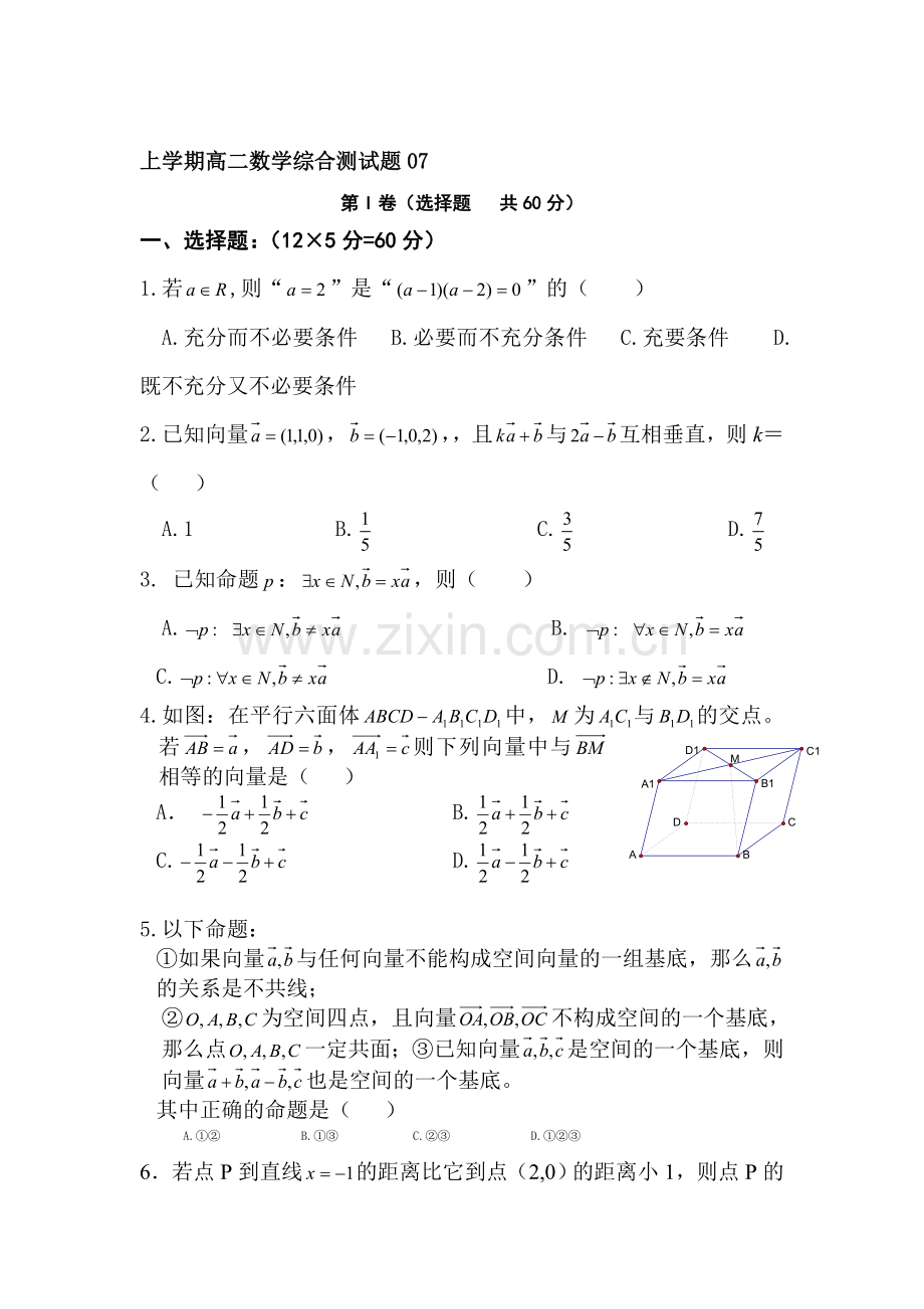 4.如图:在平行六面体中,为与的交点。若,,则下列向量中与相等的向量是( )
