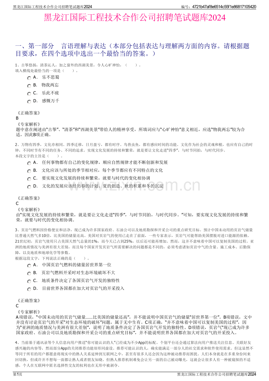 黑龙江国际工程技术合作公司招聘笔试题库2024一、第一部分言语理解与表达(本部分包括表达与理解两方面的内容。请根据题目要求,在四个选项中选出一个最恰当的答案。)1、古筝悠扬,清茶沁人,加之窗外的西湖美景,令人心旷神怡,()。填入横线处最恰当的一项是()。A 乐不思蜀 B 物我两忘 C 乐此不疲 D 感慨万千正确答案B专家解析题中意在阐述由“古筝”、“清茶”和“西湖美景”带给人的精神享受,所填词应与“心旷神怡”意义相近,应选“物我两忘”较为合适,因此B项正确。2、万物有四季,文化亦相同。四季迁移,日月盈亏,都有时序。鸟兽虫鱼,都有感应时间的功能。文化作为社会的灵魂和根,也应有自己的时钟,不同时节有不同的任务、不同的追求。实现文化发展的持续和繁荣,就是要让文化走进“四季”,与时节同拍,与时代同步。本段文字的主旨是()。A 任何事物都有自己的变化规律,顺应自然规律才能不断创新和发展 B 文化应该与所处的季节相对应,每个季节都应有不同特点的文化 C 要实现文化发展的持续和繁荣,就要与时代的变化相协调 D 文化的发展应该经历春的计划、夏的创造、秋的积累和冬的沉淀正确答案C专家解析由“实现文化发展的持续和繁荣,就是要让文化走进“四季”,与时节同拍,与时代同步。”可知,要实现文化发展的持续和繁荣,就要与时代的变化相协调。3、页岩气燃料因价格便宜和洁净,现已成为许多国家政府、石油公司以及地质勘探和开采公司的重点研究目标。预计中国未动用的页岩气储量比普通天然气多10倍,比美国的储量还高。美国对页岩气的使用已走在了前面,一些专家表示,页岩气可能帮助美国摆脱对进口能源的依赖。21世纪初,页岩气使用只占美国天然气总量的1%,而今天已占到25%,以后还可能再增加。然而,这并不意味着中国可以复制美国的过程。亚洲的地质情况与美洲有很大差别,而且每个国家开发页岩气所需要解决的问题都是不同的,必须考虑诸如页岩中气的含量、施工成本、后勤保障,以及地质和地球化学等参数。根据这段文字,下列说法正确的是()。A 中国页岩气燃料的储量居世界第一位 B 页岩气燃料开采时对生态环境破坏不大 C 地质条件决定了各国页岩气开发的独特性 D 目前世界各国都在加大对页岩气的开采投入正确答案C专家解析A项错误,“中国未动用的页岩气储量比美国的储量还高”,并不能说明中国页岩气的储量“居世界第一位”。B项错误,文中并没有讨论页岩气的开采“对生态环境的破坏”问题,属于无中生有。C项正确,“并不意味着中国可以复制美国的过程”,因为“亚洲的地质情况与美洲有很大差别”,说明了地质条件决定了各国页岩气开发的独特性。D项错误,页岩气“现已成为许多国家政府、石油公司以及地质勘探和开采公司的重点研究目标”,并不能说明世界各国都在加大对页岩气的开采投入。4、当前基于通讯录等个人信息向用户推送“你可能认识的人”已经成为不少App的标配。个别平台还会通过算法向用户推送关注信息、关联好友感兴趣的内容等,然而部分App的关闭推荐功能却形同虚设。推荐可能认识的人,确实能满足一部分人的社交需求和软件使用需求。但这显然不等同于所有的用户都愿意将现实中的熟人关系延伸到互联网之中,甚至有很多人还会因为这种被动推荐而困扰。人们本身就是在多重身份间来回切换,但或许并不想每一面都让熟人或者朋友知晓。但熟人推荐机制难免会让另一面的自己被动曝光,这就会让很多人有一种被窥探的不适感,个人在互联网中匿名选择性交友的权利也在无形中被剥夺。黑龙江国际工程技术合作公司招聘笔试题库2024编号:4721b47af8e6514c55f1e86817105420第1页黑龙江国际工程技术合作公司招聘笔试题库2024这段话作者最想表达的观点是:A“熟人推荐”机制的本质是一种被动曝光 B“熟人推荐”机制剥夺用户的交友选择权 C 社交平台应尽力保护人与人之间的边界感 D 人们其实大都有着多重角色和多重性格正确答案C专家解析文段开篇引出不少App向用户推送“你可能认识的人”这一话题,接下来通过“但”强调并非所有的用户都愿意将现实中的熟人关系延伸到互联网之中,紧接着指出人们本身就是在多重身份间来回切换的,或许并不想让熟人或朋友知晓自己的每一面,尾句再次强调熟人推荐机制会让用户另一面的自己被动曝光,剥夺了用户在互联网中匿名选择性交友的权利。故文段重在提出问题,应优选针对问题提出的对策,即社交平台需要采取措施去保护人与人之间的边界感,对应C项。A项,文段重在针对问题提出对策,“熟人推荐机制的本质”非重点,排除;B项,“熟人推荐机制剥夺用户的交友选择权”为问题表述,非重点,排除;D项,对应文段中间解释说明部分的内容,非重点,排除。故正确答案为C。【文段出处】“推荐可能认识的人”被反感,是用户对边界感的渴望5、长江拥有水生生物4300多种,其中鱼类400多种(含亚种),170多种为长江特有,是世界上水生生物多样性最为丰富的河流之一。水生生物尤其是鱼类是长江水域生态系统健康状况的标志,而实施长江流域重点水域常年禁捕就是要在一段时间内从根本上停止捕捞利用,这是有效缓解长江生物资源衰退和生物多样性下降危机的关键之举,对改善长江水域生态环境、恢复生态功能具有重要意义。这