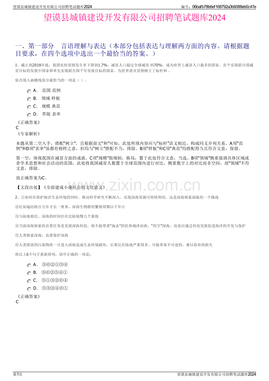 望谟县城镇建设开发有限公司招聘笔试题库2024一、第一部分言语理解与表达(本部分包括表达与理解两方面的内容。请根据题目要求,在四个选项中选出一个最恰当的答案。)1、截止到2018年底,我国农村贫困发生率下降到1.7%,减贫人口超过全球减贫 的70%,成为世界上减贫人口最多的国家、首个实现联合国减贫目标的发展中国家和率先实现联合国千年发展目标的国家,为世界消灭贫困树立了标杆和。依次填入画横线部分最恰当的一项是()。A 范围 范例 B 领域 样板 C 规模 典范 D 界限 表率正确答案C专家解析本题从第二空入手,搭配“树立”,且根据前文“和”可知,此处所填内容应与“标杆”语义相近,构成同义并列关系。A项“范例”和D项“表率”虽都有榜样之意,但均与“树立”搭配不当,排除。B项“样板”和C项“典范”均搭配得当且符合文意,保留。第一空,体现我国在减贫方面的成就。C项“规模”指规制,格局,置于此处符合文意,当选。B项“领域”侧重强调具体区域或者学术思想和社会活动的范围,此处将我国减贫人数置于全球范围内进行对比,侧重数字上的对比而非空间,故“领域”不符文意,排除。故正确答案为C。【文段出处】全面建成小康社会的文化意义2、如何在保护海洋生态环境的同时,推动科学研究不断深入、实现深海资源可持续利用,这是深海探索面临的一个挑战比如锰结核百万年才长一厘米,深部生物群的繁殖周期以千年计与陆地相比,深海的时间往往比陆地慢几个量级当前深海探索的首要任务是发展深海科技,绝不能带着“淘金”的狂热竭泽而渔、“挖空”深海,而是应通过科技发展促进海洋的开发与保护人类探索深海,也要保护深海人类排放的污染物质一旦进入深海造成生态环境破坏,后果比在陆地严重得多,可能带来不可逆的、难以弥补的损失将以上6个句子重新排列,语序正确的一项是:A B C D 正确答案C望谟县城镇建设开发有限公司招聘笔试题库2024编号:06bafb78b6ef168792a3b6088eb0c47e第1页望谟县城镇建设开发有限公司招聘笔试题库2024专家解析对比选项,确定首句。句将深海的时间与陆地进行对比,句引出话题,要探索深海、保护深海,均可作首句。继续观察,句通过“比如”进行举例说明,指出深海矿物和生物的生长和繁殖周期很长,结合选项,句前分别为句和句,句介绍深海的时间比陆地慢,句是对句的举例说明,衔接恰当,保留C、D两项。句介绍人类排放的污染物质进入深海带来的危害,与句话题不一致,故两句无法衔接,排除A、B两项。对比C、D两项,观察尾句,句介绍深海探索面临的挑战,句介绍深海探索时该如何做,应先提出问题再给出对策,故句应在句之前,排除D项,C项当选。故正确答案为C。【文段出处】深海探索:更好认识海洋3、教育改革是一个复杂的系统工程,要坚持系统观念,增强改革的系统性、整体性、协同性,统筹推进育人方式、办学模式、管理体制、保障机制改革,全面提高教育治理体系和治理能力现代化水平。坚持重点突破,牵住改革“牛鼻子”、找准改革突破口,紧扣建设教育强国目标,以深化新时代教育评价改革为牵引,发挥好教育评价“指挥棒”作用,构建多元主体参与、符合中国实际、具有世界水平的教育评价体系,为我国教育事业发展提供方向指引,还可以为个性化学习、终身学习、扩大优质教育资源覆盖面和教育现代化提供有效支撑。这段文字主要说明的是:A 以深化教育评价改革为抓手全面提升教育水平 B 教育改革应把握好系统推进和重点突破的关系 C 落实现代化教育建设助力优质教育资源全覆盖 D 保持系统性理念全面推进教育管理体制的改革正确答案B专家解析文段开篇指出教育改革要坚持系统观念,全面提高教育治理体系和治理能力现代化水平,接着指出要坚持重点突破,找准改革突破口,即以深化新时代教育评价改革为牵引,构建具有世界水平的教育评价体系,并介绍了好的教育评价体系所带来的意义。故文段为并列结构,强调对于教育改革在把握全面推进的同时也要注重重点突破,对应B项。A项,“教育评价改革”与“全面提升教育水平”之间的关系文段并未提及,无中生有,且“教育评价改革”为并列的后半部分内容,表述片面,排除;C项,“教育资源全覆盖”对应文段“重点突破”部分的内容,表述片面,排除;D项,“系统性理念”对应文段“系统观念”部分的内容,表述片面,排除。故正确答案为B。【文段出处】深化改革创新,激发教育发展活力4、受供求关系影响,餐厅的年夜饭处于“一位难求”的态势中,“不能点菜只有套餐”成为一种行业潜规则。这意味着,不但消费体验的舒适度受到影响,而且还可能因菜品不合口味带来浪费。依据消费者权益保护法,消费者有权自主选择商品品种或者服务方式。年夜饭不能“私人定制”,消费者的选择权难以得到充分满足。不过,受供需关系的影响以及考虑到节庆聚会用餐的特殊性,商家采用“套餐模式”主要是基于成本和效率两方面的权衡,因而也有一定的合理性。这段文字接下来最有可能讲述的是:A 维护消费者权益以及反食品浪费的举措 B 造成年夜饭“一位难求”现象的现实背景 C 如何寻求供需平衡点整治年夜饭乱象 D 如何引导餐饮企业和商家规范自身行为正确答案C望谟县城镇建设开发有限公司招聘笔试题库2024编号:06bafb78b6ef168792a3b6088eb0c47e第2页望谟县城镇