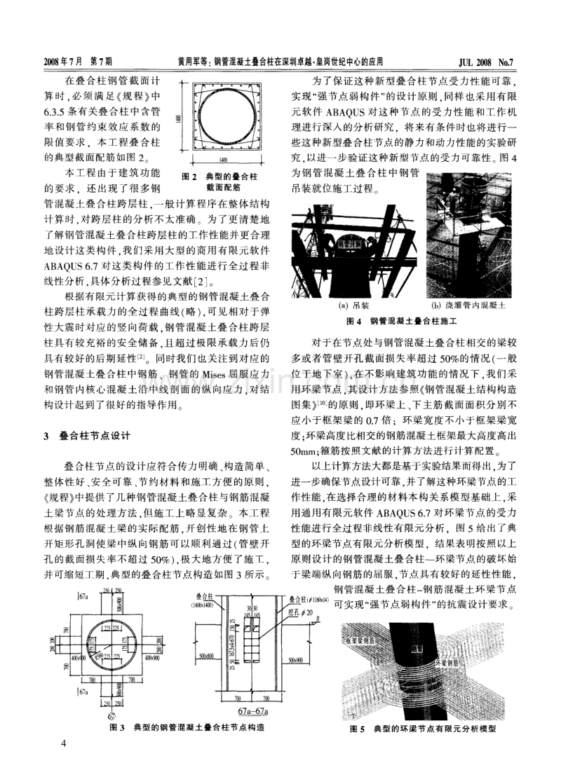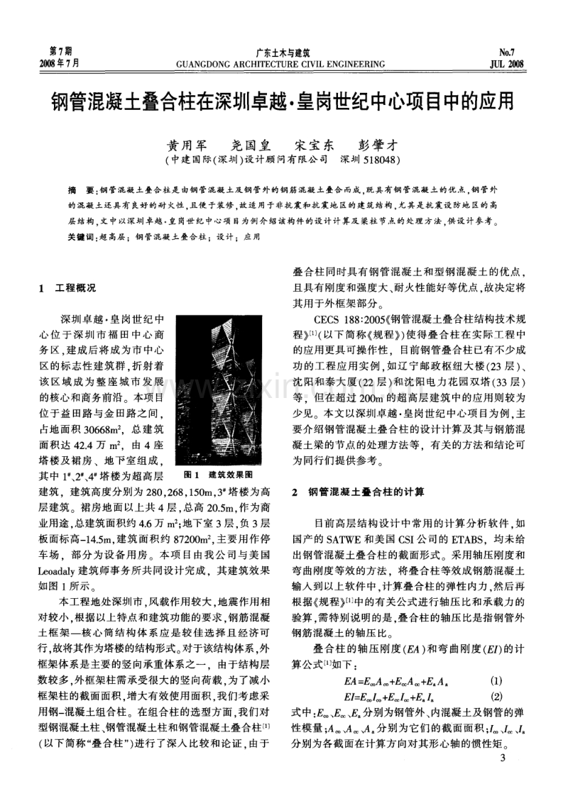 第7 期 2 0 0 8 年7 月 广东土 木与 建筑 GUANCD0NG ARCHI T E C TU RE C I VI L E NGI NE ERI NG 卜 . 7 J U L 2 O 0 8 钢管混凝土叠合柱在深圳卓越 皇岗世纪中心项目中的应用 黄用军 尧 国皇 宋宝 东 彭肇 才 ( 中建国际( 深圳) 设计顾 问有限公 司 ~ -,Y - N 5 1 8 0 4 8 ) 摘 要 : 钢 管混凝土 叠合柱是 由钢 管混凝土及钢管外的钢 筋混凝土叠合 而成 , 既具有钢管混凝土的优点 , 钢 管外 的混凝土还具有 良好 的耐 火性 , . I k 4 ~ . _ -T - 装修 , 故适 用于非抗震和抗震地 区的建筑结构 , 尤其是抗震设 防地 区的高 层 结构 , 文 中以深圳卓越 皇岗世 纪中心 项 目为例介 绍该构件的设计计算及梁柱节点的处理方 法, 供设计参 考。 关键词 : 超 高层 ;钢管混凝土叠合柱 ;设计 ;应用 1工程概 况 深圳卓越 皇岗世纪中 心 位 于 深 圳 市 福 田 中心 商 务区 . 建成后将成为市中心 区的标志性建筑群 . 折射着 该 区域成 为整 座城市 发展 的核心和商务前沿 本项 目 位于益 田路 与金 田路之间 . 占地面积 3 0 6 6 8 m 2 .总建筑 面积 达 4 2 . 4万 m . 由 4座 塔楼及裙房 、地下室组成 。 其 中 1 、 2 、 4 塔楼为超高层 图1 建筑效果图 建筑 ,建筑高度分别为 2 8 0 。 2 6 8 , 1 5 0 m, 3 塔楼为高 层建筑。裙房地面以上共 4层 , 总高 2 0 . 5 m. 作为商 业用 途 . 总建筑 面积约 4 . 6万 m 2 : 地下 室 3层 , 负 3 层 板面标高一 1 4 . 5 m. 建筑面积约 8 7 2 0 0 m 2 . 主要用作停 车场 .部分为设备用房 。本项 目由我公司与美 国 L e o a d a l v 建筑师事务所共 同设计完成 .其建筑效果 如图 1 所示 。 本工程地处深圳市. 风载作用较大. 地震作用相 对较小 . 根据 以上特点和建筑功能的要求 . 钢筋混凝 土框 架 一 核 心 筒 结 构 体 系 应 是 较 佳 选 择 且 经 济 可 行 , 故将其作为塔楼的结构形式。 对于该结构体系, 外 框架体系是主要的竖 向承重体系之一.由于结构层 数较多 , 外框架柱需承受很大的竖向荷载. 为了减小 框架柱的截面面积 。 增大有效使用面积 . 我们考虑采 用钢一 混凝土组合柱。在组合柱的选型方面. 我们对 型钢混凝土柱 、 钢管混凝土柱和钢管混凝土叠合柱『 1 _ ( 以下简称“ 叠合柱” ) 进行了深入 比较和论证 . 由于 叠合柱同时具有钢管混凝 土和型钢混凝土的优点 , 且具有刚度和强度大 、 耐火性能好等优点 . 故决定将 其用于外框架部分 C E C S 1 8 8 : 2 0 0 5 (( 钢管混凝土叠合柱结构技术规 程》 ⋯( 以下简称《 规程》 ) 使得叠合柱在实际工程中 的应用更具可操作性 .目前钢管叠合柱已有不少成 功 的工程应用实例 , 如辽宁邮政枢纽大楼( 2 3层 ) 、 沈 阳和泰大厦( 2 2层 ) 和沈 阳电力花 园双塔 ( 3 3层) 等 .但在超过 2 0 0 m的超高层建筑中的应用则较为 少见。本文 以深圳卓越 皇岗世纪中心项 目为例 . 主 要介绍钢管混凝土叠合柱的设计计算及其与钢筋混 凝土梁的节点的处理方法等 .有关的方法和结论可 为同行们提供参考 2钢管 混凝 土叠 合柱 的计算 目前高层结构设计中常用 的计算分析软件 . 如 国产 的 S A T WE和美国 C S I 公司的 E T A B S 。均未给 出钢管混凝土叠合柱 的截面形式。采用轴压刚度和 弯 曲刚度等效的方法 .将叠合柱等效成钢筋混凝土 输入到以上软件 中. 计算叠合柱的弹性内力 . 然后再 根据《 规程》 ] 中的有关公式进行轴压比和承载力的 验算 。 需特别说明的是 . 叠合柱的轴压 比是指钢管外 钢 筋混凝 土 的轴压 比 叠合柱 的轴压 刚度 ( ) 和弯曲刚度 ( E I ) 的计 算公式⋯如下 : E A= A 。 。 + A + E A ( 1 ) EI = E l + E I + Ea l a 2 1 式中: 、 、 E分别为钢管外、 内混凝土及钢管的弹 性模量 ; A —A 、 A 分别为它们的截面面积 ; 、 、 , a 分别为各截面在计算方向对其形心轴的惯性矩 3 2 0 0 8 年7 月 第7 期 黄 用军等: 钢管混 凝土 叠合 柱在深 圳卓 越 i/::1 P qt.1a , L 、 的应 用 J U L 2 0 0 8 N o . 7 在叠合柱钢管截面计 f 靳 6. 3. 5 喜 l I l 条 有 关 叠 合 柱 中 含 管 一I 茗 霎 纂 柔 曼j i 限 值 要 求 , 本 工 程 叠 合 柱 } } } 的典型截 面配筋 如 图 2 ’I 1枷 I 本工 程 由于 建 筑 功 能 图2 典型的叠合柱 的要求 .还 出现了很多钢 截面配筋 管混凝土叠合柱跨层柱 . 一般计算程序在整体结构 计算时. 对跨层柱的分析不太准确 为了更清楚地 了解钢管混凝土叠合柱跨层柱的工作性能并更合理 地 设计 这类 构 件 . 我们 采用 大 型 的商用 有 限元 软 件 A B A Q U S 6 . 7对这类构件 的工作性能进行全过程非 线性分析, 具体分析过程参见文献『 2 ] 根据 有 限元 计算 获得 的典 型 的钢管混凝 土叠 合 柱跨层柱承载力的全过程曲线( 略 ) . 可见相对于弹 性大震时对应的竖向荷载 . 钢管混凝土叠合柱跨层 柱具有较充裕 的安全储备 . 且超过极限承载力后仍 具有较好的后期延性 同时我们也关注到对应的 钢 管混 凝土叠 合柱 中钢 筋 、钢管 的 M i s e s 屈服 应 力 和 钢管 内核 心混 凝 土沿 中线 剖 面 的纵 向应 力 . 对结 构设 计起 到 了很 好 的指导作用 3叠合柱 节点 设计 叠合柱节点的设计应符合传力明确、 构造简单 、 整体性好 、 安全可靠 、 节约材料和施工方便的原则 , 《 规程》 中提供了几种钢管混凝土叠合柱与钢筋混凝 土梁节点的处理方法 . 但施工上略显复杂 本工程 根据 钢 筋混凝 土梁 的实 际配 筋 . 开创 性 地在 钢 管上 开 矩形 孑 L 洞 使梁 中纵 向钢筋 可 以顺 利通 过 ( 