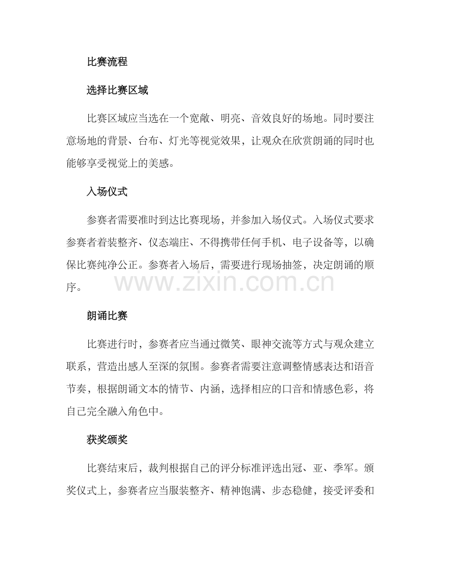 比赛区域应当选在一个宽敞、明亮、音效良好的场地。同时要注意场地的背景、台布、灯光等视觉效果,让观众在欣赏朗诵的同时也能够享受视觉上的美感。