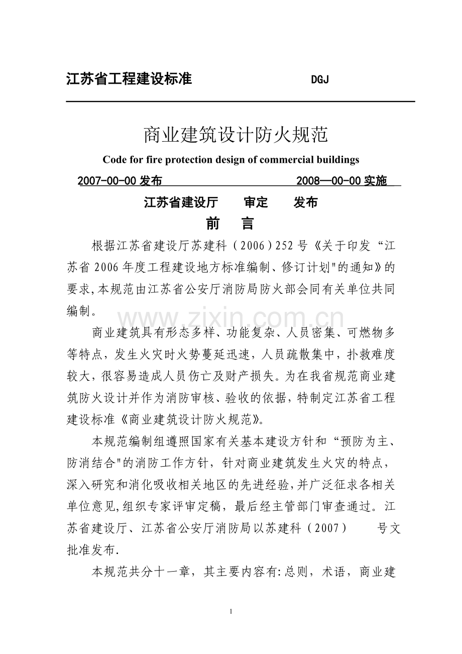 本规范编制组遵照国家有关基本建设方针和“预防为主、防消结合"的消防工作方针,针对商业建筑发生火灾的特点,深入研究和消化吸收相关地区的先进经验,并广泛征求各相关单位意见,组织专家评审定稿,最后经主管部门审查通过。江苏省建设厅、江苏省公安厅消防局以苏建科(2007) 号文批准发布.