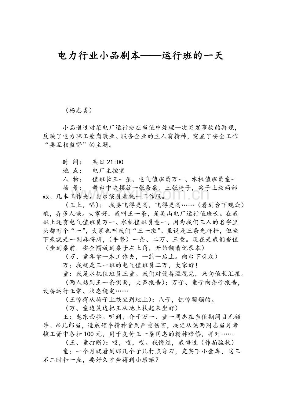 电力行业小品剧本——运行班的一天