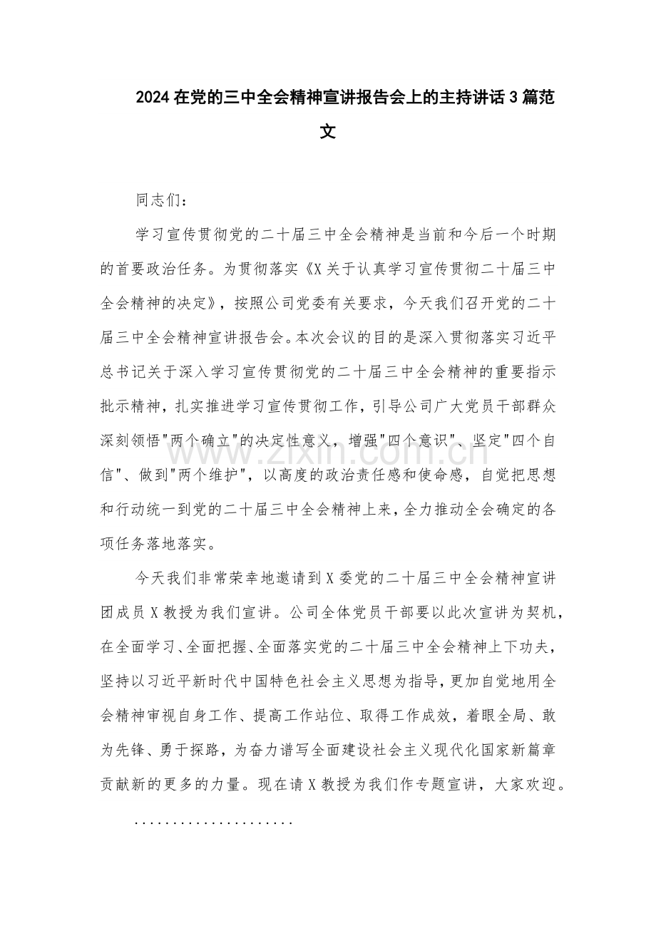 2024在党的三中全会精神宣讲报告会上的主持讲话3篇范文