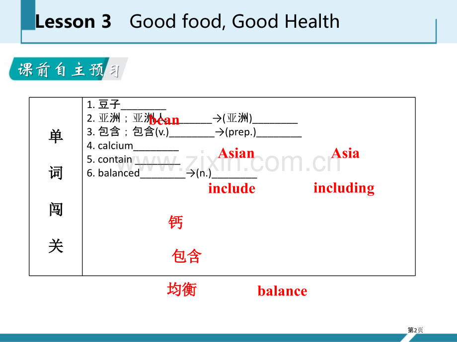 Good Food,Good HealthUnit 1 Stay Healthy第1页课前自主预习课前自主预习Lesson 3Good food,Good Health单单词词闯闯关关1.豆子_2.亚洲;亚洲人_(亚洲)_3.包含;包含(v.)_(prep.)_4.calcium_5.contain _6.balanced_(n.)_ beanAsianAsiaincludeincluding钙钙包含包含均衡均衡balance第2页短短语语互互译译1.由由制成制成_2.保持健康保持健康_3.富含富含_ 4.充满了充满了_5.均衡饮食均衡饮食_be made ofstay/keep healthybe rich inbe full ofa balanced dietLesson 3Good food,Good Health第3页 短短语语互互译译6.in ones opinion _7.Western countries _8.at last _9.at least _10.bean products _西方国家西方国家最终最终最少最少豆制品豆制品/豆类制品豆类制品Lesson 3Good food,Good Health在某人看来在某人看来第4页句句型型在在线线1.早餐麦片粥也是由不一样谷物制成。Breakfast cereal _ also _ _ differentgrains.2.沙拉在西方国家非常流行。Salads _ very _ _ Western countries.made are inis ofpopularLesson 3Good food,Good Health第5页句句型型在在线线3.钙使你骨骼和牙齿健壮。Calcium _ your bones and teeth _4.均衡饮食将会使你保持健康并给你提供许多能量!A balanced diet will _ _ _ and give you lots of energy!makeshealthystrong keepyouLesson 3Good food,Good Health第6页课堂互动探究课堂互动探究词汇点睛词汇点睛 1Asian adj.亚洲亚洲n.亚洲人亚洲人观察观察 In China and other East Asian countries,people often eat tofu and other bean products.在中国和其它东亚国家,人们经常吃豆腐和其它豆制品。在中国和其它东亚国家,人们经常吃豆腐和其它豆制品。He is an Asian.他是亚洲人。他是亚洲人。Lesson 3Good food,Good Health第7页探究探究 Asian用作用作_词时,意为词时,意为“亚洲亚洲”,常位于,常位于_词前作定语;它还能够用作词前作定语;它还能够用作_词,意为词,意为“亚洲人亚洲人”,其复数形式为,其复数形式为Asians。形容形容名名名名Lesson 3Good food,Good Health拓展拓展 常见洲名、该洲人及其形容词形式:常见洲名、该洲人及其形容词形式:Asia亚洲亚洲Asian亚洲人;亚洲(人)Europe欧洲欧洲European欧洲人;欧洲(人)Africa非洲非洲African非洲人;非洲(人)America美洲美洲American美洲人;美洲(人)第8页Lesson 3Good food,Good Health注意注意 以以n结尾某个大洲人或某国人,其复数结尾某个大洲人或某国人,其复数形式通常直接加形式通常直接加s。如:。如:three Europeans三个欧洲人,三个欧洲人,five Australian 五个澳大利亚人。五个澳大利亚人。第9页活学活用活学活用 1(1)Last year we went to Egypt,but this summer we are going to visit an _(亚洲亚洲)country.(2)There are five _(Asian)in their school.AsianLesson 3Good food,Good HealthAsians第10页2include v.包含;包含包含;包含观察观察 A wellbalanced diet includes foods from each food group.均衡饮食包含来自不一样食物群中食物。均衡饮食包含来自不一样食物群中食物。He sang four pop songs,including an English song.他唱了四首流行歌曲,包含一首英文歌。他唱了四首流行歌曲,包含一首英文歌。Lesson 3Good food,Good Health第11页Lesson 3Good food,Good Health探究探究表示表示include 为为_词,常在句中作谓语动词;词,常在句中作谓语动词;including为为_词,其前加逗号与前面内容隔开,词,其前加逗号与前面内容隔开,惯用在主语、宾语等之后,起补充说明作用。惯用在主语、宾语等之后,起补充说明作用。动动介介第12页2Many cities in China,_ Beijing,have been deeply affected by dirty air.Aincluding Bbehind Cwithout DbeyondALesson 3Good food,Good Health第13页句型透视句型透视1Breakfast cereal is also made of different grains.早餐麦片粥也是由不一样谷物制成。早餐麦片粥也是由不一样谷物制成。Lesson 3Good food,Good Health第14页 探究探究 be made of 意为意为“_”,指从原料到成品,指从原料到成品,只发生了形状改变,属于只发生了形状改变,属于_改变;改变;be made from 意为意为“由由制成制成”,指从原料到成品,发生了本质改变,属于化学指从原料到成品,发生了本质改变,属于化学改变;改变;be made in 后接表示地点词,表示某物产自某地;后接表示地点词,表示某物产自某地;be made by 后面接表示人名词或代词,强调动作执行者。后面接表示人名词或代词,强调动作执行者。由由制成制成物理物理Lesson 3Good food,Good Health第15页 图解助记图解助记 拓展拓展 be made up of 表示表示“由由组成组成(组成组成)”,强调主语由强调主语由两部分或两部分以上组成或组成。两部分或两部分以上组成或组成。The group is made up of five members.这组由这组由5个组员组成。个组员组成。Lesson 3Good food,Good Health第16页活学活用活学活用 1用适当介词或副词填空用适当介词或副词填空(1)The desk is made _ wood.(2)Paper is made_ wood.(3)The machines were made _ the workers.(4)This kind of watch is made _ Shanghai.offrombyLesson 3Good food,Good Healthin第17页2Salads are very popular in Western countries.沙拉在西方国家非常流行。沙拉在西方国家非常流行。Lesson 3Good food,Good Health第18页 探究探究 popular 为为_词,意为词,意为“流行,受欢迎流行,受欢迎”;“受某人欢迎受某人欢迎”能够用能够用_表示。表示。The actor is popular with young students.这名演员受年轻学生欢迎。这名演员受年轻学生欢迎。Computer games are popular among young people.电脑游戏受年轻人欢迎。电脑游戏受年轻人欢迎。Lesson 3Good food,Good Health形容形容be popular with/among sb.第19页2(1)Shopping on the Internet has become more and more p_ in our life.opularLesson 3Good food,Good Health第20