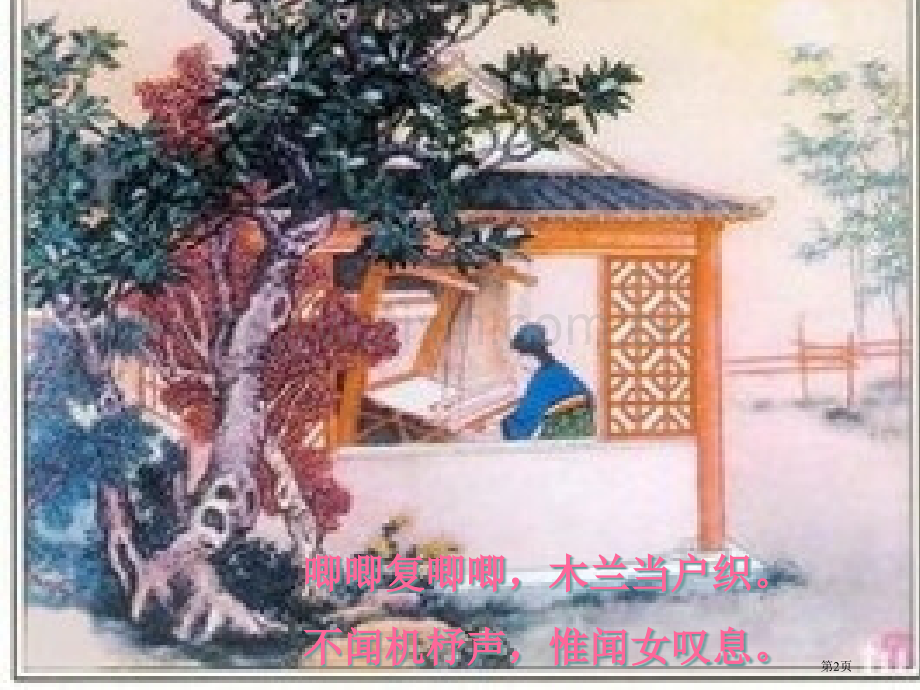 唧唧复唧唧,木兰当户织。唧唧复唧唧,木兰当户织。不闻机杼声,惟闻女叹息。不闻机杼声,惟闻女叹息。木兰诗木兰诗第1页 木兰诗木兰诗唧唧复唧唧,木兰当户织。唧唧复唧唧,木兰当户织。不闻机杼声,惟闻女叹息。不闻机杼声,惟闻女叹息。第2页问女何所思,问女何所忆。问女何所思,问女何所忆。女亦无所思,女亦无所忆。女亦无所思,女亦无所忆。第3页昨夜军贴,可汗大点兵,昨夜军贴,可汗大点兵,军书十二卷,卷卷有爷名。军书十二卷,卷卷有爷名。第4页阿爷无大儿,木兰无长兄,阿爷无大儿,木兰无长兄,愿为市鞍马,从此替爷征。愿为市鞍马,从此替爷征。第5页东市买骏马,西市买鞍鞯,东市买骏马,西市买鞍鞯,南市买辔头,北市买长鞭。南市买辔头,北市买长鞭。第6页旦辞爷娘去,暮宿黄河边,旦辞爷娘去,暮宿黄河边,旦辞爷娘去,暮宿黄河边,旦辞爷娘去,暮宿黄河边,不闻爷娘唤女声,但闻黄河流水鸣溅溅。不闻爷娘唤女声,但闻黄河流水鸣溅溅。不闻爷娘唤女声,但闻黄河流水鸣溅溅。不闻爷娘唤女声,但闻黄河流水鸣溅溅。第7页旦辞黄河去,暮宿黑山头,旦辞黄河去,暮宿黑山头,旦辞黄河去,暮宿黑山头,旦辞黄河去,暮宿黑山头,不闻爷娘唤女声,但闻燕山胡骑鸣啾啾。不闻爷娘唤女声,但闻燕山胡骑鸣啾啾。不闻爷娘唤女声,但闻燕山胡骑鸣啾啾。不闻爷娘唤女声,但闻燕山胡骑鸣啾啾。第8页万里赴戎机,关山度若飞。万里赴戎机,关山度若飞。朔气传金柝,寒光照铁衣。朔气传金柝,寒光照铁衣。第9页将军百战死,壮士十年归。将军百战死,壮士十年归。归来见天子,天子坐明堂。归来见天子,天子坐明堂。第10页 可汗问所欲,木兰不用尚书郎。可汗问所欲,木兰不用尚书郎。愿驰千里足,送儿还故乡。愿驰千里足,送儿还故乡。第11页爷娘闻女来,出郭相扶将;爷娘闻女来,出郭相扶将;阿姊闻妹来,当户理红妆;阿姊闻妹来,当户理红妆;小弟闻姊来,磨刀霍霍向猪羊。小弟闻姊来,磨刀霍霍向猪羊。第12页/帖帖帖帖开我东阁门,坐我西阁床,开我东阁门,坐我西阁床,脱我战时袍,著我旧时裳,脱我战时袍,著我旧时裳,当窗理云鬓,对镜帖花黄。当窗理云鬓,对镜帖花黄。第13页出门看搭档,搭档皆惊惶:出门看搭档,搭档皆惊惶:同行十二年,不知木兰是女郎。同行十二年,不知木兰是女郎。第14页雄兔脚扑朔,雌兔眼迷离;雄兔脚扑朔,雌兔眼迷离;双兔傍地走,安能辨我是雄雌?双兔傍地走,安能辨我是雄雌?第15页