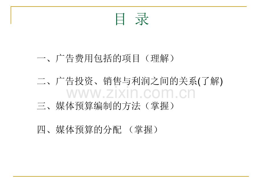 第 13章 广告媒体预算编制和分配目 录一、广告费用包括的项目(理解)二、广告投资、销售与利润之间的关系(了解)三、媒体预算编制的方法(掌握)四、媒体预算的分配(掌握)一、广告费用包括的项目n制定广告预算的传统方法回顾q销售额百分比关键找出这个百分比(与利润、定价等有关)q竞争性支出q目标和任务根据营销目标或广告目标q每单位支出根据销售单位来确定q主观性预算q试验调查法q分类主要费用 可作为广告费用的开支购买广告媒体及其他广告的费用 四大传统媒体,户外,POP,直邮,商品目录,宣传小册子,电影,幻灯,交通广告等管理费用广告部门有关人员的工资,办公费用,付给广告代理和制作者以及顾问的手续费,差旅费广告制作费美术设计,文字编辑,印刷制版,纸型,照相,摄像,录音,包装设计等可作也可不作广告费用的开支样品费,示范费,客户访问,推销表演费,商品展览费,广告部门的存货减价处理费,研究及调查费,推销费,广告协会和广告团体费用不能作为广告费的开支免费赠品,社会慈善,宗教,捐献品和费用,旅游费,包装费,新闻宣传员的酬金,接待费,工作人员的生活福利广告费用一览表80%的广告预算都用于媒体二、广告投资、销售与利润之间的关系10305070广告投资持续成长1020304050周销售对广告反应在投资初期成较大成长,中期以后成长率将下降;当成长到某种极限,即停止成长品牌在广告较低投资,销售较大成长阶段呈现获利;当销售成长达到极限,持续的投资终将使利润衰退到亏本程度三、媒体预算编制的方法n1、媒体投资占有率/市场占有率,即SOV/SOMq从市场占有率的角度去制定媒体投资占有率,然后计算所需预算qSOV(Share of Voice):媒体投资占有率(品牌投资额/品类投资额)qSOM(Share of Market):市场占有率(品牌销售量/品类销售量)q基本假设:n媒体投资占有率与市场占有率成正相关n各品牌在营销上的条件(4P)大致相当n各品牌在媒体预算运用效率上大致相等n各品牌广告与促销的运用上没有显著差异 q什么时候应用这种方法?n以竞争对手为导向 qX/(A+X):B=CqEg.汰渍洗衣粉A=1000万,B=25%求C在不同值下的X值竞争品牌媒体投资量本品牌设定的市场占有率目标常数:0.6-1.8之间C值X值C值X值0.81.20.91.31.01.41.11.5qC值取多大才好呢?声音要不要大于平均水平?q受到以下因素影响n新/旧品牌影响n品牌占有率n品牌企图进攻或防守n品牌目前形象地位n竞争品牌激烈程度n品牌忠诚度在进攻或防守态势情况下不同n广告对销售的影响程度n购买周期n2、GRP方法q这种方式根据消费者对广告讯息认知所需要的媒体传播量,再将传播量换算成金额,得出媒体所需预算。q基本假设n媒体露出使消费者对广告讯息产生认知,进而产生品牌知名度n知名度使品牌进入消费者选择名单,进而促进品牌销售和市场占有率至下而上q预算设定的步骤(1)设定到达率和接触频率:根据营销因素、创意因素和媒体因素等而设定。(2)制定有效到达率:根据品牌市场占有率目标,需要加以放大,因为从完全认知品牌到购买还有段距离。(3)计算GRPs:根据目标消费者的媒体接触习惯及收视率资料,根据有效到达率计算GRPs。(4)计算CPRP或CPM:根据各市场媒体价格和收视率,计算出CPRP(5)预算=GRPs*CPRP(6)全国的预算=加总全国所有市场的预算n3、媒体投资/销售的比值方式q完全从销售的产出角度制定各市场的媒体投资预算q基本假设:n比值大,市场产出较佳,代表该市场具有开发潜力n比值小,市场产出不佳,代表该市场的开发潜力有限q操作程序(1)计算各市场品类的投资比值:A=整体品类的媒体投资额/销售量(2)计算前5个品牌的投资比值:B=前前5个品牌个品牌的媒体投资额/销售量(3)为本品牌设定一个投资比值C:在AB之间,依营销态势而定(4)计算各市场的媒体预算:销售目标*C(5)计算全国的媒体预算:加总所有市场的媒体预算n以上三种方式的比较和总结SOV/SOMGRPsCapital/Sale优点n反映营销企图,与营销关连性强n竞争意义上作用强n操作简单n确保传播效果的达成n较客观,准确度较高n节约有限的预算n操作简单n符合企业营销行动的原则n符合各地区市场上营销的实际业绩缺点n忽略传播需要n在品类投资不足或过度投资时,可能导致预算不足或过度n忽略创意和媒体策略对效果的影响n不顾营销其它因素,可能偏离营销目标较忽略竞争对手n忽略销售现实,可能造成各市场投资比率偏离于销售比率n忽略各市场的营销条件差异n可能丧失市场开会机会n欠缺主导性,较被动角度n以竞争导向n传播效果为导向n以营销为导向n4、媒体预算的组合应用q4A广告公司对媒体预算将是因地制宜,采用多种方式的组合q无论是否用到量化数据,最后都需要根据各种因素进行主观判断q制定程序如下图:预算X预算Y预算Z竞争角度SOV/SOM传播角度GRPs法营销角度投资/销售的比值法是否有差异OK调整否是是否可行,确定预算范围四、媒体预算的分配n何时何地什么媒体策略,演化成如何在不同时,不同地,不同媒体之间分配预算1.按广告时间分配q按广告活动期限进行分配年度媒体预算分配,季度、月度媒体预算分配q按广告传播时机进行分配,旺季与淡季满足市场销售时机的要求q举例某洗发水媒体费用的年度分配年度年度2009年年2008年年2007年年总收入(百万元)26.419.237.2成本(百万元)15.411.221.7毛利润(包括促销与利润)11.08.015.5重新分配毛利润11.714.97.9用于广告和促销的预算n 用于广告(85%)n 用于