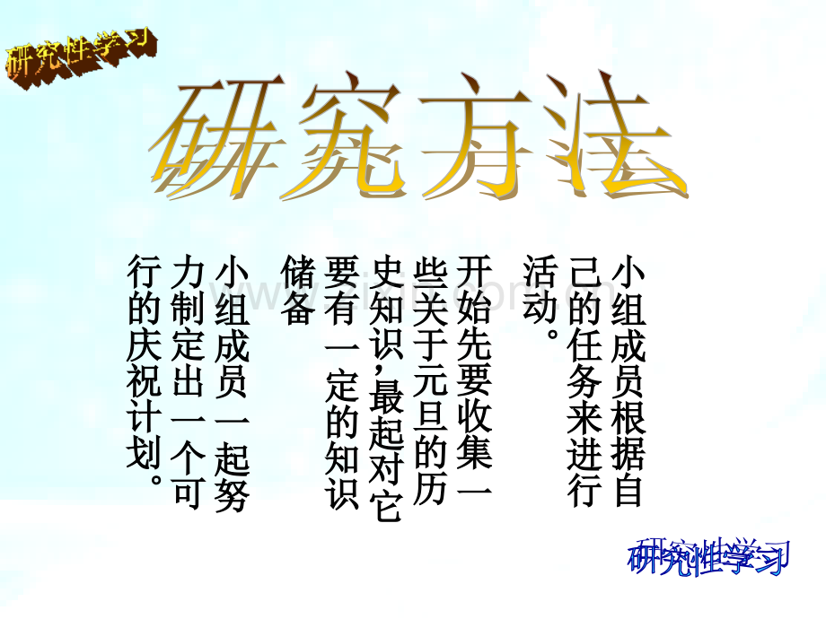 小小组组成成员员根根据据自自己己的的任任务务来来进进行行活活动动。开开始始先先要要收收集集一一些些关关于于元元旦旦的的历历史史知知识识,最最起起对对它它要要有有一一定定的的知知识识储储备备小小组组成成员员一一起起努努力力制制定定出出一一个个可可行行的的庆庆祝祝计计划划。研究任务:研究任务:1.朱旭:演讲以及策划活动2.宋欣悦:制作课件以及策划活动3.田宇.刘潇:做手抄报以及策划活动4.何娜.杜易.李浩天:做文章总结以及策划活动5.褚阳:总结报告6:赵凯.崔磊.孙绪民:查资料研究阶段:研究阶段:壹壹.元旦的了解元旦的了解贰贰.制定庆祝计划制定庆祝计划叁叁.修改深化修改深化肆肆.总结总结元旦是我们中华民族的传统习俗,元旦是我们中华民族的传统习俗,在这一天里,我们回顾过去,再去在这一天里,我们回顾过去,再去展望一下未来,对新的一年又一个展望一下未来,对新的一年又一个新的规划和向往。所以,在元旦将新的规划和向往。所以,在元旦将要到来之际我们组想要对元旦的庆要到来之际我们组想要对元旦的庆祝活动进行一个策划。祝活动进行一个策划。