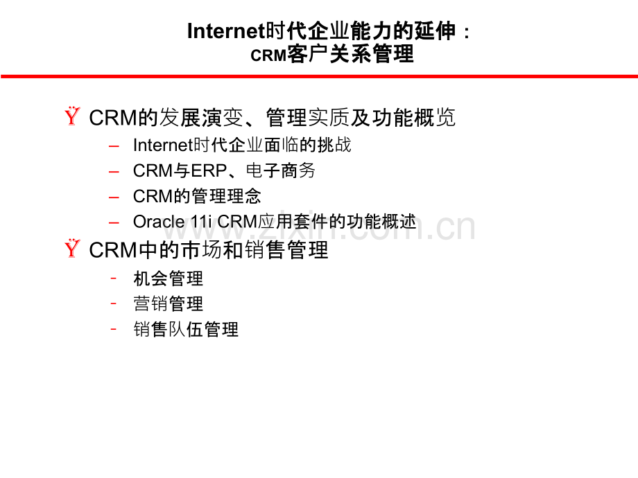 Internet时代企代企业能力的延伸:能力的延伸:CRM客客户关系管理关系管理CRM的发展演变、管理实质及功能概览Internet时代企业面临的挑战CRM与ERP、电子商务CRM的管理理念Oracle 11i CRM应用套件的功能概述CRM中的市场和销售管理机会管理营销管理销售队伍管理Internet时代企代企业能力的延伸:能力的延伸:CRM客客户关系管理关系管理CRM中的客户关怀和服务管理服务合同管理完备的服务解决方案客户关怀计划CRM中呼叫中心的功能特点CRM应用的实施基础和实施方法CRM软件供应商评价CRM解决方案的应用模式CRM的的发展演展演变、管理、管理实质及功能概及功能概览Internet时代企业面临的挑战CRM与ERP、电子商务CRM的管理理念Oracle 11i CRM应用套件的功能概述CRM的的历史史1997/8前端/ERPOracle Baan SAP1995软件包 销售队伍管理客户服务管理1990功能方案产品配置电话促销技术支持服务联系管理软件供件供应商的商的发展展趋势“由于用户更倾向于使用整套应用系统,即使是在ERP应用系统之外再采用1-2个其他的应用产品,企业也将得到更好的技术支持、价格折扣及集成性能。因此,对软件供应商而言,成为市场上的最佳产品将更为困难。”Judy Hodges IDC“去集成众多软件供应商的应用产品是非常困难和昂贵的,企业发现可以从套件供应商这里以较低的成本获得他们所需要的那些较好的应用,而非采用一系列的最佳应用产品。”Gartner“企业为了实施客户关系管理系统,只得将多个供应商的应用软件组合在一起,并支付2-3倍于软件使用费的顾问成本去完成这些系统之间的集成工作。”Michael Moaz-GartnerInternet时代企代企业面面临的挑的挑战?花费了2M$用于市场促销活动,有多少回报?每天从网上获得较多的反馈,但谁是潜在的客户?能否及时得到所有45个国家560个办事处的销售预测数据?如何有效地管理分销渠道?是否支付给销售代表和零售商应得的报酬?如何快速准确的解决客户的问题?如何指派恰当的工程师?如何经济高效地运用电话、网络保持与客户的沟通?是否确信通过所有的渠道获得一致的信息?如何将互联网应用同企业后台应用保持集成?如何通过业务数据发现获利点?.企企业成功的关成功的关键要素要素产品和服务销售和销售渠道客户管理*市场*产品和服务的创新*销售渠道管理*高效的销售组织体系*针对群体分类的客户关系管理持 续 的 利 润 增 长财务制造*物流、资金流的内部优化来自来自权威研究机构的信息威研究机构的信息通过研究客户交互的资料发现,50-60%的客户对企业而言是非赢利性的,同时那些消耗了企业60%-80%的售后支援资源的客户提供的利润仅占不足20%.AMR Research获取一个新客户的销售成本比向企业的现有客户销售要高6-10倍,企业已经认识到这些老客户的价值。客户关系管理能够帮助企业更好地认识客户群体和易流动性。.美国企业每5年就流失一半以上的客户.Harvard Business Review60%以上的客户流失的原因是由较差的服务引起的,只有13%的客户是因产品方面的原因而流失.Michaelson&AssociatesThe Internet Changes Everything不不仅仅是技是技术上的上的变革革更是一种新型的更是一种新型的业务模式模式互互联网正在改网正在改变一切一切未来将在互未来将在互联网上展开网上展开新一新一轮的的竞争争 分分类的客的客户关系管理关系管理 高度集成的、高效的高度集成的、高效的业务流程流程 信息信息驱动的企的企业战略管理略管理电子商子商务模式的模式的雏形形E M P L O Y E E SE M P L O Y E E S 公司雇员公司雇员公司雇员公司雇员定单定单传真传真供应商供应商供应商供应商合作伙伴合作伙伴合作伙伴合作伙伴ERPERP应用系统应用系统应用系统应用系统网上商店网上商店网上商店网上商店客户客户电子商子商务蓝图直接销售直接销售直接销售直接销售网上商店网上商店网上商店网上商店PortalPortalPortalPortal卖方卖方卖方卖方客客客客 户户户户供应商供应商供应商供应商贸易伙伴贸易伙伴贸易伙伴贸易伙伴客户服务客户服务客户服务客户服务呼叫中心呼叫中心呼叫中心呼叫中心ERPERPERPERP企业资源计划企业资源计划企业资源计划企业资源计划财务、制造等财务、制造等财务、制造等财务、制造等自助式服务自助式服务自助式服务自助式服务业务智能系统业务智能系统业务智能系统业务智能系统服务供应商服务供应商服务供应商服务供应商PortalPortalPortalPortal买方买方买方买方供供供供 应应应应 商商商商企企企企 业业业业 雇雇雇雇 员员员员CRM CRM CRM CRM 应用产品应用产品应用产品应用产品SCM SCM SCM SCM 应用产品应用产品应用产品应用产品CRM的管理理念的管理理念 Thinking Customer-想客想客户所想所想客客户就是上帝就是上帝了解客户越多,您就越能更好地开展市场营销活动创造更多的销售机会和收入提供更具竞争力的服务A请关注客户智能CRM的管理理念的管理理念 Thinking Yourself 了解自己了解自己战略上关注企业的现状和未来发展商业模式市场营销服务技术手段战术上关注:计划 执行 评估 改进CRM的管理理念的管理理念 Think Web First 首先想到互首先想到互联网网首先想到互首先想到互联网网国际化的需要较低的成本广度覆盖不不仅仅只想到互只想到互联网网电话邮件直接合作伙伴A 让您的客户方便的找到您CRM的管理理念的管理理念 Thinking Collaboration 