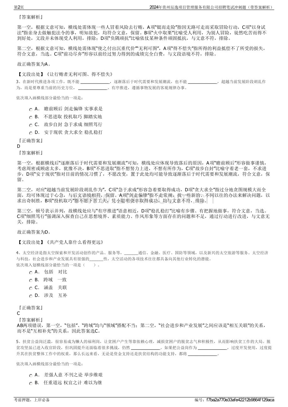 2024年贵州辰逸项目管理服务有限公司招聘笔试冲刺题(带答案解析)【下载须知】:1,本套练习包含以下题型:言语理解与表达题、常识判断题、数量关系题、判断推理题和资料分析题等题型;共135道。2、本套试题根据常见招考题总结归纳,主要用于练习答题思路和拓展知识面。3、本套试题非考试真题,且与贵州辰逸项目管理服务有限公司无关。一、第一部分言语理解与表达(本部分包括表达与理解两方面的内容。请根据题目要求,在四个选项中选出一个最恰当的答案。)1、博物馆本是征集、典藏、陈列和研究代表自然和人类文化遗产的实物的场所,它为观众提供的是知晓、教育和欣赏功能。当我们教育孩子不应把博物馆当游乐场时,更应该 _ 自身是否遵守了公共场合的文明礼仪。孩子往往将家长当作学习的“_”,如果家长行为不够文明、尤其是对孩子的不文明行为纵容,那孩子自然也无法学到文明礼仪。说到底,博物馆礼仪根植在社会整体文明的基础上,是 _社会文明程度的一个窗口。依次填入画横线处最恰当的一项是:A 检视 圭臬 强化 B 注意 准绳 预测 C 反思 样本 窥见 D 回溯 榜样 了解正确答案C答案解析第一空,分析文意可知,横线处表示家长应该思考自身是否遵守了公共场合的文明礼仪,A项“检视”指检验查看,B项“注意”指留意、关注,C项“反思”指反过来思考,均符合文意,保留。D项“回溯”指向上推导,追求根源,一般搭配历史或过去,与“自身”搭配不当,排除。第二空,不易判断。第三空,根据“窗口”可知,由博物馆礼仪可以看出社会整体的文明程度,C项“窥见”指暗中看出或觉察到,看破,觉察,符合文意,当选。A项“强化”指加强,使坚强巩固,与“程度”搭配不当,排除;B项“预测”指预先测定或推测,文段未体现将来式,且无法与“窗口”对应,排除。故正确答案为C。【文段出处】博物馆不是游乐场2、行贿方式呈隐蔽化、多样化、长线化和组织化等特点,一些人 _,正是因为所获回报远远超出行贿投入。加大惩治力度,就要完善对重点行贿人的联合惩戒机制,使之付出沉重代价。综合运用纪律、法律、行政、经济手段,打出联合惩戒“组合拳”,才能有效提高违法成本,让行贿者无利可图、_。依次填入画横线部分最恰当的一项是:A 铤而走险 得不偿失 B 火中取栗 血本无归 C 以身试法 前功尽弃 D 负隅顽抗 事与愿违正确答案A第1页2024年贵州辰逸项目管理服务有限公司招聘笔试冲刺题(带答案解析)考前押题,上岸必备编号:f7ba2a770e33afe42212b9864f129aca答案解析第一空,根据文意可知,横线处需体现一些人冒着风险去行贿,A项“铤而走险”指因无路可走而采取冒险行动,C项“以身试法”指亲身去做触犯法令的事,明知故犯,均符合文意,保留。B项“火中取栗”比喻受人利用,为别人冒险,徒然吃苦而得不到好处,文段并未体现受人利用,排除;D项“负隅顽抗”比喻依仗某种条件顽固抵抗,与文意不符,排除。第二空,根据文意可知,横线处需体现“使之付出沉重代价”“无利可图”,A项“得不偿失”指所得的利益抵偿不了所受的损失,符合文意,当选。C项“前功尽弃”形容以前经过努力得到的成绩完全白费,与文段语境不符,排除。故正确答案为A。【文段出处】让行贿者无利可图、得不偿失3、在新时代推进各项工作,既不能 _,逐渐落后于时代需要和发展潮流,也不能 _,超越当前发展阶段胡乱作为,而是要尊重当前的历史方位,_、有序推进,遵循事物发展的客观规律办事。依次填入画横线部分最恰当的一项是:A 瞻前顾后 剑走偏锋 实事求是 B 不思进取 投机取巧 脚踏实地 C 故步自封 急于求成 细照笃行 D 安于现状 贪大求全 稳扎稳打正确答案D答案解析第一空,根据横线后“逐渐落后于时代需要和发展潮流”可知,横线处应体现导致落后的原因,A项“瞻前顾后”形容做事谨慎,考虑周密或顾虑太多,犹豫不决,B项“不思进取”指不想努力上进,不想有所作为,C项“故步自封”比喻守着老一套,不求进步,D项“安于现状”指对目前的情况习惯了,不愿改变,置于此处均可能导致逐渐落后于时代需要和发展潮流,符合文意,保留。第二空,对应“超越当前发展阶段胡乱作为”,C项“急于求成”形容急着要取得成功,D项“贪大求全”指过分地贪图规模大而全面,均可体现过于心急,与后文语境相符,保留。A项“剑走偏锋”指不走常规,找一些新的、不同以往的办法来解决问题,以求出奇制胜,B项“投机取巧”指不愿下苦工夫,凭小聪明侥幸取得成功,均与文意不符,排除。第三空,顿号表示并列,故横线处应与“有序推进”语意相近,D项“稳扎稳打”比喻有步骤、有把握地做事,符合文意,当选。C项“细照笃行”强调深入探查自己在思想境界、素质能力、作风形象等方面存在的问题和不足,通过行动进行改进,与文意无关,排除。故正确答案为D。【文段出处】共产党人靠什么看得更远4、太空经济是指太空探索和开发活动创作的产品、服务等,_通信、金融、医疗、国防等领域,以及新兴的太空旅游等服务。太空经济与科技,社会进步和产业发展具有很强的_性,太空活动的各项技术往往都具备向其他行业转化的潜能。依次填入划横线部分最恰当的一项是()。A 包括对比 B 跨域一致 C 涵盖关联 D 涉及互补正确答案C答案解析AB两项错误,第一空,“包括”、“跨域”均与“领域”搭配不当;第二空,“社会