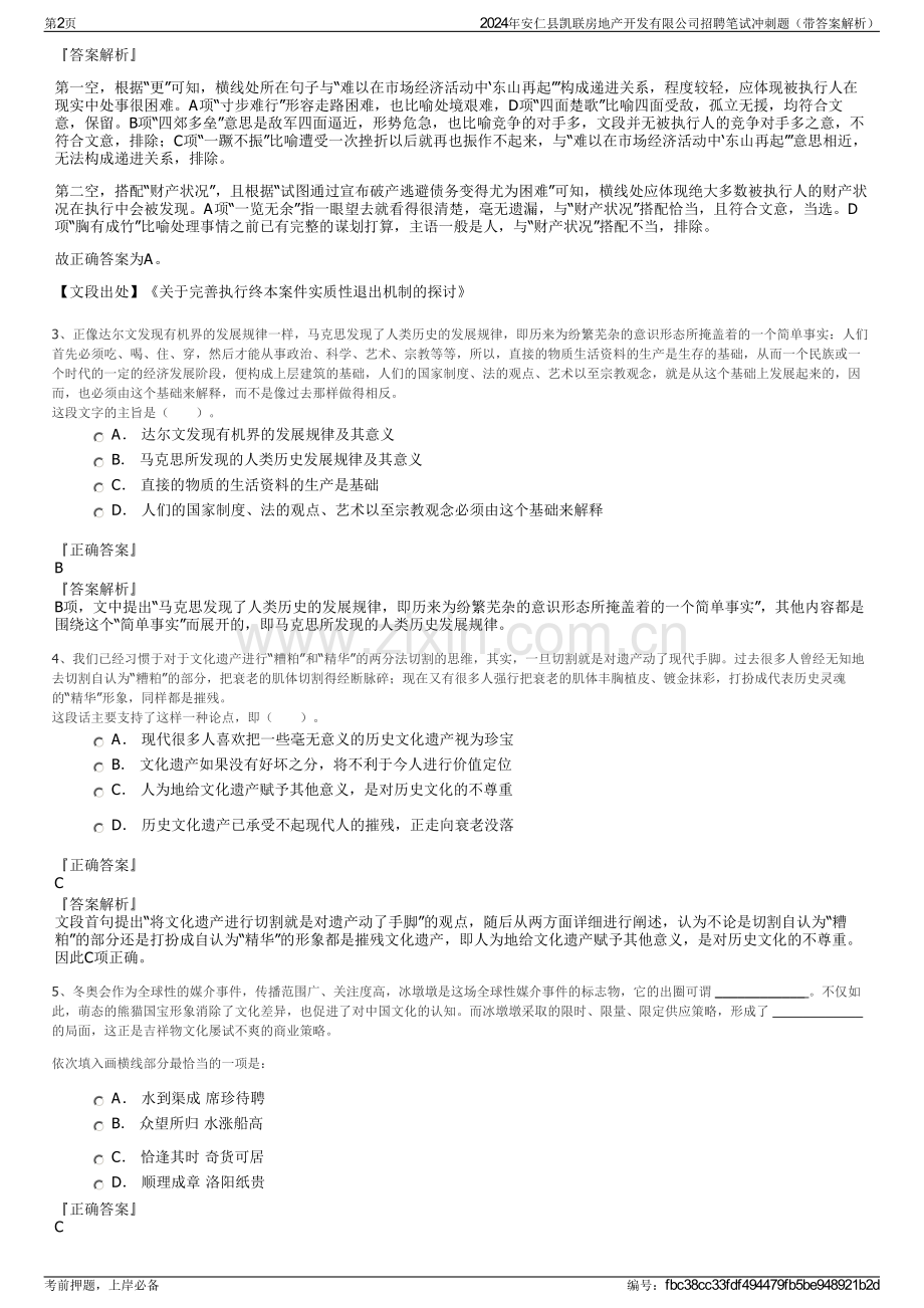2024年安仁县凯联房地产开发有限公司招聘笔试冲刺题(带答案解析)【下载须知】:1,本套练习包含以下题型:言语理解与表达题、常识判断题、数量关系题、判断推理题和资料分析题等题型;共135道。2、本套试题根据常见招考题总结归纳,主要用于练习答题思路和拓展知识面。3、本套试题非考试真题,且与安仁县凯联房地产开发有限公司无关。一、第一部分言语理解与表达(本部分包括表达与理解两方面的内容。请根据题目要求,在四个选项中选出一个最恰当的答案。)1、随着媒介技术快速发展,数字化交往空间开始重构城市与乡村的关系。人们对乡村的集体记忆和整体认知,不再 在实体的物理空间和生活场景中,新媒体产品折射出的乡味、野趣和新农村面貌等,了大众的乡村印象。依次填入划横线部分最恰当的一项是:A围绕 颠覆 B封闭 改变 C局限 重塑 D限制 反映正确答案C答案解析第一空,根据文意可知,人们对乡村的集体记忆和整体认知已超出了实体的物理空间和生活场景,横线前出现“不再”,故横线处表达在一定范围内之意,B项“封闭”指隔绝、使不能通行或随便打开,C项“局限”指限制在某个范围内,D项“限制”指不允许超过规定的范围,填入文段均符合文意,保留。A项“围绕”指以某个问题或事情为中心,围在周围转动,“围绕在中”置于此处用法错误,排除。第二空,根据文意可知,横线处表达新媒体产品使乡村印象发生了变化,且根据“数字化交往空间开始重构城市与乡村的关系”可知,这种变化是颠覆性的,程度较重。C项“重塑”指重新塑造,符合文意且程度较重,当选。B项“改变”指发生差别,程度过轻,无法与“重构”对应,排除;D项“反映”比喻把客观事物的实质表现出来,与文意无关,排除。故正确答案为C。【文段出处】人民日报海外版乡村生活短视频为啥走红?2、随着失信、限高等惩戒措施的推广使用,我国已初步形成信用社会。无法清偿债务而被法院终本的被执行人在现实中不仅“_”,更难以在市场经济活动中“东山再起”。另一方面,信息化查控手段的不断强化,使得绝大多数被执行人的财产状况在执行中 _,试图通过宣布破产逃避债务变得尤为困难。依次填入画横线部分最恰当的一项是:A 寸步难行 一览无余 B 四郊多垒 讳莫如深 C 一蹶不振 无所遁形 D 四面楚歌 胸有成竹正确答案A第1页2024年安仁县凯联房地产开发有限公司招聘笔试冲刺题(带答案解析)考前押题,上岸必备编号:fbc38cc33fdf494479fb5be948921b2d答案解析第一空,根据“更”可知,横线处所在句子与“难以在市场经济活动中东山再起”构成递进关系,程度较轻,应体现被执行人在现实中处事很困难。A项“寸步难行”形容走路困难,也比喻处境艰难,D项“四面楚歌”比喻四面受敌,孤立无援,均符合文意,保留。B项“四郊多垒”意思是敌军四面逼近,形势危急,也比喻竞争的对手多,文段并无被执行人的竞争对手多之意,不符合文意,排除;C项“一蹶不振”比喻遭受一次挫折以后就再也振作不起来,与“难以在市场经济活动中东山再起”意思相近,无法构成递进关系,排除。第二空,搭配“财产状况”,且根据“试图通过宣布破产逃避债务变得尤为困难”可知,横线处应体现绝大多数被执行人的财产状况在执行中会被发现。A项“一览无余”指一眼望去就看得很清楚,毫无遗漏,与“财产状况”搭配恰当,且符合文意,当选。D项“胸有成竹”比喻处理事情之前已有完整的谋划打算,主语一般是人,与“财产状况”搭配不当,排除。故正确答案为A。【文段出处】关于完善执行终本案件实质性退出机制的探讨3、正像达尔文发现有机界的发展规律一样,马克思发现了人类历史的发展规律,即历来为纷繁芜杂的意识形态所掩盖着的一个简单事实:人们首先必须吃、喝、住、穿,然后才能从事政治、科学、艺术、宗教等等,所以,直接的物质生活资料的生产是生存的基础,从而一个民族或一个时代的一定的经济发展阶段,便构成上层建筑的基础,人们的国家制度、法的观点、艺术以至宗教观念,就是从这个基础上发展起来的,因而,也必须由这个基础来解释,而不是像过去那样做得相反。这段文字的主旨是()。A 达尔文发现有机界的发展规律及其意义 B 马克思所发现的人类历史发展规律及其意义 C 直接的物质的生活资料的生产是基础 D 人们的国家制度、法的观点、艺术以至宗教观念必须由这个基础来解释正确答案B答案解析B项,文中提出“马克思发现了人类历史的发展规律,即历来为纷繁芜杂的意识形态所掩盖着的一个简单事实”,其他内容都是围绕这个“简单事实”而展开的,即马克思所发现的人类历史发展规律。4、我们已经习惯于对于文化遗产进行“糟粕”和“精华”的两分法切割的思维,其实,一旦切割就是对遗产动了现代手脚。过去很多人曾经无知地去切割自认为“糟粕”的部分,把衰老的肌体切割得经断脉碎;现在又有很多人强行把衰老的肌体丰胸植皮、镀金抹彩,打扮成代表历史灵魂的“精华”形象,同样都是摧残。这段话主要支持了这样一种论点,即()。A 现代很多人喜欢把一些毫无意义的历史文化遗产视为珍宝 B 文化遗产如果没有好坏之分,将不利于今人进行价值定位 C 人为地给文化遗产赋予其他意义,是对历史文化的不尊重 D 历史文化遗产已承受不起现代人的摧残,正走向衰老没落正确答案C答