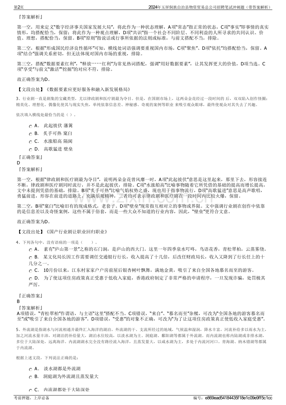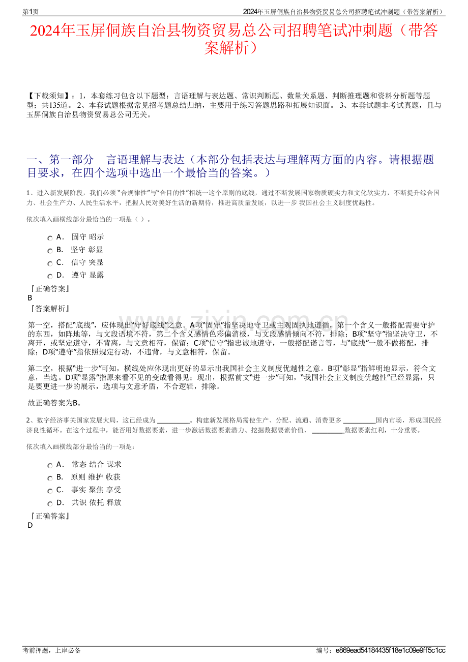2024年玉屏侗族自治县物资贸易总公司招聘笔试冲刺题(带答案解析)【下载须知】:1,本套练习包含以下题型:言语理解与表达题、常识判断题、数量关系题、判断推理题和资料分析题等题型;共135道。2、本套试题根据常见招考题总结归纳,主要用于练习答题思路和拓展知识面。3、本套试题非考试真题,且与玉屏侗族自治县物资贸易总公司无关。一、第一部分言语理解与表达(本部分包括表达与理解两方面的内容。请根据题目要求,在四个选项中选出一个最恰当的答案。)1、进入新发展阶段,我们必须“合规律性”与“合目的性”相统一这个原则的底线,通过不断发展国家物质硬实力和文化软实力,不断提升综合国力、社会生产力、人民生活水平,把握人民对美好生活的新期待,推进高质量发展,以进一步 我国社会主义制度优越性。依次填入画横线部分最恰当的一项是()。A 固守 昭示 B 坚守 彰显 C 信守 突显 D 遵守 显露正确答案B答案解析第一空,搭配“底线”,应体现出“守好底线”之意。A项“固守”指坚决地守卫或主观固执地遵循,第一个含义一般搭配需要守护的东西,如阵地等,与文段语境不符,第二个含义感情色彩偏消极,与文段感情倾向不符,排除;B项“坚守”指坚决守卫,不离开,或坚定遵守,不背离,与文意相符,保留;C项“信守”指忠诚地遵守,一般搭配诺言等,与“底线”一般不做搭配,排除;D项“遵守”指依照规定行动,不违背,与文意相符,保留。第二空,根据“进一步”可知,横线处应体现出更好的显示出我国社会主义制度优越性之意。B项“彰显”指鲜明地显示,符合文意,当选。D项“显露”指原来看不见的变成看得见;现出,根据前文“进一步”可知,“我国社会主义制度优越性”已经显露,只是要更进一步的展示,选项与文意矛盾,不合逻辑,排除。故正确答案为B。2、数字经济事关国家发展大局,这已经成为 _。构建新发展格局需使生产、分配、流通、消费更多 _ 国内市场,形成国民经济良性循环。在这个过程中,能否用好数据要素,进一步激活数据要素潜力、挖掘数据要素价值、_ 数据要素红利,十分重要。依次填入画横线部分最恰当的一项是:A 常态 结合 谋求 B 原则 维护 收获 C 事实 聚焦 享受 D 共识 依托 释放正确答案D第1页2024年玉屏侗族自治县物资贸易总公司招聘笔试冲刺题(带答案解析)考前押题,上岸必备编号:e869ead54184435f18e1c09e9ff5c1cc答案解析第一空,用来定义“数字经济事关国家发展大局”,将此作为一种状态理解,A项“常态”指正常的状态,C项“事实”即事情的真实情形,均搭配恰当,保留;将此作为一种观点理解,D项“共识”指一个社会不同阶层、不同利益的人所寻求的共同认识、价值、理想,搭配恰当,保留。B项“原则”指说话或行事所依据的法则或标准,与前文搭配不当,排除。第二空,根据“形成国民经济良性循环”可知,横线处词语强调要重视国内市场,C项“聚焦”、D项“依托”均搭配恰当,保留。A项“结合”强调关系密切,但无法体现对国内市场的重视,排除。第三空,搭配“数据要素红利”,“释放红利”为常见热词搭配,强调“用好数据要素”,让其发挥更大的价值,D项当选。C项“享受”与前文“激活”“挖掘”的对应不符,排除。故正确答案为D。【文段出处】数据要素应更好服务和融入新发展格局3、行业剧一直是剧集的宝藏类型,尤以律政剧和医疗剧最为夺目。但是,在国剧市场上,这两朵金花经过一段时间的 后,双双陷入创作怪圈:精英化、理想化、偶像化使其与现实失焦,单纯依靠信息差、神秘感、奇观的案例等职业 来吸引观众眼球,最终使观众对其失去了兴趣。依次填入横线处最恰当的是()。A 此起彼伏 藩篱 B 炙手可热 窠臼 C 水涨船高 隔阂 D 高歌猛进 壁垒正确答案D答案解析第一空,根据“律政剧和医疗剧最为夺目”,说明两朵金花曾风靡一时,A项“此起彼伏”意思是这里起来,那里下去,形容接连不断,律政剧和医疗剧同时流行,并不是此起彼伏,排除。C项“水涨船高”比喻事物随着它所凭借的基础的提高而增长提高,文中未提到凭借的基础,排除。B项“炙手可热”比喻气焰权势之盛,现也用于指事物流行,D项“高歌猛进”意思是高声歌唱,勇猛前进,形容在前进的道路上,充满乐观精神,二者均可表示律政剧和医疗剧在一段时间内比较火爆,保留。第二空,B项“窠臼”比喻旧有的现成格式,老套子。D项“壁垒”现常指互相对立的事物或界限。文中强调行业剧在创作中依靠的是信息差以及奇怪案例,这些不属于俗套,而是一些大众不知道的行业内容,因此,“壁垒”更符合文意。故正确答案为D。【文段出处】国产行业剧让职业回归职业4、下列各句中,没有语病的一项是()。A 素有“庐山第一景”之称的石门涧,是庐山的西大门。这里一年四季泉水叮咚,鸟语花香,青松翠柏,云蒸雾绕。B 某文化局长因工作需要调任交通银行行长,收入提高了十几倍,后改任财政局长,收入又降到了行长任上的十几分之一。C 10月份以来,江东村家家户户房前屋后银杏树叶飘舞,满地金黄,吸引了来自全国各地慕名而至的游客。D 为了使这项住房政策真正受惠于低收入家庭,香港政府制定了非常严格的申请程序,一旦发现诈骗,处罚极其严厉。正确答案B答案解析A项错误,“青松翠柏”作谓语,与主语“这里”搭配不当。C项错误,“来自”、“慕名而至”杂糅,可改为