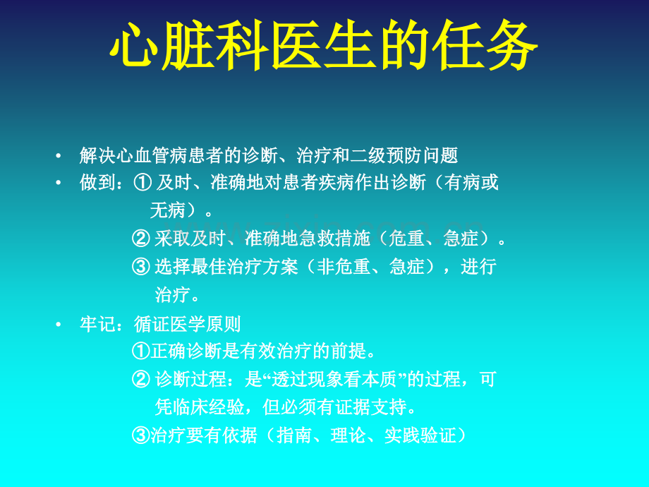 心脏科医生的任务心脏科医生的任务解决心血管病患者的诊断、治疗和二级预防问题解决心血管病患者的诊断、治疗和二级预防问题做到:做到:及时、准确地对患者疾病作出诊断(有病或及时、准确地对患者疾病作出诊断(有病或 无病)。无病)。采取及时、准确地急救措施(危重、急症)。采取及时、准确地急救措施(危重、急症)。选择最佳治疗方案(非危重、急症),进行选择最佳治疗方案(非危重、急症),进行 治疗。治疗。牢记:循证医学原则牢记:循证医学原则 正确诊断是有效治疗的前提。正确诊断是有效治疗的前提。诊断过程:是诊断过程:是“透过现象看本质透过现象看本质”的过程,可的过程,可 凭临床经验,但必须有证据支持。凭临床经验,但必须有证据支持。治疗要有依据(指南、理论、实践验证)治疗要有依据(指南、理论、实践验证)问题急性冠脉综合症(ACS)?AMI是冠脉内斑块逐渐增大堵塞管腔引起的吗?冠造正常可以发生AMI或猝死吗?冠脉狭窄程度重(90%)比狭窄程度轻(50%)危险吗?冠脉完全闭塞就发生心肌梗塞吗?老冠心病心绞痛和刚发生的心绞痛那个容易发生意外?治疗问题:药物、PCI、CABG心肌缺血供血量减少:1、失血、休克、低血压、贫血.2、冠脉狭窄:硬化斑块、痉挛.需血量增加:1、心率增快 2、负荷过重 用心率血压表示冠心病诊断中的误区冠心病诊断中的误区 整天胸闷整天胸闷整天胸闷整天胸闷,口含硝酸甘油无效,持续数小时发作,是,口含硝酸甘油无效,持续数小时发作,是冠心病冠心病吗吗?静息静息静息静息ECGECG ST-TST-T改变改变改变改变 ,几年没变化均不足以诊断为几年没变化均不足以诊断为CHDCHD(无典型症状)无典型症状)T T波改变,没有演变的冠状波改变,没有演变的冠状T T波波 运动运动运动运动ECGECG试验(踏板,踏车)试验(踏板,踏车)试验(踏板,踏车)试验(踏板,踏车)-也不能诊断为也不能诊断为CHDCHD (无典型(无典型(无典型(无典型APAP)(假阳性率高达(假阳性率高达30-40%30-40%)(假阴性率高达(假阴性率高达20%20%)静息同位素心肌灌注影象静息同位素心肌灌注影象静息同位素心肌灌注影象静息同位素心肌灌注影象-对对CHDCHD诊断无价值诊断无价值 (无症状,无(无症状,无(无症状,无(无症状,无OMIOMI史)史)史)史)CXRCXR-对无对无OMIOMI的的CHD-CHD-无诊断价值无诊断价值 静息超声静息超声静息超声静息超声-对无对无MIMI的的CHD-CHD-无诊断价值无诊断价值 典型典型典型典型APAP发作发作发作发作+发作时一过性发作时一过性STST段下移段下移 反复发作胸痛,反复发作胸痛,症状典型,口含症状典型,口含症状典型,口含症状典型,口含NTG3-5NTG3-5分钟均有效分钟均有效分钟均有效分钟均有效 同位素运动心肌显象同位素运动心肌显象同位素运动心肌显象同位素运动心肌显象-缺血再充填缺血再充填缺血再充填缺血再充填 (准确性(准确性95%95%)运动心电图运动心电图运动心电图运动心电图+伴典型伴典型伴典型伴典型APAP发作发作发作发作 (准确性(准确性90%90%)运动(药物)负荷运动(药物)负荷运动(药物)负荷运动(药物)负荷echo-echo-一过性一过性RWMARWMA(准确性(准确性8090%8090%)典型心绞痛发作史典型心绞痛发作史典型心绞痛发作史典型心绞痛发作史-临床准确性临床准确性90%90%诊断诊断CHD 最有意义的证据最有意义的证据冠心病诊断冠心病诊断(分以下五类)(分以下五类)原发心源性猝死原发心源性猝死 心绞痛(劳力、自发、混合、变异、心绞痛(劳力、自发、混合、变异、卧位、微血管性)卧位、微血管性)心肌梗死(心肌梗死(ST段抬高,非段抬高,非 ST段抬高型段抬高型、透壁、非透壁透壁、非透壁、Q波、非波、非Q波)波)心力衰竭心力衰竭 心律失常心律失常心绞痛分型心绞痛分型 WHO分型分型 Braunwald分型分型 初发(初发(2月内)月内)劳力型劳力型 稳定稳定 稳定型(本质:冠脉病变稳定)稳定型(本质:冠脉病变稳定)恶化恶化 自发型自发型 不稳定型(本质:不稳定型(本质:病变不稳定)病变不稳定)混合型混合型 变异型变异型 变异型(冠脉痉挛性闭塞)变异型(冠脉痉挛性闭塞)微血管型微血管型 微血管型(微血管型(X-Syndrom)急性冠脉综合症(急性冠脉综合症(ACS)心原性猝死(心原性猝死(SCD)不稳定性不稳定性AP(uA)(初发、恶化、自发、混合、)(初发、恶化、自发、混合、变异心绞痛)变异心绞痛)急性心肌梗死急性心肌梗死 ST上抬型上抬型 非非ST上抬型上抬型 上述任何临床分型均为冠心病的上述任何临床分型均为冠心病的“表象表象”,关键要抓住其关键要抓住其“本质本质”Non-transmural InfarctionTransmural Infarction急性冠脉综合征病理生理改变急性冠脉综合征的发病机理急性冠脉综合征的发病机理主流机制主流机制:斑块破裂诱发急性血栓形成斑块破裂诱发急性血栓形成(闭塞性和非闭塞性闭塞性和非闭塞性)次要机制次要机制:*斑块破裂或内膜损伤诱发血管收缩或痉挛斑块破裂或内膜损伤诱发血管收缩或痉挛 可与血栓形成并存亦可单独存在可与血栓形成并存亦可单独存在*粥样斑块因脂质浸润而急剧增大粥样斑块因脂质浸润而急剧增大决定斑块破裂的因素决定斑块破裂的因素脂核的大小脂核的大小斑块内炎症活化的程度斑块内炎症活化的程度 (巨噬巨噬C C和和T T细胞的侵润细胞的侵润)斑块纤维帽的厚度斑块纤维帽的厚度(纤维帽内胶原的数量纤维帽内胶原的数量)肩部地区肩部地