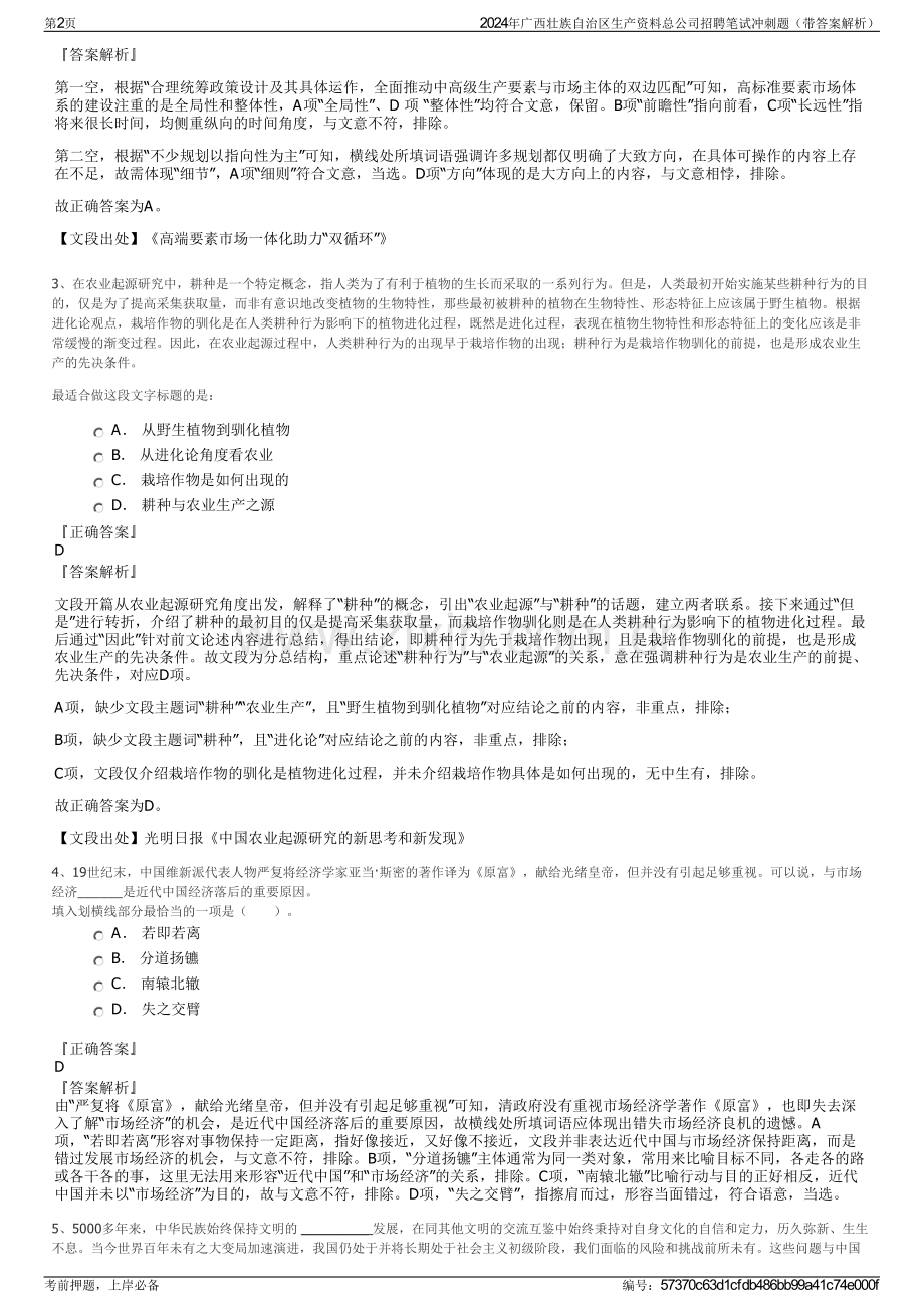 2024年广西壮族自治区生产资料总公司招聘笔试冲刺题(带答案解析)【下载须知】:1,本套练习包含以下题型:言语理解与表达题、常识判断题、数量关系题、判断推理题和资料分析题等题型;共135道。2、本套试题根据常见招考题总结归纳,主要用于练习答题思路和拓展知识面。3、本套试题非考试真题,且与广西壮族自治区生产资料总公司无关。一、第一部分言语理解与表达(本部分包括表达与理解两方面的内容。请根据题目要求,在四个选项中选出一个最恰当的答案。)1、文学批评,需要“积学以储宝,酌理以富才”,博览群书,取精用宏,有开阔的视野和 _ 的洞察力。唯其如此,面对文学作品时,方能独具慧眼,提出自己独到的见解和主张,并能 _,令人信服。依次填入画横线部分最恰当的一项是:A 切实 纲举目张 B 精准 举一反三 C 敏锐 妙趣横生 D 深刻 有理有据正确答案D答案解析第一空,搭配“洞察力”,B项“精准”、C项“敏锐”、D项“深刻”均与“洞察力”搭配恰当,保留。A项“切实”指切合实际,与“洞察力”搭配不当,排除。第二空,根据文意可知,横线处需体现“令人信服”之意,D项“有理有据”侧重强调有依据和凭据,即所提出的见解是有依据和凭据的,与“令人信服”对应得当,且与前文“博览群书”完成的积累可以有很好的顺承,当选。B项“举一反三”指从一件事情类推而知道其他许多事情,侧重善于类推,与“令人信服”无关,且该词常用于“学习、思考”等语境,与文段中“文学批评”的语境不符,排除;C项“妙趣横生”形容语言、文章、美术品等洋溢着美妙的意趣,与文意不符,排除。故正确答案为D。【文段出处】真凭实据地探究文学的秘密2、高标准要素市场体系的建设需要从 _ 出发,合理统筹政策设计及其具体运作,全面推动中高级生产要素与市场主体的双边匹配。但目前,相关顶层设计在“落地”时较多体现为由相关部门就某产业发展发布的政策和规划,不少规划以指向性为主,在可操作的 _ 上有所不足。依次填入画横线部分最恰当的一项是:A 全局性 细则 B 前瞻性 规范 C 长远性 内容 D 整体性 方向正确答案A第1页2024年广西壮族自治区生产资料总公司招聘笔试冲刺题(带答案解析)考前押题,上岸必备编号:57370c63d1cfdb486bb99a41c74e000f答案解析第一空,根据“合理统筹政策设计及其具体运作,全面推动中高级生产要素与市场主体的双边匹配”可知,高标准要素市场体系的建设注重的是全局性和整体性,A项“全局性”、D 项“整体性”均符合文意,保留。B项“前瞻性”指向前看,C项“长远性”指将来很长时间,均侧重纵向的时间角度,与文意不符,排除。第二空,根据“不少规划以指向性为主”可知,横线处所填词语强调许多规划都仅明确了大致方向,在具体可操作的内容上存在不足,故需体现“细节”,A项“细则”符合文意,当选。D项“方向”体现的是大方向上的内容,与文意相悖,排除。故正确答案为A。【文段出处】高端要素市场一体化助力“双循环”3、在农业起源研究中,耕种是一个特定概念,指人类为了有利于植物的生长而采取的一系列行为。但是,人类最初开始实施某些耕种行为的目的,仅是为了提高采集获取量,而非有意识地改变植物的生物特性,那些最初被耕种的植物在生物特性、形态特征上应该属于野生植物。根据进化论观点,栽培作物的驯化是在人类耕种行为影响下的植物进化过程,既然是进化过程,表现在植物生物特性和形态特征上的变化应该是非常缓慢的渐变过程。因此,在农业起源过程中,人类耕种行为的出现早于栽培作物的出现;耕种行为是栽培作物驯化的前提,也是形成农业生产的先决条件。最适合做这段文字标题的是:A 从野生植物到驯化植物 B 从进化论角度看农业 C 栽培作物是如何出现的 D 耕种与农业生产之源正确答案D答案解析文段开篇从农业起源研究角度出发,解释了“耕种”的概念,引出“农业起源”与“耕种”的话题,建立两者联系。接下来通过“但是”进行转折,介绍了耕种的最初目的仅是提高采集获取量,而栽培作物驯化则是在人类耕种行为影响下的植物进化过程。最后通过“因此”针对前文论述内容进行总结,得出结论,即耕种行为先于栽培作物出现,且是栽培作物驯化的前提,也是形成农业生产的先决条件。故文段为分总结构,重点论述“耕种行为”与“农业起源”的关系,意在强调耕种行为是农业生产的前提、先决条件,对应D项。A项,缺少文段主题词“耕种”“农业生产”,且“野生植物到驯化植物”对应结论之前的内容,非重点,排除;B项,缺少文段主题词“耕种”,且“进化论”对应结论之前的内容,非重点,排除;C项,文段仅介绍栽培作物的驯化是植物进化过程,并未介绍栽培作物具体是如何出现的,无中生有,排除。故正确答案为D。【文段出处】光明日报中国农业起源研究的新思考和新发现4、19世纪末,中国维新派代表人物严复将经济学家亚当斯密的著作译为原富,献给光绪皇帝,但并没有引起足够重视。可以说,与市场经济_是近代中国经济落后的重要原因。填入划横线部分最恰当的一项是()。A 若即若离 B 分道扬镳 C 南辕北辙 D 失之交臂正确答案D答案解析由“严复将原富,献给光绪皇帝,但并没有引起足够重视”可知,清政府没有重视市场经济学著作原富,也即失去深入了解“市场经济”的机会,是近代中国经济