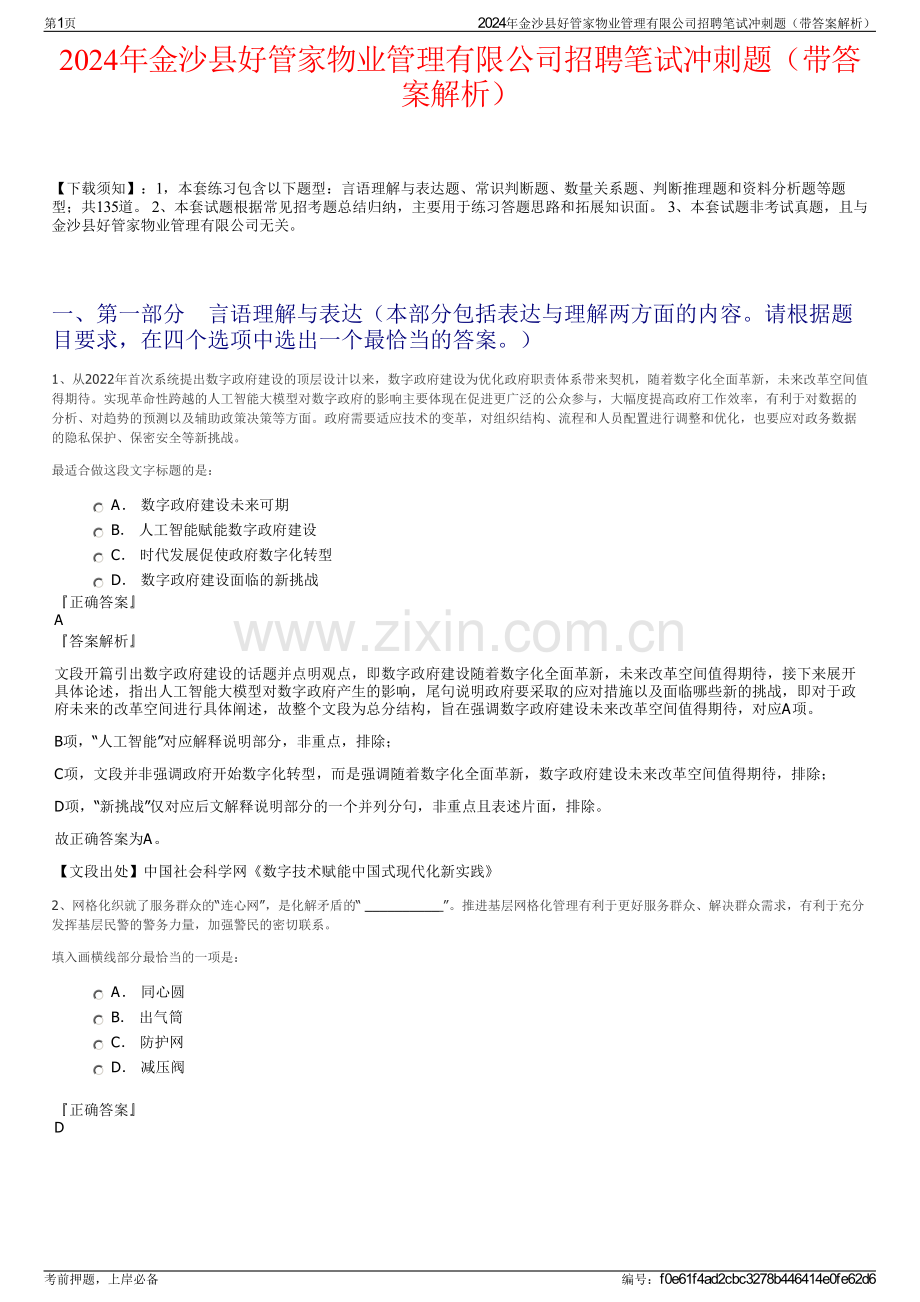2024年金沙县好管家物业管理有限公司招聘笔试冲刺题(带答案解析)【下载须知】:1,本套练习包含以下题型:言语理解与表达题、常识判断题、数量关系题、判断推理题和资料分析题等题型;共135道。2、本套试题根据常见招考题总结归纳,主要用于练习答题思路和拓展知识面。3、本套试题非考试真题,且与金沙县好管家物业管理有限公司无关。一、第一部分言语理解与表达(本部分包括表达与理解两方面的内容。请根据题目要求,在四个选项中选出一个最恰当的答案。)1、从2022年首次系统提出数字政府建设的顶层设计以来,数字政府建设为优化政府职责体系带来契机,随着数字化全面革新,未来改革空间值得期待。实现革命性跨越的人工智能大模型对数字政府的影响主要体现在促进更广泛的公众参与,大幅度提高政府工作效率,有利于对数据的分析、对趋势的预测以及辅助政策决策等方面。政府需要适应技术的变革,对组织结构、流程和人员配置进行调整和优化,也要应对政务数据的隐私保护、保密安全等新挑战。最适合做这段文字标题的是:A 数字政府建设未来可期 B 人工智能赋能数字政府建设 C 时代发展促使政府数字化转型 D 数字政府建设面临的新挑战正确答案A答案解析文段开篇引出数字政府建设的话题并点明观点,即数字政府建设随着数字化全面革新,未来改革空间值得期待,接下来展开具体论述,指出人工智能大模型对数字政府产生的影响,尾句说明政府要采取的应对措施以及面临哪些新的挑战,即对于政府未来的改革空间进行具体阐述,故整个文段为总分结构,旨在强调数字政府建设未来改革空间值得期待,对应A项。B项,“人工智能”对应解释说明部分,非重点,排除;C项,文段并非强调政府开始数字化转型,而是强调随着数字化全面革新,数字政府建设未来改革空间值得期待,排除;D项,“新挑战”仅对应后文解释说明部分的一个并列分句,非重点且表述片面,排除。故正确答案为A。【文段出处】中国社会科学网数字技术赋能中国式现代化新实践2、网格化织就了服务群众的“连心网”,是化解矛盾的“_”。推进基层网格化管理有利于更好服务群众、解决群众需求,有利于充分发挥基层民警的警务力量,加强警民的密切联系。填入画横线部分最恰当的一项是:A 同心圆 B 出气筒 C 防护网 D 减压阀正确答案D第1页2024年金沙县好管家物业管理有限公司招聘笔试冲刺题(带答案解析)考前押题,上岸必备编号:f0e61f4ad2cbc3278b446414e0fe62d6答案解析根据后文可知,横线处表达网格化有助于化解矛盾,D项“减压阀”指通过调节,将进口压力减至某一需要的出口压力,并依靠介质本身的能量,使出口压力自动保持稳定的阀门,能够体现化解矛盾之意,当选。A项“同心圆”指同一平面上同一圆心而半径不同的圆,B项“出气筒”指没有恰当的由头而被人当作发泄怨恨的对象,C项“防护网”指有防护作用的网状设施,均不能体现化解矛盾之意,与文意不符,排除。故正确答案为D。【文段出处】政法机关忠实履职尽责 紧紧围绕中国式现代化谋划推进政法工作现代化3、众所周知,南朝是一个皇权重新集中、士庶升降变化剧烈的时代。皇帝为了削弱和限制高门士族,必定要扶持次等士族和寒门。后两者为了政治进身也必然依附皇权。在南朝,文学才能是衡量世族的一条重要标准,出身寒门庶族的帝王为全方位强化权威形象而努力跻身文人行列,同时拔擢与其门第身份相近的次等士族和寒门文士。正是在这样的背景下,。彭城刘氏、兰陵萧氏、彭城到氏、吴兴沈氏、吴兴陈氏等家族,他们在通过武力夺取政权或靠积累军功获取了足够的政治资源后,都表现出生活方式“士大夫化”的倾向。填入画横线部分最恰当的一项是:A皇权重振加速了次等士族的迅速兴起 B寒门庶族大都参与到激烈的权力争斗 C提升文化修养成了所有寒门庶族的共同追求 D庶族不满足于对门阀大族手中政治权力的分享正确答案C答案解析横线位于中间,需要联系前后文分析。文段开篇引出南朝、次等士族和寒门的话题,接着提出文学才能是衡量世族的重要标准,出身寒门庶族的帝王会努力跻身文人行列,同时提拔与其门第身份相近的次等士族和寒门文士,即体现了在南朝文化修养的重要性。“正是在这样的背景下”对前文进行总结,且横线后列举了彭城刘氏、兰陵萧氏等一些家族进行举例说明,均表现出生活方式“士大夫化”的倾向,体现的是对文化和文学的追求。故横线前后围绕“文学”展开,横线处应体现寒门庶族对文学修养的追求,对应C项。A项,“加速了次等士族的迅速兴起”仅对应横线前的内容,且未提及核心话题“文学”,排除;B项,“寒门庶族参与权力争斗”仅对应横线后的事例,且未提及核心话题“文学”,排除;D项,“对门阀大族手中政治权力的分享”文段并未提及,无中生有,且未提及核心话题“文学”,排除。故正确答案为C。【文段出处】知识下移与六朝才女书写标准的演变(二)4、在视频社会化时代,“人人都是艺术家”并不现实,绝大多数人创作和分享视频主要还是为了流量、眼球和经济效益,还有一些人为了自娱自乐,因而所制作和分享的视频比较随意,视频中的知识点经常错误百出,并不可靠。在视频社会化时代,要想发挥视频的作用,更好地传播优秀文化,就需要专家、学者以及专业机构介入和参与视