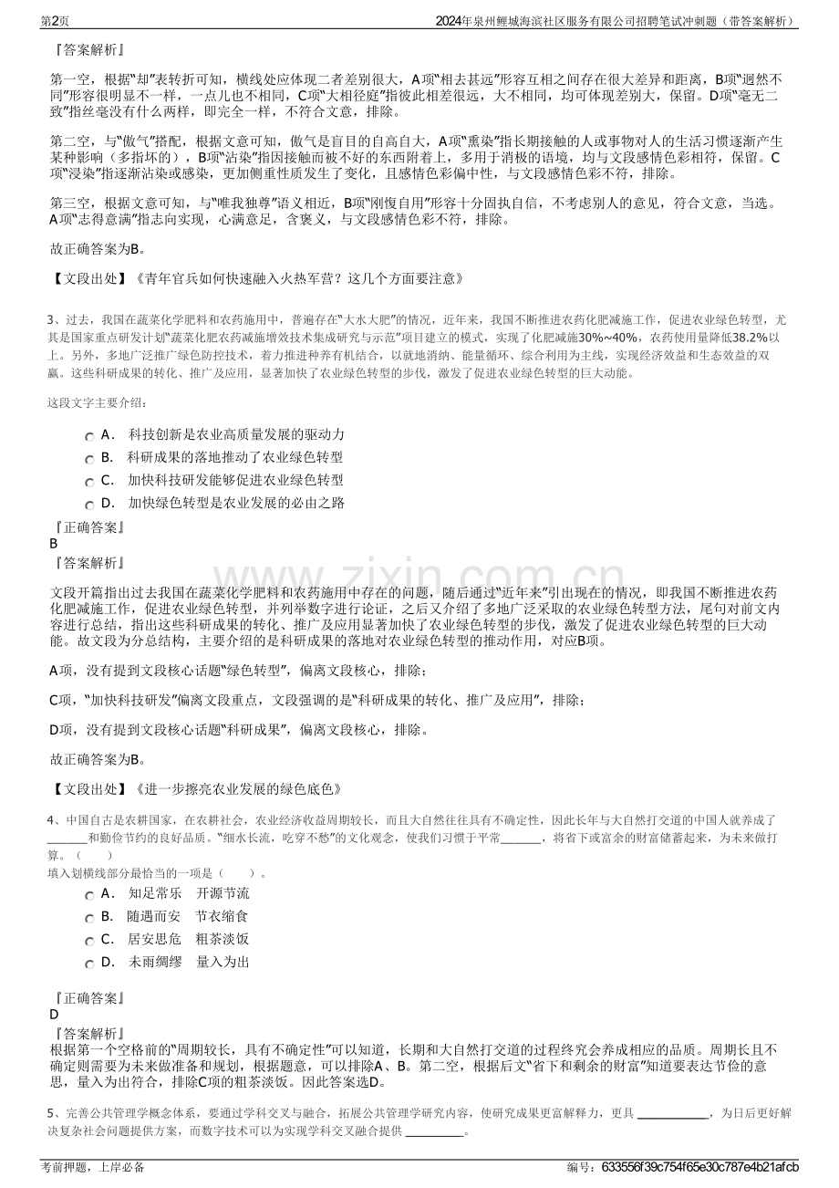 2024年泉州鲤城海滨社区服务有限公司招聘笔试冲刺题(带答案解析)【下载须知】:1,本套练习包含以下题型:言语理解与表达题、常识判断题、数量关系题、判断推理题和资料分析题等题型;共135道。2、本套试题根据常见招考题总结归纳,主要用于练习答题思路和拓展知识面。3、本套试题非考试真题,且与泉州鲤城海滨社区服务有限公司无关。一、第一部分言语理解与表达(本部分包括表达与理解两方面的内容。请根据题目要求,在四个选项中选出一个最恰当的答案。)1、“_”。2020年11月,习近平总书记在浦东开放30周年庆祝大会上强调,“中国经济是一片大海”,“世界经济也是一片大海”,而“世界大海大洋都是相通的”。我们现在建设以国内大循环为主体的新发展格局,绝不是关上国门来封闭运行,而是要通过进一步挖掘和发挥内需潜力,更加畅通国内市场和国际市场,更好利用国内国际两个市场、两种资源,实现更加强劲、可持续、高质量的发展。填入画横线部分最恰当的一项是:A 长风破浪会有时,直挂云帆济沧海 B 大足以容众,德足以怀远 C 河海不择细流,故能就其深 D 体无常规,言无常宗正确答案C答案解析横线出现在文段开头,需统领全文。文段指出中国现在建设以国内大循环为主体的新发展格局,绝不是关上国门来封闭运行,而是要更加畅通国内市场和国际市场,故文段强调了开放、包容的新发展格局,横线处也应体现开放、包容的意思,C项“河海不择细流,故能就其深”意思是江河湖海不拒绝细小溪流的汇入,所以能成就它的深广,意在表达只有不排斥、不拒绝细小的力量,才能够成就真正的伟大,符合文意,当选。A项,“长风破浪会有时,直挂云帆济沧海”表达了诗人有宏大的理想和抱负,以及实现理想的坚定信念,与文段强调的“开放、包容”无关,排除;B项,“大足以容众,德足以怀远”意为宽大的胸怀可以容纳众人,德行高洁的人可以让别人更加怀念,其中“德足以怀远”文段并未体现,排除;D项,“体无常规,言无常宗”意在告诉我们无论是体制、言辞,都是不断演变、更新的,与文意无关,排除。故正确答案为C。【文段出处】坚持高水平开放是当代中国的鲜明标识2、“傲气”与“傲骨”虽一字之差,却 _。傲骨是精神气节,而傲气则是一种盲目的自高自大。当一个人 _ 上了傲气,就会以自我为中心,飘飘然。久而久之,就会 _,唯我独尊,膨胀甚至毁灭。依次填入画横线部分最恰当的一项是:A 相去甚远 熏染 志得意满 B 迥然不同 沾染 刚愎自用 C 大相径庭 浸染 恃才放旷 D 毫无二致 习染 目中无人正确答案B第1页2024年泉州鲤城海滨社区服务有限公司招聘笔试冲刺题(带答案解析)考前押题,上岸必备编号:633556f39c754f65e30c787e4b21afcb答案解析第一空,根据“却”表转折可知,横线处应体现二者差别很大,A项“相去甚远”形容互相之间存在很大差异和距离,B项“迥然不同”形容很明显不一样,一点儿也不相同,C项“大相径庭”指彼此相差很远,大不相同,均可体现差别大,保留。D项“毫无二致”指丝毫没有什么两样,即完全一样,不符合文意,排除。第二空,与“傲气”搭配,根据文意可知,傲气是盲目的自高自大,A项“熏染”指长期接触的人或事物对人的生活习惯逐渐产生某种影响(多指坏的),B项“沾染”指因接触而被不好的东西附着上,多用于消极的语境,均与文段感情色彩相符,保留。C项“浸染”指逐渐沾染或感染,更加侧重性质发生了变化,且感情色彩偏中性,与文段感情色彩不符,排除。第三空,根据文意可知,与“唯我独尊”语义相近,B项“刚愎自用”形容十分固执自信,不考虑别人的意见,符合文意,当选。A项“志得意满”指志向实现,心满意足,含褒义,与文段感情色彩不符,排除。故正确答案为B。【文段出处】青年官兵如何快速融入火热军营?这几个方面要注意3、过去,我国在蔬菜化学肥料和农药施用中,普遍存在“大水大肥”的情况,近年来,我国不断推进农药化肥减施工作,促进农业绿色转型,尤其是国家重点研发计划“蔬菜化肥农药减施增效技术集成研究与示范”项目建立的模式,实现了化肥减施30%40%,农药使用量降低38.2%以上。另外,多地广泛推广绿色防控技术,着力推进种养有机结合,以就地消纳、能量循环、综合利用为主线,实现经济效益和生态效益的双赢。这些科研成果的转化、推广及应用,显著加快了农业绿色转型的步伐,激发了促进农业绿色转型的巨大动能。这段文字主要介绍:A 科技创新是农业高质量发展的驱动力 B 科研成果的落地推动了农业绿色转型 C 加快科技研发能够促进农业绿色转型 D 加快绿色转型是农业发展的必由之路正确答案B答案解析文段开篇指出过去我国在蔬菜化学肥料和农药施用中存在的问题,随后通过“近年来”引出现在的情况,即我国不断推进农药化肥减施工作,促进农业绿色转型,并列举数字进行论证,之后又介绍了多地广泛采取的农业绿色转型方法,尾句对前文内容进行总结,指出这些科研成果的转化、推广及应用显著加快了农业绿色转型的步伐,激发了促进农业绿色转型的巨大动能。故文段为分总结构,主要介绍的是科研成果的落地对农业绿色转型的推动作用,对应B项。A项,没有提到文段核心话题“绿色转型”,偏离文段核心,排除;C项,“加快科技研发”偏离文段重点,文段强调的是“科研成果的转化、推广及应用”,排除;D项,没