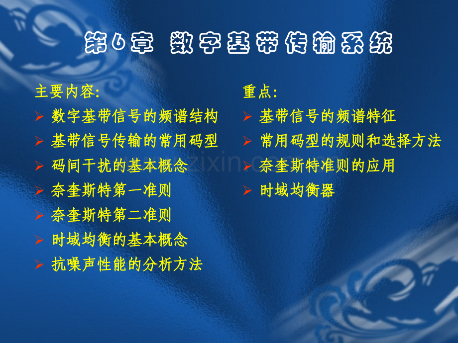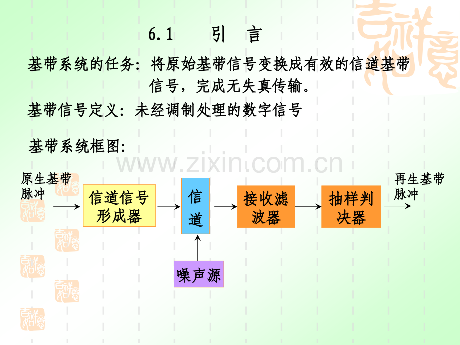 第第 6 6 章章 数数 字字 基基 带带 传传 输输 系系 统统主要内容:主要内容:数字基带信号的频谱结构数字基带信号的频谱结构基带信号传输的常用码型基带信号传输的常用码型码间干扰的基本概念码间干扰的基本概念奈奎斯特第一准则奈奎斯特第一准则奈奎斯特第二准则奈奎斯特第二准则时域均衡的基本概念时域均衡的基本概念抗噪声性能的分析方法抗噪声性能的分析方法重点:重点:基带信号的频谱特征基带信号的频谱特征常用码型的规则和选择方法常用码型的规则和选择方法奈奎斯特准则的应用奈奎斯特准则的应用时域均衡器时域均衡器6.1 6.1 引言引言 6.2 6.2 数字基带信号及其频谱特性数字基带信号及其频谱特性 6 6.3 .3 基带传输的常用码型基带传输的常用码型 6 6.4 .4 数字基带信号传输与码间串扰数字基带信号传输与码间串扰 6 6.5 .5 无码间串扰的基带传输特性无码间串扰的基带传输特性6 6.7 .7 部分响应系统部分响应系统 6 6.6 .6 无码间干扰基带系统的抗噪声性能无码间干扰基带系统的抗噪声性能 6 6.8 .8 时时 域域 均均 衡衡6.1 6.1 引引 言言基带信号定义:未经调制处理的数字信号基带信号定义:未经调制处理的数字信号基带系统的任务:将原始基带信号变换成有效的信道基带基带系统的任务:将原始基带信号变换成有效的信道基带信号,完成无失真传输。信号,完成无失真传输。信道信号信道信号形成器形成器接收滤接收滤波器波器抽样判抽样判决器决器噪声源噪声源信信 道道原生基带原生基带脉冲脉冲再生基带再生基带脉冲脉冲基带系统框图:基带系统框图:6.2 6.2 数字基带信号及其频谱特性数字基带信号及其频谱特性 6.2.1 6.2.1 基带信号波形基带信号波形6.2.2 6.2.2 基带信号表达式基带信号表达式6.2.3 6.2.3 基带信号频谱基带信号频谱 6.2.1 6.2.1 基带信号波形基带信号波形 (电气特征)(电气特征)单极性非归零单极性非归零单极性单极性归零归零双极双极性非归零性非归零双极双极性性归零归零:码元宽度码元宽度特征:非归零和归零信号的码元宽度相同,但占空比特征:非归零和归零信号的码元宽度相同,但占空比不同,导不同,导致信号频谱不同。致信号频谱不同。原始波形原始波形差分波形差分波形 差分波形差分波形 每个码元的电平不由自身状态决定,而与相邻码元电平值有关。每个码元的电平不由自身状态决定,而与相邻码元电平值有关。规则:规则:“1 1”-相邻码元电平值相邻码元电平值 跳变跳变 “0 0”-相邻码元电平值相邻码元电平值 保持保持多值波形多值波形 0 0 0 1 0 1 1 0 0 0 1 1 1 16.2.2 6.2.2 基带信号的数学表达式基带信号的数学表达式由于二进制数字基带信号是随机脉冲信号,且码元波形可任意,需由于二进制数字基带信号是随机脉冲信号,且码元波形可任意,需采用随机信号分析法。采用随机信号分析法。设设 码元宽度为码元宽度为Ts ,则基带信号,则基带信号 S(t)可表示成可表示成 分别表示二进制两个分别表示二进制两个状态的波形函数状态的波形函数以概率以概率 p以概率以概率(1-p)其中:其中:、0t 0 1 0 0 1 由随机信号理论知,由随机信号理论知,S(t)的功率谱密度函数的功率谱密度函数PS()与与截短信号截短信号ST(t)的功的功率谱密度函数率谱密度函数PST()有关有关ST(t)是是 S(t)的的截短信号截短信号 要求:要求:T=(2N+1)Ts N 足够大足够大 6.2.3 6.2.3 基带信号的频谱基带信号的频谱 随机序列的谱分析随机序列的谱分析 法一:由随机过程的相关函数着手,得功率谱。法一:由随机过程的相关函数着手,得功率谱。法二:用脉冲出现概率描述。法二:用脉冲出现概率描述。基带信号基带信号取取对对 S(t)的分析转化为对的分析转化为对 ST(t)的分析的分析随机过程的随机过程的数字特征数字特征法二:法二:令令 ST(t)=稳态波稳态波 交变波交变波 (等效为广义直流和交流)(等效为广义直流和交流)=vT(t)+uT(t)vT(t)是是 ST(t)的统计平均分量的统计平均分量以概率以概率 p以概率以概率(1-p)将将带入带入 uT(t)0 1 1 0 0 0 1 0=an g1(t-nTs)-g2(t-nTs)对对S ST(t)的谱分析又转化为对的谱分析又转化为对 vT(t),uT(t)的谱分析。的谱分析。再令再令T ,通过,通过v(t),u(t)进而求得进而求得S(t)的功率谱。的功率谱。un(t)(1-p)g1(t-nTs)-g2(t-nTs)以概率以概率p p-p g1(t-nTs)-g2(t-nTs)以概率以概率1-p1-p-p -p 以概率以概率1-p1-p其中:其中:an=1-p 1-p 以概率以概率pv(t)功率谱功率谱u(t)功率功率谱谱结论:结论:S(t)功率谱功率谱又又 v(t)=v(t+Ts)是周期信号是周期信号 由傅氏变换知,必有由傅氏变换知,必有 其中其中 v(t)的的功率谱功率谱t=t-nTs=ms因为周期信号对应离散谱,根据频移特性因为周期信号对应离散谱,根据频移特性为为离散谱离散谱幅度谱幅度谱功率谱功率谱结论结论1:u(t)的功率谱的功率谱代入代入时移特性时移特性又又|UT(f)|2 =UT(f)UT*(f)讨论讨论 E(aman)PUT(f)=E|UT(f)|2 截短交变的功率谱截短交变的功率谱=p(1-p)|G1(f)-G2(f)|2为为连续谱连续谱交变波的功率谱与交变波的功率谱与g g1 1(t),g(t),g2 2(t)(t)的频谱出现概率有关,是连续谱。的频谱出现概率有关,是连续谱。稳态波的功率谱与稳态波的功率谱与g g1 1(t),g(t),g2 2(t)(t)的频谱出现概率有关,是离散谱。的频谱出现概率有关,是离散谱。特征:特征:结论结论2:ST(t)=vT(t)+uT(t)Ps()=Pv()+Pu()单边谱:单边谱:S(t)的功率谱的功率谱双边谱:双边谱:单极性