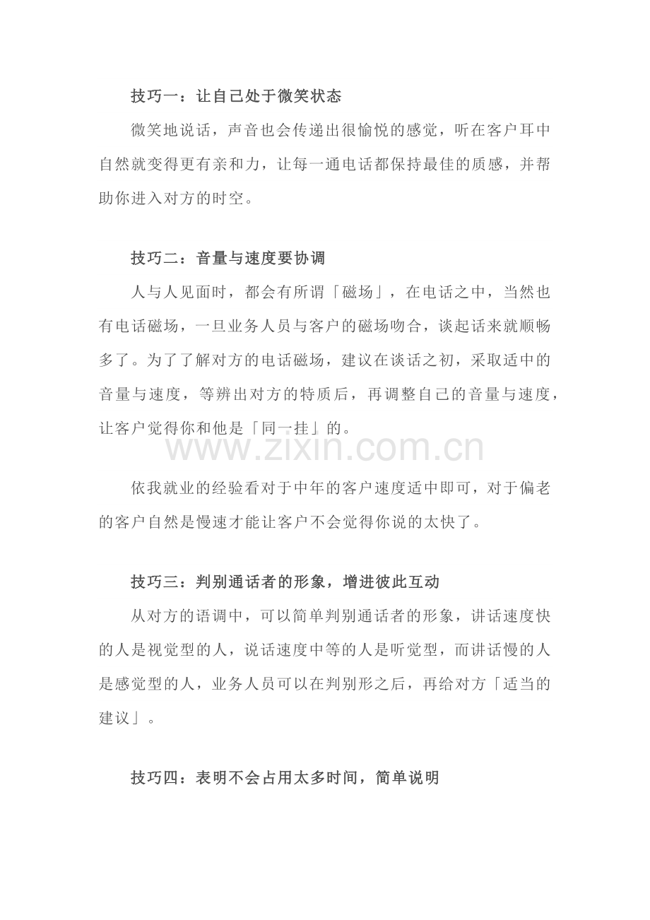 人与人见面时,都会有所谓「磁场」,在电话之中,当然也有电话磁场,一旦业务人员与客户的磁场吻合,谈起话来就顺畅多了。为了了解对方的电话磁场,建议在谈话之初,采取适中的音量与速度,等辨出对方的特质后,再调整自己的音量与速度,让客户觉得你和他是「同一挂」的。