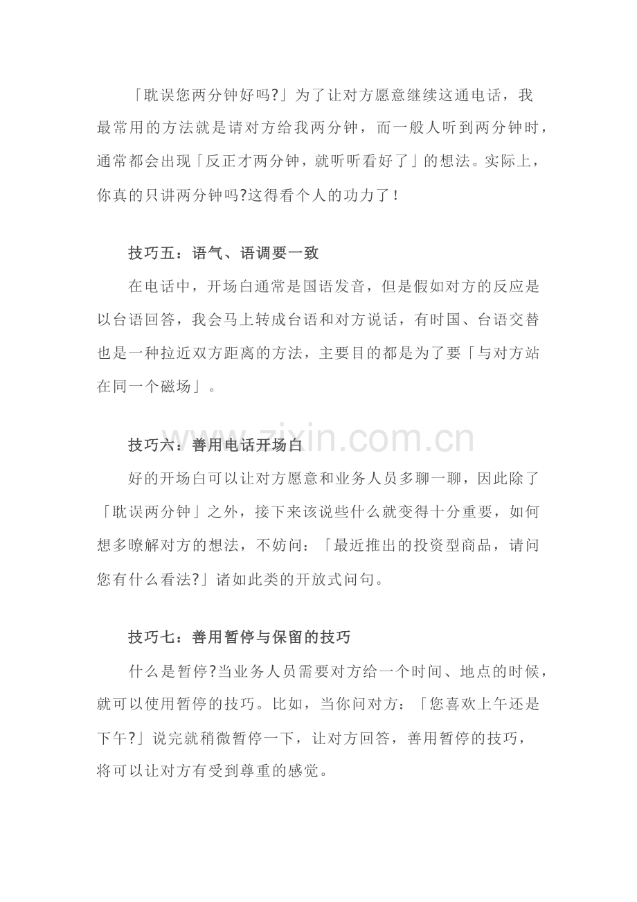 「耽误您两分钟好吗?」为了让对方愿意继续这通电话,我最常用的方法就是请对方给我两分钟,而一般人听到两分钟时,通常都会出现「反正才两分钟,就听听看好了」的想法。实际上,你真的只讲两分钟吗?这得看个人的功力了!