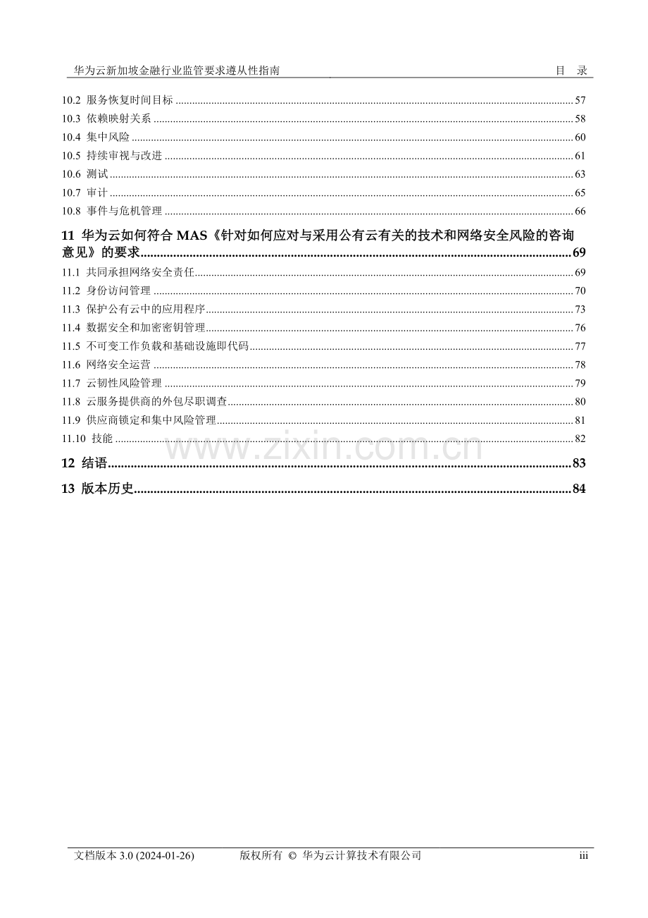 华为云新加坡金融行业监管要求遵从性指华为云新加坡金融行业监管要求遵从性指南南 文档版本文档版本 3.0 发布日期发布日期 2024-01-26 华为云计算技术有限公司华为云计算技术有限公司 华为云新加坡金融行业监管要求遵从性指南 目 录 文档版本 3.0(2024-01-26)版权所有 华为云计算技术有限公司 ii 目目 录录 1 简介简介.1 2 华为云安全与隐私合规华为云安全与隐私合规.2 3 华为云安全责任共担模型华为云安全责任共担模型.5 4 华为云全球基础设施华为云全球基础设施.6 5 华为云如何符合华为云如何符合 MAS外包指南的要求外包指南的要求.7 5.1 与 MAS 在外包的合作.7 5.2 风险管理实践.7 5.3 云计算.11 6 华为云如何符合华为云如何符合 MAS科技风险管理指南的要求科技风险管理指南的要求.13 6.1 科技风险治理和监督.13 6.2 科技风险管理框架.15 6.3 IT 项目管理和设计安全.16 6.4 软件应用程序开发与管理.19 6.5 IT 恢复能力.21 6.6 访问控制.24 6.7 数据和基础设施安全.25 7 华为云如何符合华为云如何符合 MAS关于网络卫生的通知的要求关于网络卫生的通知的要求.29 8 华为云如何符合华为云如何符合 ABS外包服务商控制目标和流程指南的要求外包服务商控制目标和流程指南的要求.33 8.1 审计和检查.33 8.2 实体级别控制.35 8.3 通用 IT 控制.37 8.4 服务控制.42 9 华为云如何符合华为云如何符合 ABSABS 云计算实施指南的要求云计算实施指南的要求.44 9.1 尽职调查建议的活动.44 9.2 进入云外包安排时建议的控制措施.46 10 华为云如何符合华为云如何符合 MAS业务连续性管理指南的要求业务连续性管理指南的要求.56 10.1 关键业务服务和职能.56 华为云新加坡金融行业监管要求遵从性指南 目 录 文档版本 3.0(2024-01-26)版权所有 华为云计算技术有限公司 iii 10.2 服务恢复时间目标.57 10.3 依赖映射关系.58 10.4 集中风险.60 10.5 持续审视与改进.61 10.6 测试.63 10.7 审计.65 10.8 事件与危机管理.66 11 华为云如何符合华为云如何符合 MAS针对如何应对与采用公有云有关的技术和网络安全风险的咨询针对如何应对与采用公有云有关的技术和网络安全风险的咨询意见的要求意见的要求.69 11.1 共同承担网络安全责任.69 11.2 身份访问管理.70 11.3 保护公有云中的应用程序.73 11.4 数据安全和加密密钥管理.76 11.5 不可变工作负载和基础设施即代码.77 11.6 网络安全运营.78 11.7 云韧性风险管理.79 11.8 云服务提供商的外包尽职调查.80 11.9 供应商锁定和集中风险管理.81 11.10 技能.82 12 结语结语.83 13 版本历史版本历史.84 华为云新加坡金融行业监管要求遵从性指南 1 简介 文档版本 3.0(2024-01-26)版权所有 华为云计算技术有限公司 1 1 简介简介 在科技发展的浪潮中,越来越多的金融机构在逐渐寻求业务转型并希望借助先进的技术以降低成本、提升运营效率、实现业务模式的创新。为了规范金融行业对于信息科技的运用,新加坡金融监管局(MAS)以及新加坡银行协会(ABS)发布了一系列监管要求、指南和通知,针对新加坡金融机构科技风险管理、科技外包管理以及云计算实施等方面提出了相关监管要求。华为云作为云服务供应商,致力于协助金融客户满足这些监管要求,持续为金融客户提供符合金融行业标准要求的云服务及业务运行环境。为此,华为云目前已建立起一套涵盖业界主流云安全标准以及华为云安全管理要求的方法体系,覆盖了网络安全与隐私保护领域中多个方面的要求,其实施有助于提升华为云自身合规水平,同时能够协助金融客户满足相关监管要求、指南和通知。本文将针对新加坡金融机构在使用云服务时通常需遵循的以下监管要求和指南,详细阐述华为云将如何协助其满足监管要求:MAS 外包指南:外包指南:针对已经或计划将业务活动外包给服务供应商的金融机构,提出了希望金融机构能够遵守的外包管理相关要求,为金融机构外包活动的风险管理提供了良好实践指导。MAS 科技风险管理指南:科技风险管理指南:规定了科技风险管理原则和最佳实践标准,指导金融机构建立健全、可靠的科技风险管理框架。MAS 关于网络卫生的通知:关于网络卫生的通知:为新加坡金融机构提供了关于遵循相关法令的实践指导。ABS 外包服务商控制目标和流程指南:外包服务商控制目标和流程指南:规定了为金融机构提供服务的外包服务供应商应具备的最低/基线控制措施。ABS 云计算实施指南:云计算实施指南:为金融机构提供了关于使用云服务的最佳实践和注意事项。MAS 业务连续性管理指南:业务连续性管理指南:为新加坡金融机构加强业务连续性管理提供指导,旨在帮助金融机构增强抵御服务中断的能力,同时最大限度地减少服务中断所造成的负面影响。MAS 针对如何应对与采用公有云有关的技术和网络安全风险的咨询意见:针对如何应对与采用公有云有关的技术和网络安全风险的咨询意见:强调了金融机构在采用公有云服务前应考虑的一些常见的关键风险和控制措施。为金融机构更加安全地使用公有云服务,降低相关风险提供指导。华为云新加坡金融行业监管要求遵从性指南 2 华为云安全与隐私合规 文档版本 3.0(2024-01-26)版权所有 华为云计算技术有限公司 2 2 华为云安全与隐私合规华为云安全与隐私合规 华为云继承了华为公司完备的管理体系以及 IT 系统的建设和运营经验,对华为云各项服务的集成、运营及维护进行