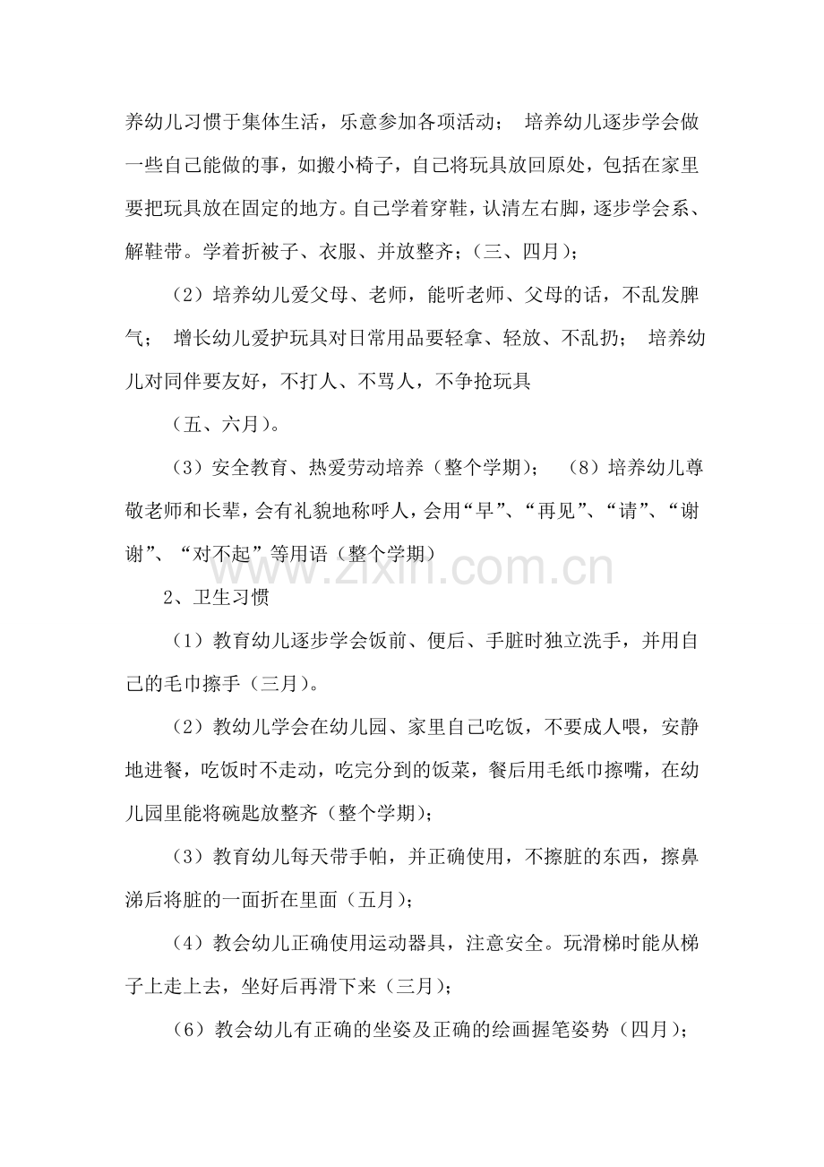 (1)培养幼儿爱幼儿园,能高高兴兴地自己走着上幼儿园。 培养幼儿习惯于集体生活,乐意参加各项活动; 培养幼儿逐步学会做一些自己能做的事,如搬小椅子,自己将玩具放回原处,包括在家里要把玩具放在固定的地方。自己学着穿鞋,认清左右脚,逐步学会系、解鞋带。学着折被子、衣服、并放整齐;(三、四月);