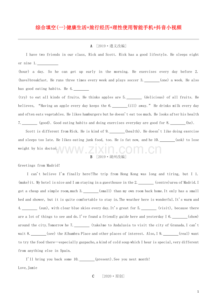 综合填空(一)健康生活+旅行经历+理性使用智能手机+抖音小视频