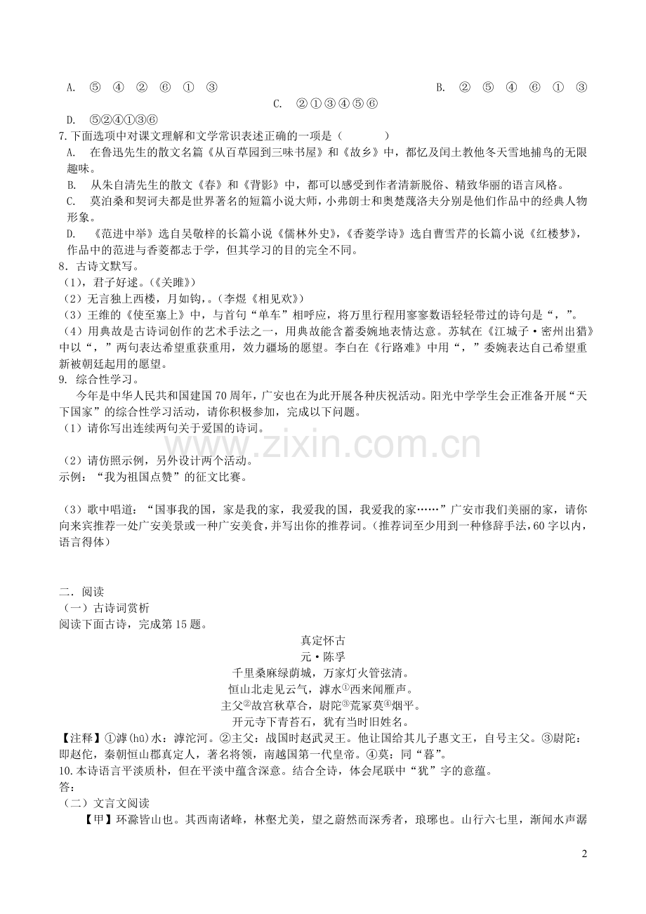 九台区2020年中考语文模拟试题六
