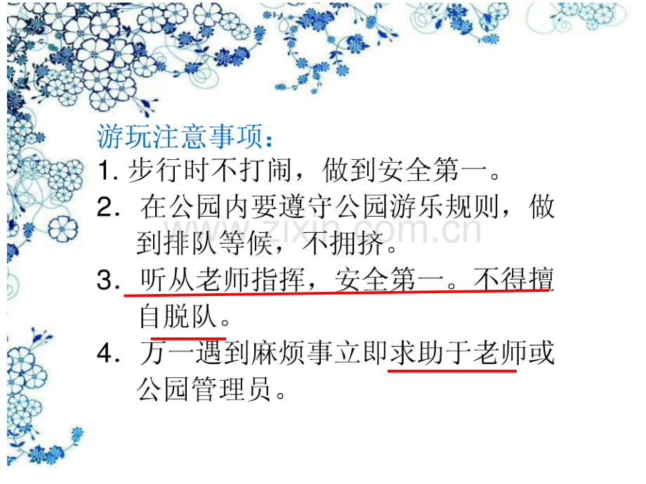 果冻、花生、豆类、薯片等容易呛着喉咙的食品不要带,可以带盒牛奶或是两个水果,数量要控制在2种以内贵重物品如手机、相机不带零钱也尽量不带或少带,要带的话应控制在30元钱以内。最好还要带一个小垃圾袋备用。出发前我们班主任要检查一下孩子的背包是否符合以上要求和进行安全、守纪的教育,请家长在家也对孩子加强教育。
