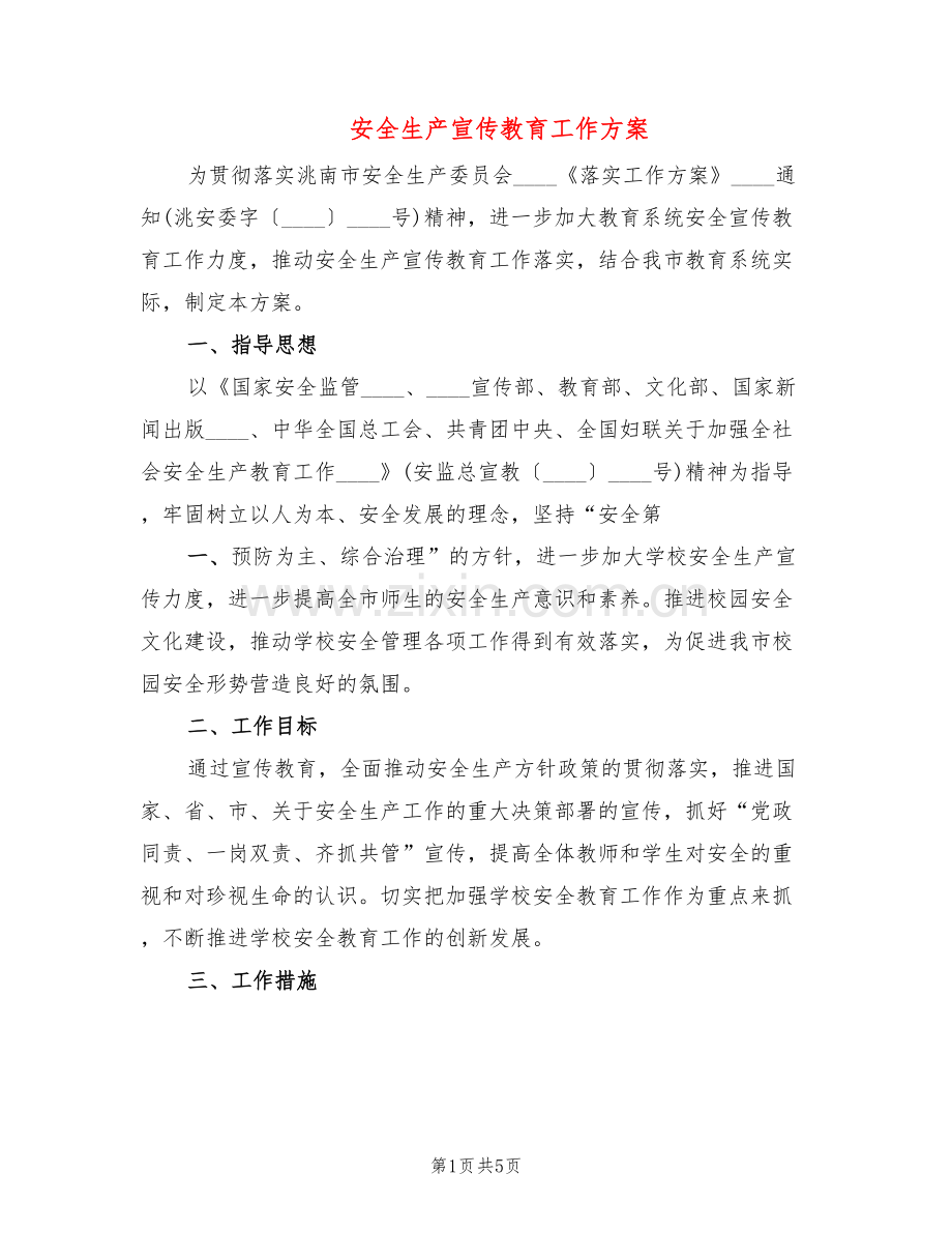 为贯彻落实洮南市安全生产委员会____《落实工作方案》____通知(洮安委字〔____〕____号)精神,进一步加大教育系统安全宣传教育工作力度,推动安全生产宣传教育工作落实,结合我市教育系统实际,制定本方案。