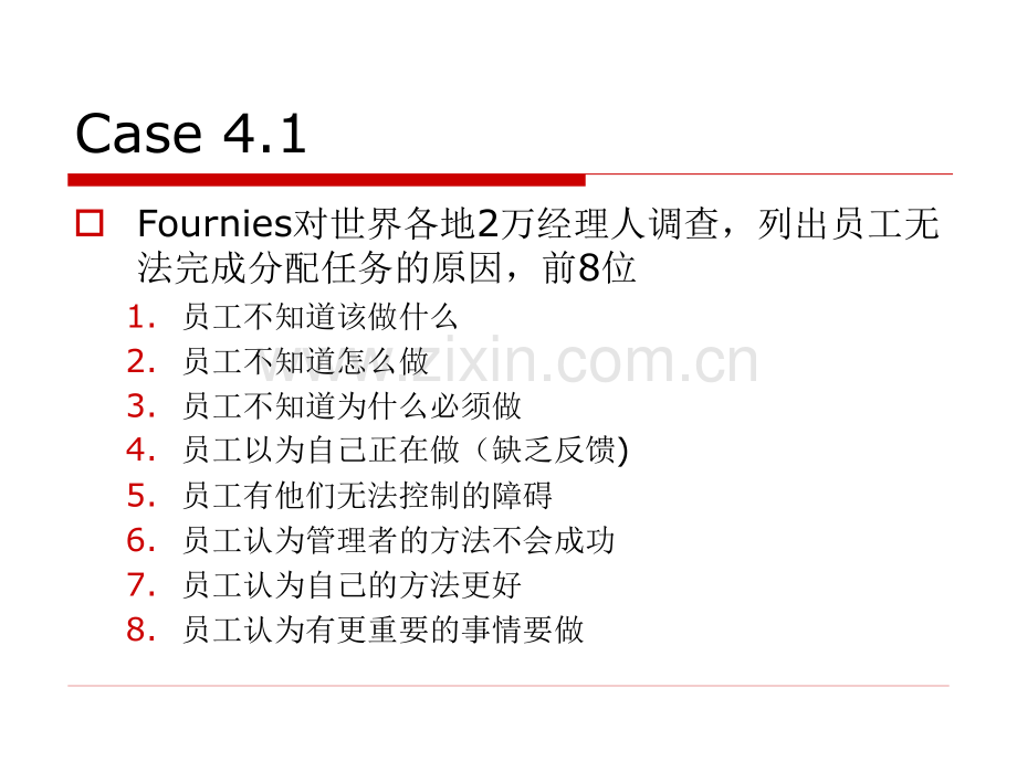 第四章 绩效管理的过程控制4.1 绩效沟通,追踪辅导4.2 绩效监控与反馈4 45 5绩效考核绩效考核绩效绩效监控监控和反和反馈馈绩效追踪辅绩效追踪辅导导3 3战略目标战略目标设定设定1 12 2战略目标战略目标分解分解绩效计划绩效计划制定制定6 6绩效激励绩效激励0 0o绩效计划计划实施o任何一个绩效评估系统都不会自动地发挥管理功能n企业花费了大量的金钱和精力制订了绩效评估方案,却推行不下去,“匆匆过客”,“轮流坐庄”等n管理者应付了事,绩效目标难以衡量,管理者缺乏相关的训练,拉不开面子,打分标准不一等等n根本根本是忽视了对绩效管理全过程的把握,只问结果、不问过程,忽视了绩效管理的实施这一重要环节,导致绩效管理过程偏离预定的方向和目标Case 4.1oFournies对世界各地2万经理人调查,列出员工无法完成分配任务的原因,前8位1.员工不知道该做什么2.员工不知道怎么做3.员工不知道为什么必须做4.员工以为自己正在做(缺乏反馈)5.员工有他们无法控制的障碍6.员工认为管理者的方法不会成功7.员工认为自己的方法更好8.员工认为有更重要的事情要做绩效管理过程中易出现的问题1)准备阶段n宣传教育不够:高层管理者发挥强有力的推动作用,表明组织变革的决心,影响企业文化和氛围,才能为管理系统的顺利实施创造环境条件。n缺少培训:o目标管理、绩效沟通、评估技术、反馈面谈等多项技能o由于管理人员的认识偏差和技能缺乏,造成整个系统的运行偏离预定轨道。o绩效管理的失败不仅是已经发生的成本,更重要的是会破坏组织氛围,降低员工信心,给组织带来长期的潜在的损失。o培训是一种有效的预先控制,将失误控制在潜在的可能阶段,对组织来说是降低成本、提高收益的有效手段。n管理政策不配套:o绩效管理的实施必须和奖惩制度、晋升制度、权责界定等一系列管理政策相配套。o缺少政策,系统的实施就得不到制度保证,很、难长期、有序地进行2)绩效评估体系过于复杂绩效评估体系过于复杂n评估系统的简便易行是实施成功的先决条件。n重视评估指标的可验证性,描述性指标如果能被验证,同样是适用的n重视信息的收集和记录、整理,为评估结果提供可验证的信息。3)忽视资料收集的重要性忽视资料收集的重要性n绩效评估结果常常决定一个人在组织中的地位和前途,所以作为评估基础的信息必须真实、有效、可靠。n忽视资料收集的重要性,导致评估时缺少能够说明问题的可靠数据。避免冲突,评估只能趋向平均化,最终可能导致绩效管理流于形式。将系统实施失败的原因归咎于评估指标的不合理上。n加强收集基础信息的制度管理,将行之有效的生产记录法、考勤纪录、原始台帐等基础信息管理落实到位,同时可以在相应监控的情况下让员工参与收集数据,保证能为绩效评估提供上下级双方认可的可靠信息。绩效管理过程中易出现的问题4)评估过程的误区评估过程的误区n对系统本身认识不够。如对绩效评估标准认识不一致。同样的好、中、差三项标准,可能有的评估者掌握过宽,有的过严,进而影响考评结果。n由于主管人员在评估过程中的心理误区造成评估偏差。比较常见的有晕轮效应、对照效应、类己效应、近因效应、趋中效应等n由于评估人员主观上利用评估权力造成的偏差。如挟私报复等。绩效管理过程中易出现的问题如何避免:1.加强对评估人员的培训指导改善和避免2.在评估系统中制订完善的反馈控制渠道,给员工以申诉的机会5)绩效反馈失败绩效反馈失败n主管人员对下属的绩效反馈双方认可绩效改进计划,提高绩效的目的。绩效管理。o绩效反馈失败:主管人员不愿意将评估信息反馈给评估者;管理双方对评估结果认识不一致,发生冲突o解决:加强宣传教育,加强监督,贯彻落实绩效反馈的制度。n组织层面,组织必须设计一个员工可以申诉的通道,来保证对整个系统的实施进行监控。当员工对上级主管的评估意见不满时,可以向更上一级主管申诉,或向人力资源管理部门申诉。o反馈失败,常常由于对申诉处理得不及时,或者对员工申诉的处理没有制度化而造成。破窗效应(从众效应)o解决:加强员工申诉处理的制度化建设,对员工申诉设立规范的处理程序,包括调查、纪录、处理、存档,建立起员工对申诉渠道的认可和信心 绩效管理过程中易出现的问题o绩效管理包含着绩效考核的管理过程。o目标导向,层层分解,通过员工的工作表现和业绩进行诊断分析,改善员工在组织中的行为,充分发挥员工的潜能和积极性,提高工作绩效,更好地实现企业各项目标。o绩效管理更突出的是过程管理过程管理,以加强规范和改善行为为基础,通过有计划的双向沟通和培训辅导,提高员工绩效,最终实现提高部门绩效和企业整体绩效的目的。o绩效管理对组织来说,是管理系统管理系统,对管理者个人来说,则是管理技能和管理理念。绩效管理是贯穿各级管理者管理工作始终的一项基本活动。o制度化、规范化、日常化绩效实施组织层面o制定整体实施计划阶段。n确定绩效目标、选择评估方案、落实评估的时间、频率、责任人等行动要项,建立反馈的沟通渠道等。n随附的支持性计划,如宣传动员计划、培训计划、监控计划等等。n可将组织宏观层面的绩效管理实施计划作为制度细则确认下来,形成稳定的管理政策,每年再根据组织战略对目标加