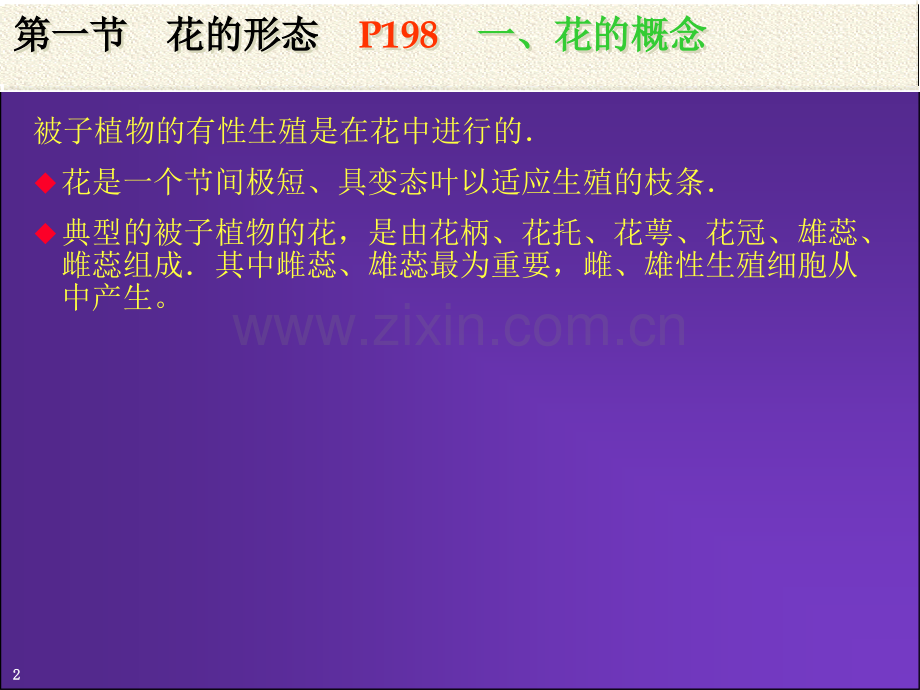 1 1第七章花和果实第七章花和果实第七章花和果实第七章花和果实P198P198繁殖:是生物有机体的重要特征u植物复制与自己相似的新个体以延续种族的现象叫做繁殖。u种子植物繁殖的主要方式有:营养繁殖、无性繁殖和有性繁殖等。u人工营养繁殖在园艺上广泛应用,如分株、扦插、压条和嫁接等。用植物组织培养方法,诱导细胞或组织产生试管苗,以进行无性系快速繁殖,是一项具有开创性前景的生物工程技术。2 2第一节花的形态第一节花的形态第一节花的形态第一节花的形态P198P198一、花的概念一、花的概念一、花的概念一、花的概念被子植物的有性生殖是在花中进行的u花是一个节间极短、具变态叶以适应生殖的枝条u典型的被子植物的花,是由花柄、花托、花萼、花冠、雄蕊、雌蕊组成其中雌蕊、雄蕊最为重要,雌、雄性生殖细胞从中产生。3 3第一节花的形态第一节花的形态第一节花的形态第一节花的形态P198P198一、花的概念一、花的概念一、花的概念一、花的概念4 4第一节花的形态第一节花的形态第一节花的形态第一节花的形态P198P198一、花的概念一、花的概念一、花的概念一、花的概念5 5第一节花的形态第一节花的形态第一节花的形态第一节花的形态P198P198一、花的概念一、花的概念一、花的概念一、花的概念6 6第一节花的形态第一节花的形态第一节花的形态第一节花的形态P199P199二、花的组成二、花的组成二、花的组成二、花的组成7 7第一节花的形态第一节花的形态第一节花的形态第一节花的形态P199P199二、花的组成二、花的组成二、花的组成二、花的组成8 8第一节花的形态第一节花的形态第一节花的形态第一节花的形态P201P201二、花的组成花冠二、花的组成花冠二、花的组成花冠二、花的组成花冠9 9第一节花的形态第一节花的形态第一节花的形态第一节花的形态P201P201二、花的组成花冠二、花的组成花冠二、花的组成花冠二、花的组成花冠1010第一节花的形态第一节花的形态第一节花的形态第一节花的形态P201P201二、花的组成花冠二、花的组成花冠二、花的组成花冠二、花的组成花冠1111第一节花的形态第一节花的形态第一节花的形态第一节花的形态P201P201二、花的组成花冠二、花的组成花冠二、花的组成花冠二、花的组成花冠1212第一节花的形态第一节花的形态第一节花的形态第一节花的形态P199P199二、花的组成:雄蕊二、花的组成:雄蕊二、花的组成:雄蕊二、花的组成:雄蕊u雄蕊由花丝和花药组成u花药一般具四个花粉囊u花粉囊壁由表皮、纤维层、中层和绒毡层组成,绒毡层细胞具多个细胞核,富含营养物质,供花粉发育用u雄蕊类型:雄蕊类型:l1 1、单体雄蕊l2、二体雄蕊l3、多体雄蕊l4、聚药雄蕊l5、二强雄蕊l6、四强雄蕊1313第一节花的形态第一节花的形态第一节花的形态第一节花的形态P199P199二、花的组成:雄蕊二、花的组成:雄蕊二、花的组成:雄蕊二、花的组成:雄蕊1414第一节花的形态第一节花的形态第一节花的形态第一节花的形态P199P199二、花的组成:雌蕊二、花的组成:雌蕊二、花的组成:雌蕊二、花的组成:雌蕊1515第一节花的形态第一节花的形态第一节花的形态第一节花的形态P199P199二、花的组成:雌蕊二、花的组成:雌蕊二、花的组成:雌蕊二、花的组成:雌蕊u组成雌蕊的基本单位是心皮。u心皮是一种适应生殖功能边缘内卷的变态叶。u由于组成雌蕊的心皮数目及心皮离合情况不同,雌蕊有:单雌蕊、复雌蕊(包括离生雌蕊、合生雌蕊)。u雌蕊由柱头、花柱、子房三部分组成。l胚珠着生在子房内l胚珠由珠心、胚囊、珠被、珠孔、珠柄等部分组成,其中最重要的是产生雌配子的胚囊。l胚珠在子房中着生的部位叫胎座胎座有边缘胎座、侧膜胎座、中轴胎座、特立中央胎座等不同类型。1616第一节花的形态第一节花的形态第一节花的形态第一节花的形态P199P199二、花的组成:雌蕊二、花的组成:雌蕊二、花的组成:雌蕊二、花的组成:雌蕊1717第一节花的形态第一节花的形态第一节花的形态第一节花的形态P199P199二、花的组成:雌蕊二、花的组成:雌蕊二、花的组成:雌蕊二、花的组成:雌蕊1818第一节花的形态第一节花的形态第一节花的形态第一节花的形态P209P209四、禾本科植物花的组成四、禾本科植物花的组成四、禾本科植物花的组成四、禾本科植物花的组成u禾本科植物花的形态与一般被子植物的花不同,花被退化为浆片,只有雌蕊和雄蕊花的两侧有内、外稃各一枚,共同组成小花u一至多朵小花一对颖片和小穗轴组成小穗。u多个小穗构成花序但不同植物小花、小穗的数目不尽相同。1919第一节花的形态第一节花的形态第一节花的形态第一节花的形态P209P209四、禾本科植物花的组成四、禾本科植物花的组成四、禾本科植物花的组成四、禾本科植物花的组成2020第一节花的形态第一节花的形态第一节花的形态第一节花的形态P209P209四、禾本科植物花的组成四、禾本科植物花的组成四、禾本科植物花的组成四、禾本科植物花的组成2121第一节花的形态第一节花的形态第一节花的形态第一节花的形态P211P211五、花程式与花图式五、花程式与花图式五、花程式与花图式五、花程式与花图式2222第一节花的形态第一节花的形态第一节花的形态第一节花的形态P211P211五、花程式与花图式五、花程式与花图式五、花程式与花图
