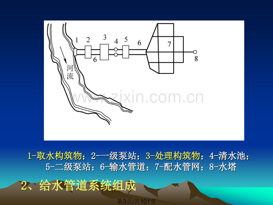 3.1 3.1 给水排水管道系统的任务和组成给水排水管道系统的任务和组成3.2 3.2 给水排水管道系统规划和布置给水排水管道系统规划和布置3.3 3.3 给水排水管道系统主要设计内容、给水排水管道系统主要设计内容、方法和要求方法和要求3.4 3.4 给水排水管道系统运行管理给水排水管道系统运行管理3.5 3.5 给水排水管道材料给水排水管道材料第1页/共101页3.1 3.1 给水排水管道系统的任务和组成给水排水管道系统的任务和组成 给水排水管道系统组成:给水排水管道系统组成:管道(或渠道)和相应附属构筑物管道(或渠道)和相应附属构筑物管道:承担水的输送任务管道:承担水的输送任务附属构筑物:水压提升机水量调控以及污附属构筑物:水压提升机水量调控以及污(废)水和雨水的收集等作用(废)水和雨水的收集等作用 3.1.1 3.1.1 给水管道系统任务和组成给水管道系统任务和组成1 1、给水管道系统示意图、给水管道系统示意图第2页/共101页1-1-1-1-取水构筑物取水构筑物取水构筑物取水构筑物;2-2-2-2-一级泵站;一级泵站;一级泵站;一级泵站;3-3-3-3-处理构筑物处理构筑物处理构筑物处理构筑物;4-4-4-4-清水池;清水池;清水池;清水池;5-5-5-5-二级泵站;二级泵站;二级泵站;二级泵站;6-6-6-6-输水管道;输水管道;输水管道;输水管道;7-7-7-7-配水管网;配水管网;配水管网;配水管网;8-8-8-8-水塔水塔水塔水塔2 2、给水管道系统组成、给水管道系统组成第3页/共101页(1)(1)输水管输水管(渠渠)道道6 6 是指在较长距离内输送水量的管道或渠道是指在较长距离内输送水量的管道或渠道,输水管输水管(渠渠)道一般不沿线向两侧供水。道一般不沿线向两侧供水。(2)(2)配水管网配水管网7 7 是指分布在整个供水区域内的配水管道网络是指分布在整个供水区域内的配水管道网络 (3)(3)泵站泵站2 2、5 5 泵站是输配水系统中的加压设施,一般由多台水泵并联组成泵站是输配水系统中的加压设施,一般由多台水泵并联组成,当水不能靠重力流动时,必须使用水泵对水流增加压力,当水不能靠重力流动时,必须使用水泵对水流增加压力,以使水流有足够的能量克服管道内壁的摩擦阻力,在输配水以使水流有足够的能量克服管道内壁的摩擦阻力,在输配水系统中还要求水被输送到用户连接地点后有符合用水压力要系统中还要求水被输送到用户连接地点后有符合用水压力要求的水压,以克服用水地点的高差及用户的管道系统与设备求的水压,以克服用水地点的高差及用户的管道系统与设备的水流阻力的水流阻力2 2、给水管道系统组成、给水管道系统组成第4页/共101页(4)(4)水量调节设施水量调节设施 有清水池,又称清水库和高位水池有清水池,又称清水库和高位水池(或水塔或水塔)等形等形式。式。(5)(5)给水管道上的附属构筑物给水管道上的附属构筑物 减压设施减压设施用减压阀和节流孔板等降低和稳定输配水系统局用减压阀和节流孔板等降低和稳定输配水系统局部的水压,以避免水压过高造成管道或其他设施部的水压,以避免水压过高造成管道或其他设施的漏水、爆裂、水锤破坏,或避免用水的不舒适的漏水、爆裂、水锤破坏,或避免用水的不舒适感感 检查井、消火栓、阀门井、水表井等等检查井、消火栓、阀门井、水表井等等第5页/共101页3.1.2 3.1.2 排水管道系统的任务和组成排水管道系统的任务和组成1 1、排水管网示意图、排水管网示意图1 1排水管道排水管道2 2水量调节池水量调节池3 3提升泵站提升泵站4 4输水管道输水管道(渠渠)5 5污水处理厂污水处理厂第6页/共101页2 2、排水管道组成、排水管道组成(1)(1)废水收集设施及室内排水管道废水收集设施及室内排水管道 收集住宅及建筑物内废水的各种卫生设备,它收集住宅及建筑物内废水的各种卫生设备,它们既是人们用水的容器,也是承受污水的容器,又们既是人们用水的容器,也是承受污水的容器,又是污水排水系统的起点设备。是污水排水系统的起点设备。(2)(2)排水管道排水管道 指分布于排水区域内的排水管道指分布于排水区域内的排水管道(渠渠),其功能,其功能是将收集到的污水、废水和雨水等输送到处理地点是将收集到的污水、废水和雨水等输送到处理地点或排放口,以便集中处理或排放。或排放口,以便集中处理或排放。第7页/共101页(3)(3)排水管道系统上的构筑物排水管道系统上的构筑物 排水管道系统中设置有雨水口、检查井、跌水排水管道系统中设置有雨水口、检查井、跌水井、溢流井、水封井、换气井、倒虹管等附属构筑井、溢流井、水封井、换气井、倒虹管等附属构筑物及流量等检测设施,便于系统的运行与维护管物及流量等检测设施,便于系统的运行与维护管(4)(4)排水调节池排水调节池 指拥有一定容积的污水、废水和雨水储存设施指拥有一定容积的污水、废水和雨水储存设施(5)(5)提升泵站及压力管道提升泵站及压力管道 排水一般按重力流输送,因此管道需按一定坡排水一般按重力流输送,因此管道需按一定坡度敷设,但往往由于受到地形等条件的限制而需要度敷设,但往往由于受到地形等条件的限制而需要把低处的水向高处提升,这时就需要设置泵站。把低处的水向高处提升,这时就需要设置泵站。第8页/共101页(6)(6)废水输水管废水输水管(渠渠)指长距离输送废水的压力管道或渠道。指长距离输送废水的压力管道或渠道
