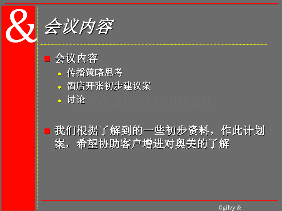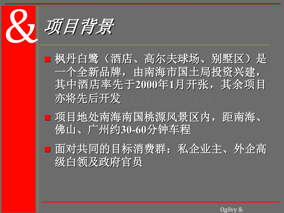 &Ogilvy&Mather会议内容会议内容n n会议内容会议内容会议内容会议内容l l传播策略思考传播策略思考传播策略思考传播策略思考l l酒店开张初步建议案酒店开张初步建议案酒店开张初步建议案酒店开张初步建议案l l讨论讨论讨论讨论n n我我我我们们们们根根根根据据据据了了了了解解解解到到到到的的的的一一一一些些些些初初初初步步步步资资资资料料料料,作作作作此此此此计计计计划划划划案,希望协助客户增进对奥美的了解案,希望协助客户增进对奥美的了解案,希望协助客户增进对奥美的了解案,希望协助客户增进对奥美的了解&Ogilvy&Mather项目背景项目背景n n枫枫枫枫丹丹丹丹白白白白鹭鹭鹭鹭(酒酒酒酒店店店店、高高高高尔尔尔尔夫夫夫夫球球球球场场场场、别别别别墅墅墅墅区区区区)是是是是一一一一个个个个全全全全新新新新品品品品牌牌牌牌,由由由由南南南南海海海海市市市市国国国国土土土土局局局局投投投投资资资资兴兴兴兴建建建建,其其其其中中中中酒酒酒酒店店店店率率率率先先先先于于于于20002000年年年年1 1月月月月开开开开张张张张,其其其其余余余余项项项项目目目目亦将先后开发亦将先后开发亦将先后开发亦将先后开发n n项项项项目目目目地地地地处处处处南南南南海海海海南南南南国国国国桃桃桃桃源源源源风风风风景景景景区区区区内内内内,距距距距南南南南海海海海、佛山、广州约佛山、广州约佛山、广州约佛山、广州约30-6030-60分钟车程分钟车程分钟车程分钟车程n n面面面面对对对对共共共共同同同同的的的的目目目目标标标标消消消消费费费费群群群群:私私私私企企企企业业业业主主主主、外外外外企企企企高高高高级白领及政府官员级白领及政府官员级白领及政府官员级白领及政府官员&Ogilvy&Mather市场目标市场目标n n通通通通过过过过枫枫枫枫丹丹丹丹白白白白鹭鹭鹭鹭系系系系列列列列产产产产品品品品的的的的推推推推出出出出,获获获获得得得得巨巨巨巨大大大大的的的的市场效益市场效益市场效益市场效益l l短期:酒店开张生意兴隆短期:酒店开张生意兴隆短期:酒店开张生意兴隆短期:酒店开张生意兴隆l l长长长长期期期期:高高高高尔尔尔尔夫夫夫夫及及及及别别别别墅墅墅墅陆陆陆陆续续续续推推推推出出出出,形形形形成成成成良良良良好好好好的的的的市市市市场场场场反映反映反映反映&Ogilvy&Mather传播目标传播目标n n希希希希望望望望找找找找到到到到一一一一个个个个有有有有效效效效的的的的传传传传播播播播策策策策略略略略,帮帮帮帮助助助助宣宣宣宣传传传传推推推推广广广广枫枫枫枫丹丹丹丹白白白白鹭鹭鹭鹭系系系系列列列列产产产产品品品品,并并并并协协协协助助助助达达达达成成成成长长长长、短短短短期期期期的市场目标的市场目标的市场目标的市场目标&Ogilvy&Mather传播策略思考传播策略思考产品情况产品情况产品情况产品情况 强弱分析(强弱分析(强弱分析(强弱分析(SWOTSWOT)竞争对手分析竞争对手分析竞争对手分析竞争对手分析消费者分析消费者分析消费者分析消费者分析 传播策略传播策略传播策略传播策略&Ogilvy&Mather产品情况产品情况n n枫丹白鹭酒店:枫丹白鹭酒店:枫丹白鹭酒店:枫丹白鹭酒店:l l投投投投资资资资2 2亿亿亿亿多多多多元元元元的的的的四四四四星星星星级级级级高高高高档档档档酒酒酒酒店店店店,属属属属南南南南海海海海市市市市顶顶顶顶级级级级酒店酒店酒店酒店l l法式风格硬件设施法式风格硬件设施法式风格硬件设施法式风格硬件设施l l超过超过超过超过200200间套房及部分别墅,规模较大间套房及部分别墅,规模较大间套房及部分别墅,规模较大间套房及部分别墅,规模较大l l配套设施档次一流(车氏鲍鱼、仙泉桑拿等)配套设施档次一流(车氏鲍鱼、仙泉桑拿等)配套设施档次一流(车氏鲍鱼、仙泉桑拿等)配套设施档次一流(车氏鲍鱼、仙泉桑拿等)l l人员素质一流人员素质一流人员素质一流人员素质一流n n枫丹白鹭高尔夫球场枫丹白鹭高尔夫球场枫丹白鹭高尔夫球场枫丹白鹭高尔夫球场l l占地占地占地占地10001000亩,在酒店附近,正在施工亩,在酒店附近,正在施工亩,在酒店附近,正在施工亩,在酒店附近,正在施工n n枫丹白鹭别墅区枫丹白鹭别墅区枫丹白鹭别墅区枫丹白鹭别墅区l l高档别墅区,密度极低,推出时间未定高档别墅区,密度极低,推出时间未定高档别墅区,密度极低,推出时间未定高档别墅区,密度极低,推出时间未定&Ogilvy&Mather竞争对手情况竞争对手情况n n分三个层次分三个层次分三个层次分三个层次南国桃园内南国桃园内佛山、南海地区佛山、南海地区 广州地区广州地区&Ogilvy&Mather竞争对手情况竞争对手情况n n酒店:酒店:酒店:酒店:l l南国桃园内南国桃园内南国桃园内南国桃园内 桃桃桃桃源源源源玉玉玉玉宇宇宇宇:有有有有一一一一定定定定历历历历史史史史与与与与口口口口碑碑碑碑,档档档档次次次次一一一一般般般般,熟熟熟熟客客客客不不不不少少少少;尚无明显品牌特征尚无明显品牌特征尚无明显品牌特征尚无明显品牌特征l l南海、佛山南海、佛山南海、佛山南海、佛山 佛佛佛佛山山山山宾宾宾宾馆馆馆馆、金金金金都都都都酒酒酒酒店店店店:距距距距市市市