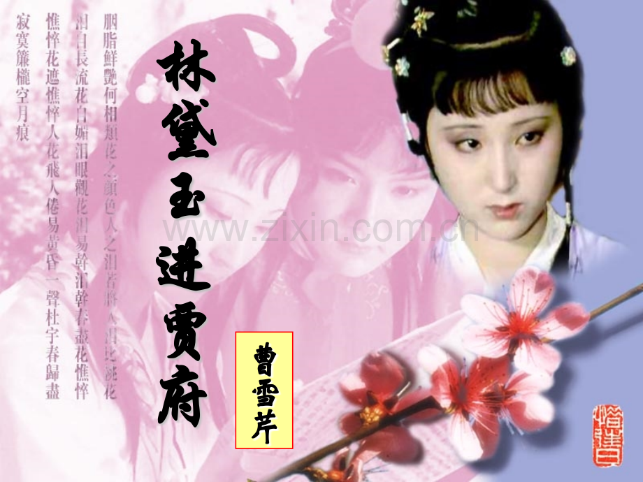 林林黛黛玉玉进进贾贾府府曹曹雪雪芹芹学习目标学习目标1.1.了解了解红楼梦红楼梦及作者,理清故事脉络。及作者,理清故事脉络。2.2.通过对人物肖像、语言、动作、心理的通过对人物肖像、语言、动作、心理的分析,把握林黛玉、贾宝玉、王熙凤等人分析,把握林黛玉、贾宝玉、王熙凤等人物的性格特点。物的性格特点。3.3.认识红楼梦的反封建意义和作者对认识红楼梦的反封建意义和作者对当时社会黑暗现实的批判态度。当时社会黑暗现实的批判态度。红楼梦红楼梦1 1、有关中国的四大著名古典长篇幅小说:即有关中国的四大著名古典长篇幅小说:即西游记西游记吴承恩吴承恩,三国演义三国演义罗贯中罗贯中,水浒传水浒传施耐庵施耐庵,红楼梦红楼梦曹雪芹。曹雪芹。2 2.红楼梦红楼梦原名原名石头记石头记,“红楼红楼”即朱门之意,即朱门之意,是豪门贵族的代称,是豪门贵族的代称,“红楼梦红楼梦”意为无论多么煊赫的意为无论多么煊赫的权势,到头来无非是南柯一梦。权势,到头来无非是南柯一梦。是我国古代小说中最是我国古代小说中最杰出的杰出的现实主义现实主义作品,是我国古典小说的作品,是我国古典小说的顶峰顶峰,所以,所以有人慨叹道:有人慨叹道:“开讲不谈红楼梦,读尽诗书也枉然!开讲不谈红楼梦,读尽诗书也枉然!”全书以宝黛爱情为主线,揭露了封建统治的罪恶和腐朽,揭全书以宝黛爱情为主线,揭露了封建统治的罪恶和腐朽,揭示了封建社会必然灭亡的历史以展趋势。本文选自示了封建社会必然灭亡的历史以展趋势。本文选自红楼梦红楼梦故事的第三回故事的第三回金陵起复贾雨村,荣国府收养林黛玉金陵起复贾雨村,荣国府收养林黛玉,是全,是全书的序幕组成部分之一。本文以林黛玉进贾府的一天行踪为线书的序幕组成部分之一。本文以林黛玉进贾府的一天行踪为线索,通过她的所见所闻,介绍了贾府的一大批批重要人物,展索,通过她的所见所闻,介绍了贾府的一大批批重要人物,展现了贾府与众不同的豪华,拉开了现了贾府与众不同的豪华,拉开了红楼梦红楼梦故事的帷幕。故事的帷幕。3 3.作品问世的时代背景作品问世的时代背景 红楼梦红楼梦,产生于清代产生于清代所谓所谓“河清海晏河清海晏”的的“乾隆乾隆盛世盛世”。当时随着经济的恢。当时随着经济的恢复和发展,资本主义的因素复和发展,资本主义的因素也有了较大发展。这股新生也有了较大发展。这股新生的力量与严重束缚它的封建的力量与严重束缚它的封建主义体系不可避免地产生冲主义体系不可避免地产生冲突。在这样特殊时代及作者突。在这样特殊时代及作者的亲身经历的条件下写的的亲身经历的条件下写的红楼梦红楼梦,以贾、史、王、以贾、史、王、薛四大家族的兴衰为背景薛四大家族的兴衰为背景,以贾宝玉和林黛玉的爱情悲以贾宝玉和林黛玉的爱情悲剧为主线,真实而艺术地反剧为主线,真实而艺术地反映了我国封建社会走向衰亡映了我国封建社会走向衰亡的历史趋势。的历史趋势。康熙年代,是曹家的鼎盛时期,康熙六康熙年代,是曹家的鼎盛时期,康熙六次南巡,以江宁织造署为行宫。雍正继位后,次南巡,以江宁织造署为行宫。雍正继位后,曹家牵连,被抄家,从此衰落,曹雪芹正值曹家牵连,被抄家,从此衰落,曹雪芹正值由盛而衰的过程,由贵公子降为由盛而衰的过程,由贵公子降为“寒士寒士”。这种天壤之别的生活变化不能不引起他对过这种天壤之别的生活变化不能不引起他对过去经历作一番痛苦而深刻的回忆,使他去经历作一番痛苦而深刻的回忆,使他对社对社对社对社会的黑暗产生了不满会的黑暗产生了不满会的黑暗产生了不满会的黑暗产生了不满,这些都为他写出这些都为他写出红红楼梦楼梦这部伟大的作品提供了良好的基础。这部伟大的作品提供了良好的基础。曹雪芹写作曹雪芹写作红楼梦红楼梦的具体年月已的具体年月已无从知晓,只能从第一回中知道他无从知晓,只能从第一回中知道他“于悼红于悼红轩中,披阅十载,增删五次轩中,披阅十载,增删五次”写成。写成。红楼梦红楼梦共共120120回,前回,前80 80 回在曹雪芹回在曹雪芹去世前去世前1010年左右就已经传抄问世。到了年左右就已经传抄问世。到了1818世世末纪,高鹗(末纪,高鹗()续写了后)续写了后4040回,补成了现回,补成了现行的行的120120回本。所以说回本。所以说红楼梦红楼梦绝不是一绝不是一般的文学创作,是曹雪芹饱含血泪写成的。般的文学创作,是曹雪芹饱含血泪写成的。曹雪芹,名霑,字梦曹雪芹,名霑,字梦阮,号雪芹、芹圃、芹溪。阮,号雪芹、芹圃、芹溪。大约生于大约生于17151715年,卒于年,卒于17631763年。历康熙、雍正、年。历康熙、雍正、乾隆三朝。他出身于贵族乾隆三朝。他出身于贵族世家,曾祖曹玺、祖父曹世家,曾祖曹玺、祖父曹寅、父辈曹颙、曹頫祖孙寅、父辈曹颙、曹頫祖孙三代四人,相继连任江宁三代四人,相继连任江宁织造达六十年之久。织造达六十年之久。4 4、作家、作品介绍作家、作品介绍 红楼梦红楼梦的序幕由前五回构成,分别从各个不同角的序幕由前五回构成,分别从各个不同角度,为全书情节的开展,作了必要的交代。度,为全书情节的开展,作了必要的交代。本文选自本文选自红楼梦红楼梦第三回,是全书序幕的