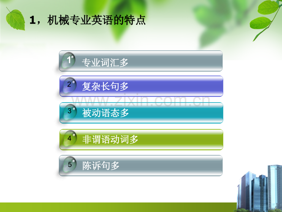 L/O/G/O机械专业英语翻译的方法及技巧机械专业英语翻译的方法及技巧李岱1,机械专业英语的特点,机械专业英语的特点 复杂长句多复杂长句多 被动语态多被动语态多 非谓语动词多非谓语动词多 陈诉句多陈诉句多 5234专业词汇多专业词汇多 1v 1.1 专业词汇多专业词汇多机械工程机械工程专业英英语所涉及的大多是机械工程所涉及的大多是机械工程领域的域的专业知知识,这就要求在翻就要求在翻译的的时候能准确使用机械工程候能准确使用机械工程领域域专业术语,不能望文生,不能望文生义。The main components of the lathe are the headstock and tailstock at opposite ends of a bed,and a tool post between them which holds the cutting tool (车床的主要部件是主床的主要部件是主轴箱、尾座和刀箱、尾座和刀架,主架,主轴箱与尾座位于床身的两端,用于箱与尾座位于床身的两端,用于夹持刀具的刀持刀具的刀架置于主架置于主轴箱与尾座之箱与尾座之间。)v 1.2 复杂长句多复杂长句多机械工程英机械工程英语的用的用词和表达方法都比和表达方法都比较严谨准确,一般准确,一般一句一句话要包含几个分句。要包含几个分句。对于于这种复种复杂长句,一般要采句,一般要采用用压缩主干法主干法进行逐步翻行逐步翻译。If a hard grade wheel was to be used for grinding a hard material,the dull grains would not be pulled off from the bond quickly enough,thus impeding the self dressing process of the surface of the wheel and finally resulting in clogging of the wheel and burns on the ground surface (如果使用硬砂如果使用硬砂轮磨削硬的材料,磨磨削硬的材料,磨钝的磨粒就不能很快从粘的磨粒就不能很快从粘结体上脱体上脱落,落,这样便妨碍砂便妨碍砂轮表面的自休整表面的自休整过程,最程,最终导致砂致砂轮的堵塞并在被磨表面留下灼斑。的堵塞并在被磨表面留下灼斑。)v 1.3 被动语态多被动语态多v械工程英械工程英语使用被使用被动语态的占的占 l/3 以上,大量使用的原因主要有以上,大量使用的原因主要有以下几个方面:以下几个方面:(1)强调主主语,突出重要性,突出重要性 例:例:Springs are used as cushions to absorb shock (弹簧被用作吸收振簧被用作吸收振动的的缓冲器。冲器。)(2)不需要指出不需要指出动作的作的执行者行者 例:例:When a force is applied to a materia1.It produces a stress in the materia1 (当当给材料施加力材料施加力时,就会,就会产生生应力。力。)(3)无法指出无法指出动作作执行者行者 例:例:In most machine members,the deformation must be kept low (大多数的机械零件其大多数的机械零件其变形量都求很低。形量都求很低。)v 1.4 非谓语动词多非谓语动词多机械工程机械工程专业英英语中很多中很多动词在一句在一句话中采用分中采用分词或不或不定式的形式来起到修定式的形式来起到修饰的作用。在翻的作用。在翻译的的过程中要搞清程中要搞清楚各部分之楚各部分之间的修的修饰关系。关系。The simplest example is a blacksmiths forging of a hot piece of metal by hammering the workpiece on an anvil (最最简单的例子就是的例子就是铁匠在砧座上用匠在砧座上用锤子子锻打打红热的金属的金属块。)v 1.5 陈述句多陈述句多机械工程英机械工程英语文章要求叙述准确,推理文章要求叙述准确,推理严谨,因而多采,因而多采用用陈述句,述句,对于于问句、感句、感叹句等句等则很少很少见。前面几个例。前面几个例子均属子均属陈述句。述句。v 2.2 压缩主干法压缩主干法 分析句子成分一分析句子成分一压缩找主干一翻找主干一翻译主干部分逐步添加修主干部分逐步添加修饰成分一完整通成分一完整通顺表达表达Perhaps the simplest flexible coupling(permitting small amounts of axial misalignment and/for torsional flexibility)consists of a piece of elastic material(bonded to two separated collinear cylindrical members)(which in turn can be fastened onto the two shafts by means of setscrews or other fasteners )主干部分:flexible coupling consists of a piece of elastic materia1(柔性联轴器由一个弹性材料构成。)v 2.2 压缩主干法压缩主干法 Perhaps the simplest flexible coupling(permitting small amounts of axial misalignment and/for torsional flexibility)consists of a piece of elastic material(bonded to two separated collinear cylindrical members)(which in turn can be fastened onto the two shafts by means of setscrews or other fasteners )主干部分:flexible coupling consists of a piece of elastic materia1(柔性联轴器由一个弹性材料构成。)v 2.2 压缩主干法压缩主干法 分析句子成分一分析句子成分一压缩找主干一翻找主干一翻译主干部分逐步添加修主干部分逐步添加修饰成分一完整通成分一完整通顺表达表达Perhaps the simplest flexible coupling(permitting small amounts of axial misalignment and/for torsional flexibility)consists of a piece of elastic material(bonded to two separated collinear cylindrical members)(which in turn can be fastened onto the two shafts by means of setscrews or other fasteners )完整通顺表达:也许,允许少量轴向对中偏差和(或)扭转弹性的最简单的柔性联轴器具有如下结构:将一个弹性材料固接在两个分离共线的圆筒形构件上,再通过定位螺钉或其他紧固件将其固定在两个轴上。v 2.3 增词法和减词法增词法和减词法为了修辞目的而增加一些了修辞目的而增加一些连贯词:Manganese is a hard,brittle,gray-white meta1 (锰是一种灰白色的,又硬又是一种灰白色的,又硬又脆的金属。