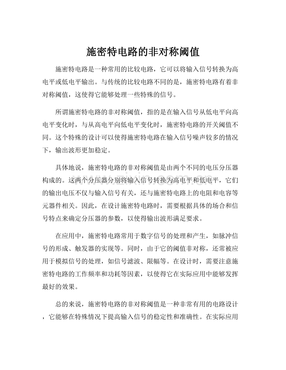 总的来说,施密特电路的非对称阈值是一种非常有用的电路设计,它能够在特殊情况下提高输入信号的稳定性和准确性。在实际应用中,需要根据具体情况进行设计和参数选择,以满足对应用性能的要求。