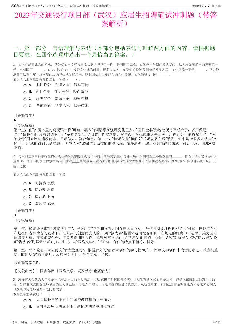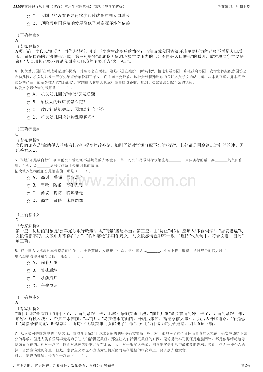 2023年交通银行项目部(武汉)应届生招聘笔试冲刺题(带答案解析)一、第一部分言语理解与表达(本部分包括表达与理解两方面的内容。请根据题目要求,在四个选项中选出一个最恰当的答案。)1、文化不是有钱人的游戏,以为就如只要有钱就能买到名牌包包一样,瞬间即可完成。文化也不是幻想者的梦想,以为就如魔术里的鸡变鸭一样,立刻即可_。如今,谈论文化、投资文化成为时髦。很多人以为,在我们的经济得到长足发展之后,文化就能一下子_;以为经济都可以在当年几近崩溃的边缘飞快地发展起来,以我国如此历史悠久的文化传统,文化的腾飞同样_。依次填入划横线部分最恰当的一项是()。A 脱胎换骨升堂入室倚马可待 B 面目全非捷足先登轻而易举 C 超脱尘俗繁荣昌盛稳操胜算 D 革故鼎新登堂入室信手拈来正确答案A专家解析第一空,由“如魔术里的鸡变鸭一样”可知,填入的词语意在强调变化巨大。“面目全非”形容改变得不成样子,多用做贬义;“超脱尘俗”没有强调变化;“革故鼎新”革除旧弊,创立新制,多指改朝换代或重大变革等,用在此处主谓搭配不当。“脱胎换骨”用来比喻痛改前非,重新做人,符合句意。第二空,“捷足先登”和前文“长足发展之后”矛盾;句中是指很多人认为“文化一下子”就能得到长足发展,“升堂入室”比喻学识或技能由浅入深,循序渐进,逐步达到很高的成就,符合句意。因此A项正确。2、与人们想象中孤独挖掘内心或者寻找灵感的传统写作不同,网络文学生产仿佛一场在相同时空里不断发生的 ,作者和读者之间存在大量互动,写作与阅读过程紧密结合。读者 至关重要,读者对创作的参与性也大大增强,作者和读者共同汇聚“创意”,实现作品的创造、更新和进化。依次填入画横线部分最恰当的一项是:A对抗赛 沉浸 B接力赛 反馈 C擂台赛 服务 D淘汰赛 感受正确答案B专家解析第一空,横线处修饰“网络文学生产”,根据后文“作者和读者之间存在大量互动,写作与阅读过程紧密结合”可知,网络文学生产是在作者和读者的互动下,汇聚共同创意而完成的。B项“接力赛”指团体运动竞赛项目,在规定的距离中,选手于接力区内传递接力棒,接替跑完全程,主要考查团队合作,能够对应“互动、紧密结合”的特点,保留。A项“对抗赛”、C项“擂台赛”、D项“淘汰赛”均强调相互对抗、比试,与“网络文学生产”互动、合作的特点不相符,排除。第二空,代入验证。对应前文的“大量互动”,根据后文的“读者对创作的参与性”可知,网络文学创作中读者的意见、反应很重要,B项“反馈”指(信息、反应等)返回,符合文意,当选。故正确答案为B。【文段出处】中国青年网网络文学:既要秩序 也要活力3、或许有人会认为人口多是环境资源压力的主要来源,可以说30年前我国开始实行计划生育的时候的确是这样,但是现在情况已经发生了改变。当前造成我国资源环境主要压力的已经不再是人口增长,而是传统的经济增长方式。从现在看来,我们已经有足够的能力和办法来协调人口发展与资源环境约束之间的关系。本段文字主要说明()。A 人口增长已经不再是我国资源环境的主要压力 B 我国资源环境的真正压力是传统的经济增长方式2023年交通银行项目部(武汉)应届生招聘笔试冲刺题(带答案解析)考前练习,冲刺上岸含常识判断、言语理解、判断推理、数量关系、资料分析等题型第1页 C 我国已经没有必要再继续通过政策控制人口增长 D 现阶段中国经济的发展降低了对资源环境的依赖正确答案A专家解析A项正确,文段以“但是”一词作为转折,引出下文发生改变后的情况:当前造成我国资源环境主要压力的已经不再是人口增长,而是传统的经济增长方式。第三句解释“造成我国资源环境主要压力的已经不再是人口增长”的原因,故本段文字主要是说明“人口增长已经不再是我国资源环境的主要压力”这一观点。4、机关幼儿园所获财政补贴逐年提高,难免令公众质疑,这是不是在维护一种“特权”。相比街道办园、乡镇政府办园、农村集体组织办园等公办幼儿园,机关幼儿园一般优先配置给单位职工子女,而不向社会开放。这种受到特殊照顾的公职人员子女的幼儿园,从本质来说,并非完全的公共产品,而是少数人的“自留地”。拿纳税人的钱为其逐年提高财政补贴,加剧了幼教资源分配不公的状况。这段文字最恰当的标题是()。A 机关幼儿园的“特权”引发质疑 B 纳税人的钱应该怎么花?C 过度补贴机关幼儿园加剧社会不公 D 机关幼儿园应该特殊照顾吗?正确答案C专家解析文段的论点是“拿纳税人的钱为其逐年提高财政补贴,加剧了幼教资源分配不公的状况”。其他都是围绕论点进行的论述。因此答案选C。5、“徒法不足以自行”。在目前公车管理还不甚规范的大环境下,单一的公车尾号限行政策值得_。真要实行的话,要_其负面作用。至少,要_拿出措施防止公车因此而增加。依次填入划横线部分最恰当的一项是()。A 商讨警惕居安思危 B 商量防备有备无患 C 商议提防临阵磨枪 D 商榷谨防未雨绸缪正确答案D专家解析第一空,词语的对象是“公车尾号限行政策”,与“商量”搭配不当。第三空,由“防止”可知,应填入“未雨绸缪”。“居安思危”与文段语意不符,文段中并不存在“安”,“临阵磨枪”多用作贬义,与文段感情色彩不一致。“谨防