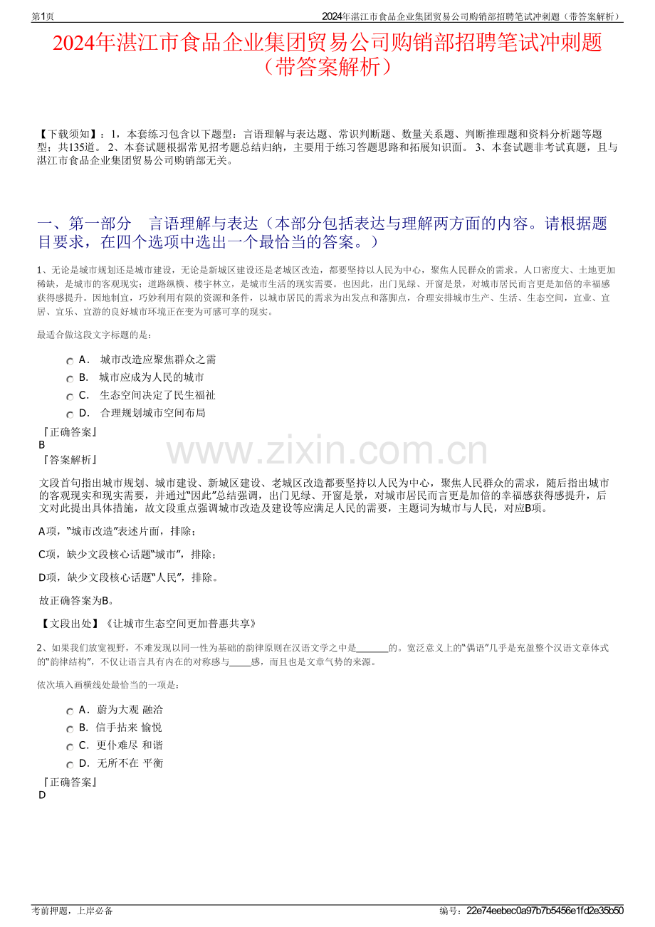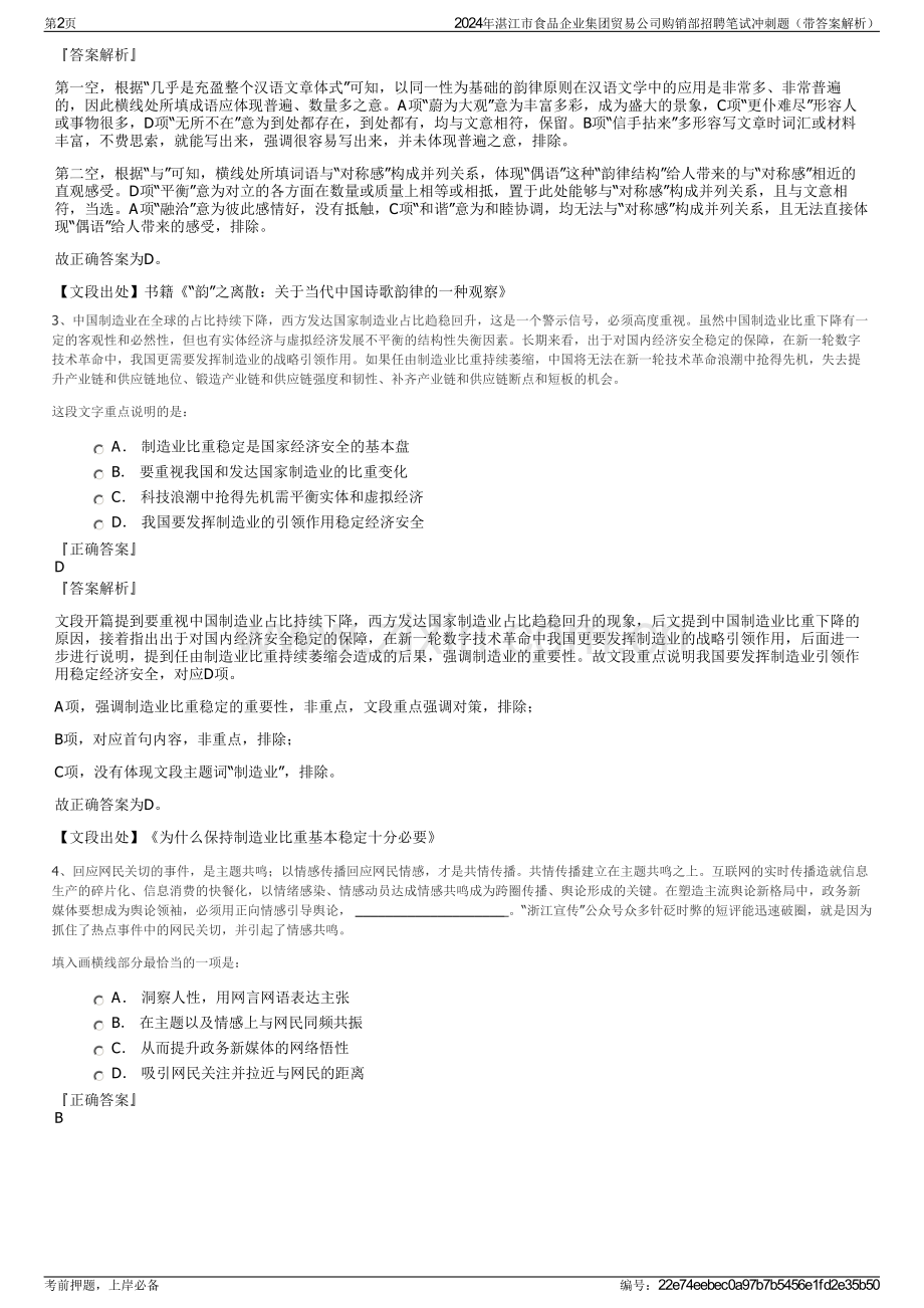2024年湛江市食品企业集团贸易公司购销部招聘笔试冲刺题(带答案解析)【下载须知】:1,本套练习包含以下题型:言语理解与表达题、常识判断题、数量关系题、判断推理题和资料分析题等题型;共135道。2、本套试题根据常见招考题总结归纳,主要用于练习答题思路和拓展知识面。3、本套试题非考试真题,且与湛江市食品企业集团贸易公司购销部无关。一、第一部分言语理解与表达(本部分包括表达与理解两方面的内容。请根据题目要求,在四个选项中选出一个最恰当的答案。)1、无论是城市规划还是城市建设,无论是新城区建设还是老城区改造,都要坚持以人民为中心,聚焦人民群众的需求。人口密度大、土地更加稀缺,是城市的客观现实;道路纵横、楼宇林立,是城市生活的现实需要。也因此,出门见绿、开窗是景,对城市居民而言更是加倍的幸福感获得感提升。因地制宜,巧妙利用有限的资源和条件,以城市居民的需求为出发点和落脚点,合理安排城市生产、生活、生态空间,宜业、宜居、宜乐、宜游的良好城市环境正在变为可感可享的现实。最适合做这段文字标题的是:A 城市改造应聚焦群众之需 B 城市应成为人民的城市 C 生态空间决定了民生福祉 D 合理规划城市空间布局正确答案B答案解析文段首句指出城市规划、城市建设、新城区建设、老城区改造都要坚持以人民为中心,聚焦人民群众的需求,随后指出城市的客观现实和现实需要,并通过“因此”总结强调,出门见绿、开窗是景,对城市居民而言更是加倍的幸福感获得感提升,后文对此提出具体措施,故文段重点强调城市改造及建设等应满足人民的需要,主题词为城市与人民,对应B项。A项,“城市改造”表述片面,排除;C项,缺少文段核心话题“城市”,排除;D项,缺少文段核心话题“人民”,排除。故正确答案为B。【文段出处】让城市生态空间更加普惠共享2、如果我们放宽视野,不难发现以同一性为基础的韵律原则在汉语文学之中是 的。宽泛意义上的“偶语”几乎是充盈整个汉语文章体式的“韵律结构”,不仅让语言具有内在的对称感与 感,而且也是文章气势的来源。依次填入画横线处最恰当的一项是:A蔚为大观 融洽 B信手拈来 愉悦 C更仆难尽 和谐 D无所不在 平衡正确答案D第1页2024年湛江市食品企业集团贸易公司购销部招聘笔试冲刺题(带答案解析)考前押题,上岸必备编号:22e74eebec0a97b7b5456e1fd2e35b50答案解析第一空,根据“几乎是充盈整个汉语文章体式”可知,以同一性为基础的韵律原则在汉语文学中的应用是非常多、非常普遍的,因此横线处所填成语应体现普遍、数量多之意。A项“蔚为大观”意为丰富多彩,成为盛大的景象,C项“更仆难尽”形容人或事物很多,D项“无所不在”意为到处都存在,到处都有,均与文意相符,保留。B项“信手拈来”多形容写文章时词汇或材料丰富,不费思索,就能写出来,强调很容易写出来,并未体现普遍之意,排除。第二空,根据“与”可知,横线处所填词语与“对称感”构成并列关系,体现“偶语”这种“韵律结构”给人带来的与“对称感”相近的直观感受。D项“平衡”意为对立的各方面在数量或质量上相等或相抵,置于此处能够与“对称感”构成并列关系,且与文意相符,当选。A项“融洽”意为彼此感情好,没有抵触,C项“和谐”意为和睦协调,均无法与“对称感”构成并列关系,且无法直接体现“偶语”给人带来的感受,排除。故正确答案为D。【文段出处】书籍“韵”之离散:关于当代中国诗歌韵律的一种观察3、中国制造业在全球的占比持续下降,西方发达国家制造业占比趋稳回升,这是一个警示信号,必须高度重视。虽然中国制造业比重下降有一定的客观性和必然性,但也有实体经济与虚拟经济发展不平衡的结构性失衡因素。长期来看,出于对国内经济安全稳定的保障,在新一轮数字技术革命中,我国更需要发挥制造业的战略引领作用。如果任由制造业比重持续萎缩,中国将无法在新一轮技术革命浪潮中抢得先机,失去提升产业链和供应链地位、锻造产业链和供应链强度和韧性、补齐产业链和供应链断点和短板的机会。这段文字重点说明的是:A 制造业比重稳定是国家经济安全的基本盘 B 要重视我国和发达国家制造业的比重变化 C 科技浪潮中抢得先机需平衡实体和虚拟经济 D 我国要发挥制造业的引领作用稳定经济安全正确答案D答案解析文段开篇提到要重视中国制造业占比持续下降,西方发达国家制造业占比趋稳回升的现象,后文提到中国制造业比重下降的原因,接着指出出于对国内经济安全稳定的保障,在新一轮数字技术革命中我国更要发挥制造业的战略引领作用,后面进一步进行说明,提到任由制造业比重持续萎缩会造成的后果,强调制造业的重要性。故文段重点说明我国要发挥制造业引领作用稳定经济安全,对应D项。A项,强调制造业比重稳定的重要性,非重点,文段重点强调对策,排除;B项,对应首句内容,非重点,排除;C项,没有体现文段主题词“制造业”,排除。故正确答案为D。【文段出处】为什么保持制造业比重基本稳定十分必要4、回应网民关切的事件,是主题共鸣;以情感传播回应网民情感,才是共情传播。共情传播建立在主题共鸣之上。互联网的实时传播造就信息生产的碎片化、信息消费的快餐化,以情绪感染、情感动员达成情感共鸣成为跨圈传播、舆论形成的