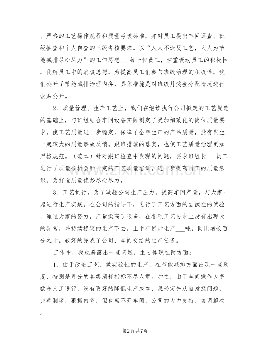 2、质量管理。生产工艺上,我们在继续执行公司拟定的工艺规范的基础上,与班组结合车间设备实际制定了更加细致化的岗位质量要求,使工艺质量进一步稳定,保障了全年生产的产品质量,没有发生一起较大的质量事故反馈。跟班措施的落实,也使工艺质量治理更加严格规范。(范本)针对跟班检查中发现的问题,要求班组长___员工进行了质量分析会和一定的工艺质量培训。进一步提高员工的质量意识,为打造质量优势尽心尽力。