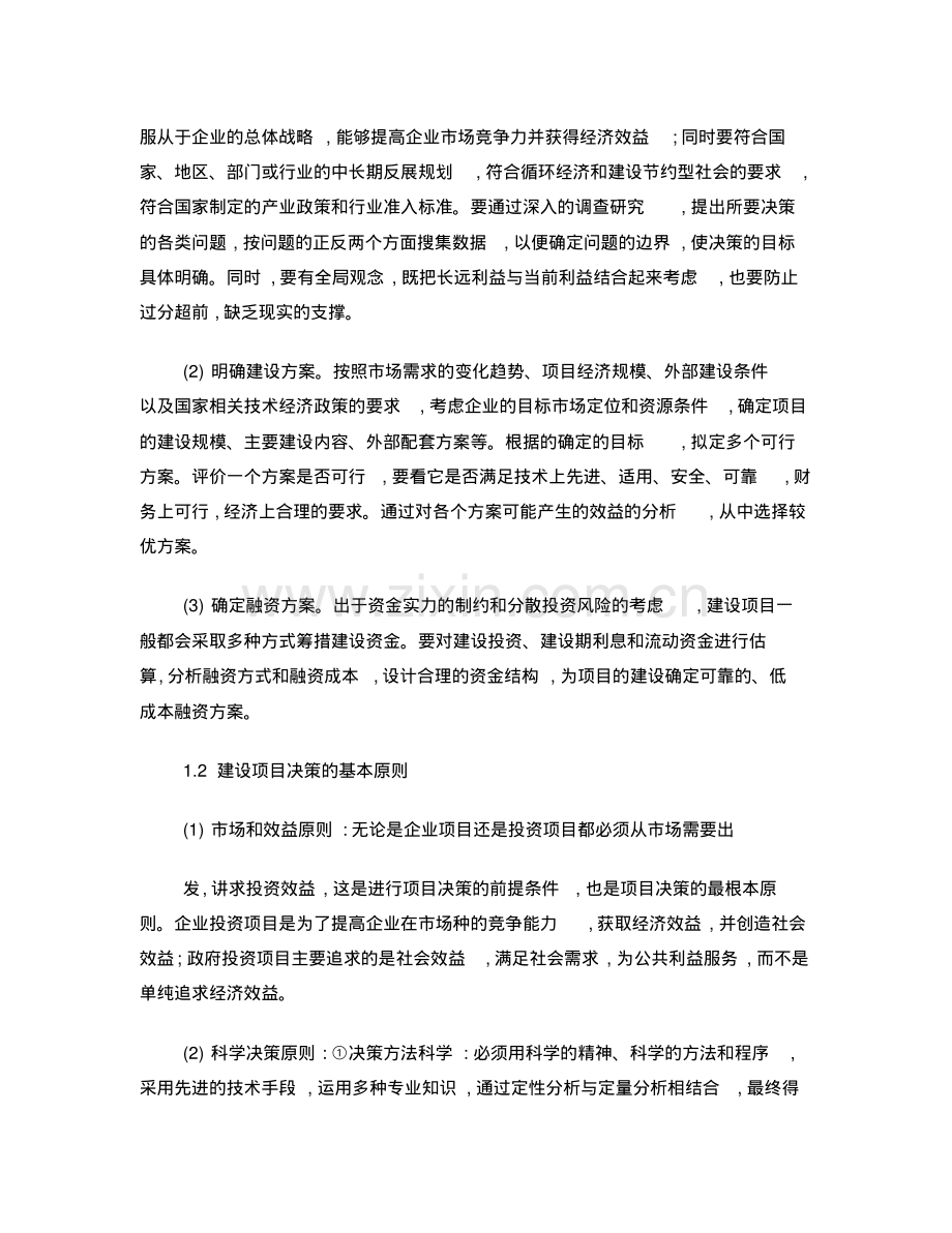浅谈工程项目全过程管理全过程管理主要包括立项、设计、招投标、实施(施工)、验收、试生产、后评估等阶段。1 项目决策立项决策是为达到某一目的,对若干可行方案进行分析、比较、判断,从中选择较优的方案的过程,是在权衡各种矛盾、各种因素相互影响后做出的选择。长期以来,决策主要依据经验而做出。随着科学技术的发展,人类活动范围的扩大,检验决策逐渐被科学决策所取代。决策过程可以分为四个相互联系的阶段。即信息收集阶段、方案设计阶段、方案评价阶段序、方案抉择阶段。这四个阶段相互交织、往复循环,贯穿于整个决策过程。建设项目投资决策是指决策单位或决策者按照客观的建设程序,根据投资方向、投资布局大战略构想,充分考虑国家有关的方针政策,在广泛占有信息资料的基础上,对拟建项目进行技术经济分析和多种角度的综合分析评价,决定项目是否建设,在什么地方建设,选择并确定项目建设的较优方案。建设项目投资决策对于项目的成败具有决定性的作用。一个项目从投资意向到投资结束至项目运营的全过程,从项目周期的角度看,一般可以分为五个阶段,既决策阶段、实施前准备阶段、实施阶段、投产竣工阶段和生产运营阶段。其中决策阶段决定了项目的建设规模、产品方案、工艺技术、投资规模、融资方案的关键事项,由于投资的不可逆转性,既投资决策一旦做出,项目开始建设,已完成的投资形成的实物工程量就难以改变。其中任何一项的失误,都将可能导致项目的失败。1.1 建设项目决策的任务(1)确定投资目标。建设项目决策的目的就是达到预定的投资目标,因此,确定投资目标是建设项目的前提。如果投资的目标不明确或不适应环境的需要,最终的决策也就不可能正确。确定投资目标,要有正确的指导思想,企业投资目标首先必须服从于企业的总体战略,能够提高企业市场竞争力并获得经济效益;同时要符合国家、地区、部门或行业的中长期反展规划,符合循环经济和建设节约型社会的要求,符合国家制定的产业政策和行业准入标准。要通过深入的调查研究,提出所要决策的各类问题,按问题的正反两个方面搜集数据,以便确定问题的边界,使决策的目标具体明确。同时,要有全局观念,既把长远利益与当前利益结合起来考虑,也要防止过分超前,缺乏现实的支撑。(2)明确建设方案。按照市场需求的变化趋势、项目经济规模、外部建设条件以及国家相关技术经济政策的要求,考虑企业的目标市场定位和资源条件,确定项目的建设规模、主要建设内容、外部配套方案等。根据的确定的目标,拟定多个可行方案。评价一个方案是否可行,要看它是否满足技术上先进、适用、安全、可靠,财务上可行,经济上合理的要求。通过对各个方案可能产生的效益的分析,从中选择较优方案。(3)确定融资方案。出于资金实力的制约和分散投资风险的考虑,建设项目一般都会采取多种方式筹措建设资金。要对建设投资、建设期利息和流动资金进行估算,分析融资方式和融资成本,设计合理的资金结构,为项目的建设确定可靠的、低成本融资方案。1.2 建设项目决策的基本原则(1)市场和效益原则:无论是企业项目还是投资项目都必须从市场需要出发,讲求投资效益,这是进行项目决策的前提条件,也是项目决策的最根本原则。企业投资项目是为了提高企业在市场种的竞争能力,获取经济效益,并创造社会效益;政府投资项目主要追求的是社会效益,满足社会需求,为公共利益服务,而不是单纯追求经济效益。(2)科学决策原则:决策方法科学:必须用科学的精神、科学的方法和程序,采用先进的技术手段,运用多种专业知识,通过定性分析与定量分析相结合,最终得出科学合理的结论和意见,使分析结论准确可靠。决策依据充分:决策要掌握大量的信息,依据根据有关政策,充分了解项目的建设条件、技术发展趋势和市场环境状况,使决策优科学依据。数据资料可靠:必须坚持实事求是的立场,一切从实际出发,尊重事实,在调查研究的基础上,注重数据分析,保证分析结论真实可靠。(3)风险责任原则:按照投资制度改革的目标,“谁投资、谁决策、谁受益、谁承担风险”,强调建设项目决策的责任制度。1.3 建设项目决策的一般程序企业投资决策,特别是大型项目的投资决策,因为投资规模较大,关系到企业的长远发展。应按照公司法人治理结构的权责划分,经理层讨论后,报决策层进行审定,特别重大的投资决策还好报股东大会讨论通过。有的企业投资项目,是由项目的发起人及其他投资人出资,组建具有独立法人资格的项目公司,由出资人或其授权结构对项目进行投资决策。企业投资决策是一个研究逐步深化的过程,从投资机会研究,到初步可行性研究,再到可行性研究和项目评估,分析逐步深入,建设项目的价值逐步明了,建设内容和方案逐步确定。2 设计管理工程设计过程不仅是施工前的工作,工程设计要贯穿工程建设的全过程。建设项目在资源综合利用和选定的设计标准是否科学合理,厂(场)区和工程的布置是否紧凑适度,生产组织是否科学严谨,技术、工艺流程是否先进合理、设备选型是否合适与匹配,能否用较少的投资,取得产量多、质量好、消耗少、成本低、效益高的综合效果等等,在很大程度上取决于工程设计质量的好坏和水平的高低。工程设计质量、采