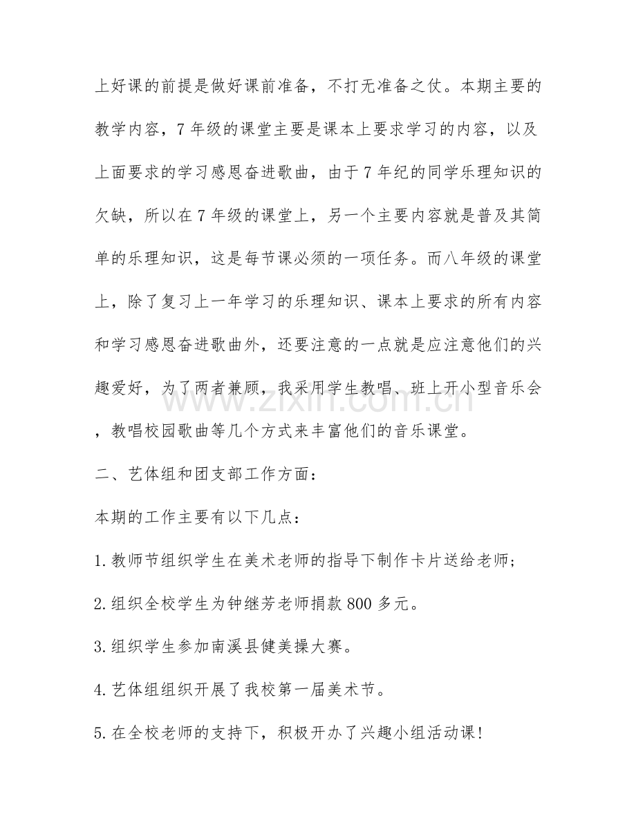 我本期担任学校七、八年纪的音乐教师,以及学校艺体组教研组长,团支部书记等工作。以下就几个方面对本期的工作进行总结: