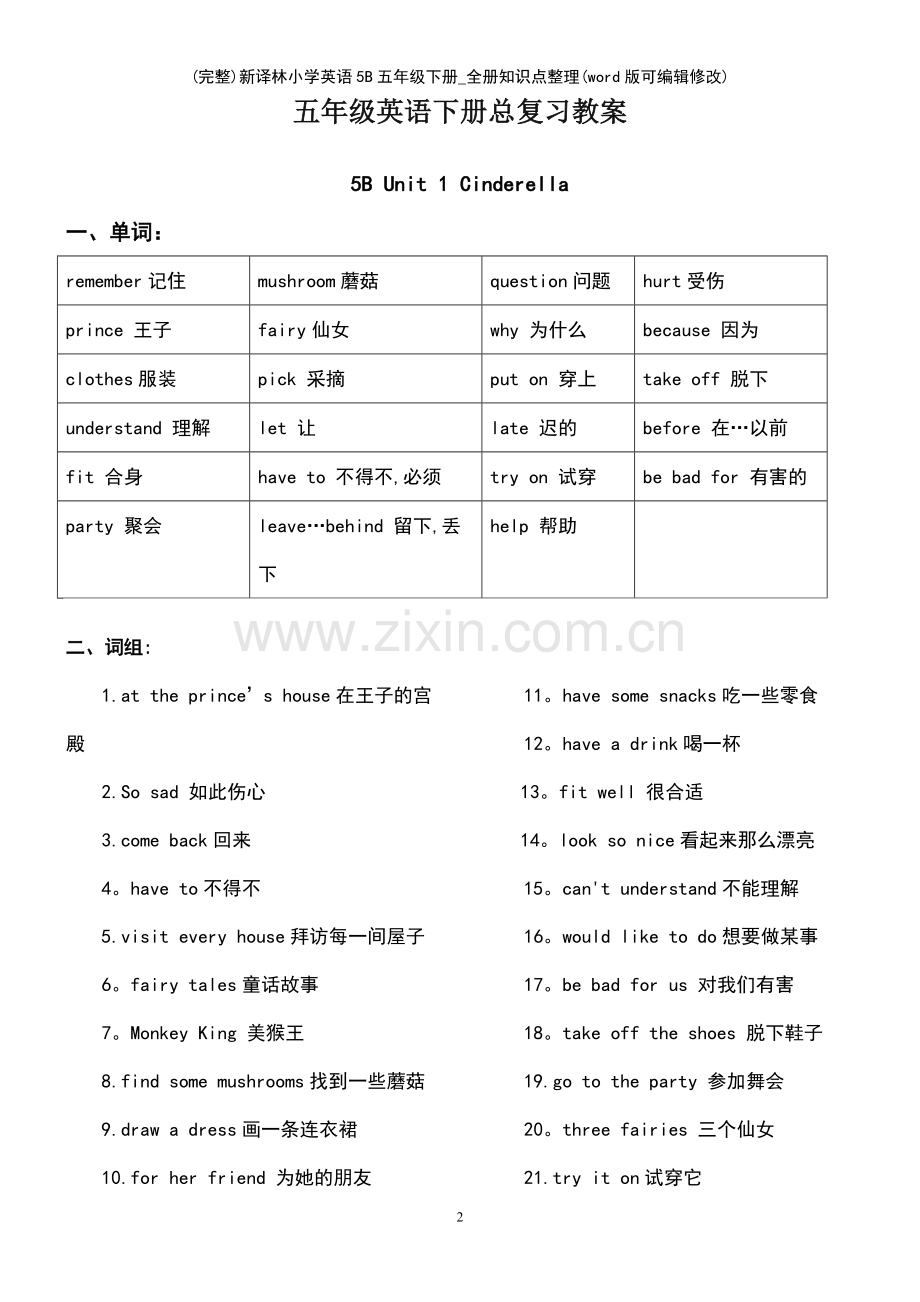 (完整)新译林小学英语 5B 五年级下册_全册知识点整理(word 版可编辑修改)1(完整)新译林小学英语 5B 五年级下册_全册知识点整理(word 版可编辑修改)编辑整理:尊敬的读者朋友们:这里是精品文档编辑中心,本文档内容是由我和我的同事精心编辑整理后发布的,发布之前我们对文中内容进行仔细校对,但是难免会有疏漏的地方,但是任然希望((完整)新译林小学英语 5B 五年级下册_全册知识点整理(word 版可编辑修改))的内容能够给您的工作和学习带来便利。同时也真诚的希望收到您的建议和反馈,这将是我们进步的源泉,前进的动力。本文可编辑可修改,如果觉得对您有帮助请收藏以便随时查阅,最后祝您生活愉快 业绩进步,以下为(完整)新译林小学英语 5B 五年级下册_全册知识点整理(word 版可编辑修改)的全部内容。(完整)新译林小学英语 5B 五年级下册_全册知识点整理(word 版可编辑修改)2五年级英语下册总复习教案五年级英语下册总复习教案5B Unit 1 Cinderella 5B Unit 1 Cinderella 一、单词:一、单词:remember 记住 mushroom 蘑菇 question 问题 hurt 受伤prince 王子fairy 仙女why 为什么 because 因为 clothes 服装pick 采摘put on 穿上take off 脱下understand 理解 let 让late 迟的before 在以前fit 合身 have to 不得不,必须 try on 试穿be bad for 有害的party 聚会leavebehind 留下,丢下help 帮助二、词组:二、词组:1.at the princes house 在王子的宫殿 2.So sad 如此伤心e back 回来 4。have to 不得不5.visit every house 拜访每一间屋子 6。fairy tales 童话故事7。Monkey King 美猴王 8.find some mushrooms 找到一些蘑菇9.draw a dress 画一条连衣裙 10.for her friend 为她的朋友11。have some snacks 吃一些零食 12。have a drink 喝一杯13。fit well 很合适 14。look so nice 看起来那么漂亮15。cant understand 不能理解 16。would like to do 想要做某事17。be bad for us 对我们有害 18。take off the shoes 脱下鞋子19.go to the party 参加舞会 20。three fairies 三个仙女21.try it on 试穿它 (完整)新译林小学英语 5B 五年级下册_全册知识点整理(word 版可编辑修改)322.have to go 不得不走23.before twelve oclock 在 12 点以前 24.at the parties 在那些聚会上25.beautiful clothes 美丽的衣服 26。a lot of mushrooms 许多蘑菇27。under the tree 在树下 28。try on the shoe 试穿鞋子29.eat them 吃了它 30.find the girl 找到女孩31。why cant you你为什么不能 32。leavebehind 丢下33.hurry up 赶快 34.find some drinks 找到一些饮料35。some question words 一些疑问词 36.fit me 适合我37.draw a picture for me 为我画一幅画 38.have a drink 喝一份饮料39。look so nice 看起来那么漂亮 40.be at school 在校学习41.read a story about读一个有关的故事42.pick a big and red mushroom 采一个又大又红的蘑菇三、句子:三、句子:1。Come and help me.过来帮我。2。Why are you so sad,dear?亲爱的,为什么你这样伤心?3。Because I dont have any nice clothes or shoes。因为我没有任何漂亮的衣服和鞋子。4。Hurry up!快点!5。We can eat them。我们可以吃它们了。6。What a pity!真可惜!7。Why cant you go to the party?你为什么不能去参加舞会?8。My foot hurts!我的脚受伤了!(完整)新译林小学英语 5B 五年级下册_全册知识点整理(word 版可编辑修改)49。I like reading stories about the Monkey King and Nezha.我喜欢读猴王和哪吒的故事。10.Because these mushrooms are bad for us.因为这些蘑菇对我们有害的.11。Cinderella has a good time at the party.灰姑娘在舞会上度过了美好时光。12.Many girls try on the shoe,but it does not fit.许多女孩试穿这只鞋,但是不合适。13。Why is Yang Ling not at school today?杨玲为什么今天不在学校?14.Why does Nancy take off her coat?南希为什么脱下她的外套?15.She leaves a shoe behind.她留下一只鞋。Unit 2 How do you come to school 知识点Unit 2 How do you come to school 知识点一、单词一、单词near 在附近by乘(汽车、火车等)bus 公共汽车,大巴士ship 轮船metro 地铁taxi 出租车,的士 bike 自行车 plane 飞机train 火车 ride 骑车show 给看basket 篮子city 城市street 街,街道young 年幼的on foot 步行 二、短语 二、短语 come to school 到学校来 your new home 你的新家far from 离远 by bus 乘公共汽车near school 在学校附近on foot 步行by metro 乘地铁 by taxi 乘出租车taxi driver 出租车司机by car 乘小轿车(完整)新译林小学英语 5B 五年级下册_全册知识点整理(word 版可编辑修改)5by bike 骑自行车 by plane 乘飞机by ship 乘轮船by train 乘火车on the street 在街上through the trees 穿过树林taxi driver 出租车司机get there 到达那里in the basket 在篮子里think so 认为如此too young 太年轻了,太小了go to school 去学校showto向展示want to+动词原形 想要a new bike 一辆新的自行车the wheels on the bus 公共汽车的轮子sit in the basket 坐在篮子里go round and round 转啊转三、句型三、句型1.Do you like your new home?你喜欢你的新家吗?解析:do 是助动词,其第三人称单数形式是 does,否定形式分别为:dont 和 doesnt。助动词开头的句子是一般疑问句,一般用“Yes,do/does。”或“No,dont/doesnt。来回答。2。Where do you live?你住在哪里?解析:where 是特殊疑问词,用来引导特殊疑问句,其回答不能简单地回答 yes 或者 no,而是要根据具体所问来回答,比如这里可以用“I live+表示方位的词语来回答。当主语是第三人称单数时,则用“Where doeslive?”来提问,回答时谓语动词也相应地使用其第三人称单数形式“。.。lives”。3。How do you come to school?你是怎样到学校来的?(完整)新译林小学英语 5B 五年