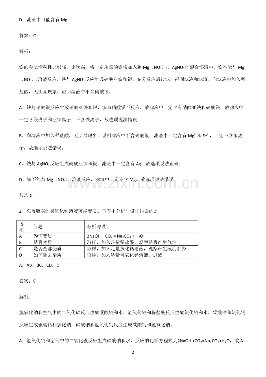 1 (每日一练每日一练)人教版初中化学第十一章盐化肥全部重要知识点人教版初中化学第十一章盐化肥全部重要知识点 单选题 1、2021 年 12 月 31 日晚上 7:00,国家主席习近平发表 2022 年新年贺词,文中提到“人不负青山,青山定不负人”。下列说法或做法中,不利于保护生态环境的是 A加高工厂烟囱能消除有害废气对空气的污染 B用无磷洗涤剂,能有效减少水体污染 C工业废水达标排放,有利于保护水资源 D合理施用农药和化肥 答案:A 解析:A、加高工厂烟囱不能减少有害废气的排放,所以不能防止有害废气对空气的污染,不利于保护生态环境。故A 错误;B、用无磷洗涤剂,能有效减少水体污染,防止水体富营养化,有利于保护生态环境。故 B 正确;C、工业废水达标排放,避免水体污染,有利于保护水资源,保护生态环境。故 C 正确;D、合理施用农药和化肥,防止水体富营养化和水体污染,有利于保护生态环境。故 D 正确。故选:A。2、将一定质量的铁粉加入到 Mg(NO3)2、AgNO3的混合溶液中,充分反应后过滤,得到滤液和滤渣。向滤液中加入稀盐酸,无明显现象。下列叙述正确的是()A滤液中一定含有 Mg2+和 Fe3+B滤液中含有 Mg2+和 Ag+C滤渣中一定含有 Ag 2 D滤渣中可能含有 Mg 答案:C 解析:铁的金属活动性比银强,比镁弱,将一定质量的铁粉加入到 Mg(NO3)2、AgNO3的混合溶液中,铁不能与 Mg(NO3)2溶液反应,铁与 AgNO3反应生成硝酸亚铁和银,充分反应后过滤,得到滤液和滤渣。向滤液中加入稀盐酸,无明显现象,说明滤液中不含硝酸银。A、铁与硝酸银反应生成硝酸亚铁和银,铁与硝酸镁不反应,故滤液中一定含有硝酸亚铁和硝酸镁,故滤液中一定含镁离子和亚铁离子,不含铁离子,故选项说法错误;B、向滤液中加入稀盐酸,无明显现象,说明滤液中不含硝酸银,滤液中一定含有 Mg2+和 Fe2+,一定不含银离子,故选项说法错误。C、铁与 AgNO3反应生成硝酸亚铁和银,滤渣中一定含有 Ag,故选项说法正确;D、铁不能与 Mg(NO3)2溶液反应,滤渣中一定不含 Mg,故选项说法错误。故选 C。3、忘盖瓶塞的氢氧化钠溶液可能变质。下表中分析与设计错误的是 选项 问题 分析与设计 A 为何变质 2NaOH+CO2=Na2CO3+H2O B 是否变质 取样,加入足量稀盐酸,观察是否产生气泡 C 是否全部变质 取样,加入足量氯化钙溶液,观察产生沉淀多少 D 如何除去杂质 取样,加入适量氢氧化钙溶液,过滤 AABBCCDD 答案:C 解析:氢氧化钠和空气中的二氧化碳反应生成碳酸钠和水,氢氧化钠和稀盐酸反应生成氯化钠和水,碳酸钠和氯化钙反应生成碳酸钙和氯化钠,碳酸钠和氢氧化钙反应生成碳酸钙和氢氧化钠。A、氢氧化钠和空气中的二氧化碳反应生成碳酸钠和水,反应的化学方程式为2NaOH+CO2=Na2CO3+H2O,故 A3 正确;B、氢氧化钠和稀盐酸反应生成氯化钠和水,无明显现象,氢氧化钠变质生成碳酸钠,碳酸钠和稀盐酸反应生成氯化钠、水和二氧化碳,产生气泡,说明氢氧化钠变质,可以取样,加入足量稀盐酸,观察是否产生气泡,进而判断是否变质,故 B 正确;C、碳酸钠和氯化钙反应生成碳酸钙和氯化钠,加入足量氯化钙溶液,能判断是否变质,但是不能通过观察产生沉淀多少判断是否全部变质,故 C 不正确;D、氢氧化钠和氢氧化钙不反应,碳酸钠和氢氧化钙反应生成碳酸钙和氢氧化钠,加入适量氢氧化钙溶液,过滤得到氢氧化钠溶液,故 D 正确。故选 C。4、下列各组物质的稀溶液,不需要加入其他试剂就能鉴别出来的是()AFeCl3 NaCl NaOH KCl BCuSO4 Ba(OH)2 HCl HNO3 CNa2SO4 BaCl2 Na2CO3 HNO3 DCa(OH)2 K2CO3 CaCl2 NaCl 答案:C 解析:A、四种溶液中 FeCl3溶液呈黄色,其他三种溶液呈无色。取三种无色溶液,分别加入 FeCl3溶液,有红褐色沉淀生成的,是氢氧化钠溶液(因为氯化铁和氢氧化钠反应生成氢氧化铁沉淀),无沉淀生成的是 NaCl 和 KCl 溶液,但这两种溶液不加其他试剂无法鉴别,选项 A 不正确;B、四种溶液中 CuSO4溶液呈蓝色,其他三种溶液呈无色。取三种无色溶液,分别加入 CuSO4溶液,有沉淀生成的是 Ba(OH)2溶液(因为氢氧化钡和 CuSO4反应生成氢氧化铜和硫酸钡两种沉淀),无沉淀生成的是 HCl 和HNO3溶液,但这两种溶液不加其他试剂无法鉴别,选项 B 不正确;C、虽然 Na2SO4、BaCl2、Na2CO3、HNO3四种溶液都呈无色,但利用四种溶液之间的两两混合,就可鉴别出来。四种溶液中只有 Na2CO3溶液能跟 BaCl2溶液生成沉淀,跟 HNO3反应生成二氧化碳气体,不和 Na2SO4溶液反应。4 根据现象分析,就可鉴别出四种溶液,选项 C 正确;D、Ca(OH)2、K2CO3、CaCl2、NaCl 四种溶液都呈无色,利用四种溶液两两之间混合,能鉴别出 K2CO3溶液和 NaCl溶液,因为只有 K2CO3溶液能和 Ca(OH)2、CaCl2溶液都反应生成沉淀,NaCl 跟另外三种溶液都不反应,但Ca(OH)2、CaCl2溶液需要另加试剂才能鉴别出来,选项 D 不正确。故选 C。小提示:利用组内物质,不加入其他试剂进行鉴别的实验,可以利用试剂本身的特殊性质如颜色首先鉴别出一种物质,然后利用该物质鉴别其他物质;如果组内物质没有特殊颜色,则可利用组内物质两两混合,根据现象分析得出结论。5、下列有关盐的用途的说法错误的是 A氯化钠是重要的调味品 B可用亚硝酸钠代替食盐腌渍食品 C小苏打可用于培制糕点 D碳酸钾可用作化学肥料 答案:B 解析:A、氯化钠具有咸味,可以用于调味品,故正确,不符合题意;B、亚硝酸钠的外观与食盐完全相似,但是亚硝酸钠是有毒的,不能代替食盐腌渍食品,故错误,符合题意;C、小苏打是碳酸氢
