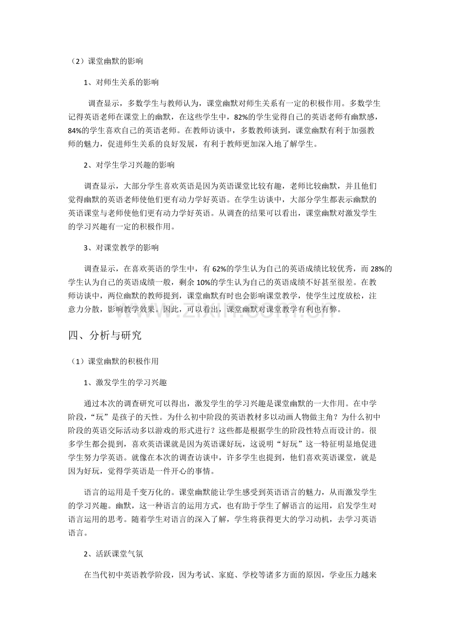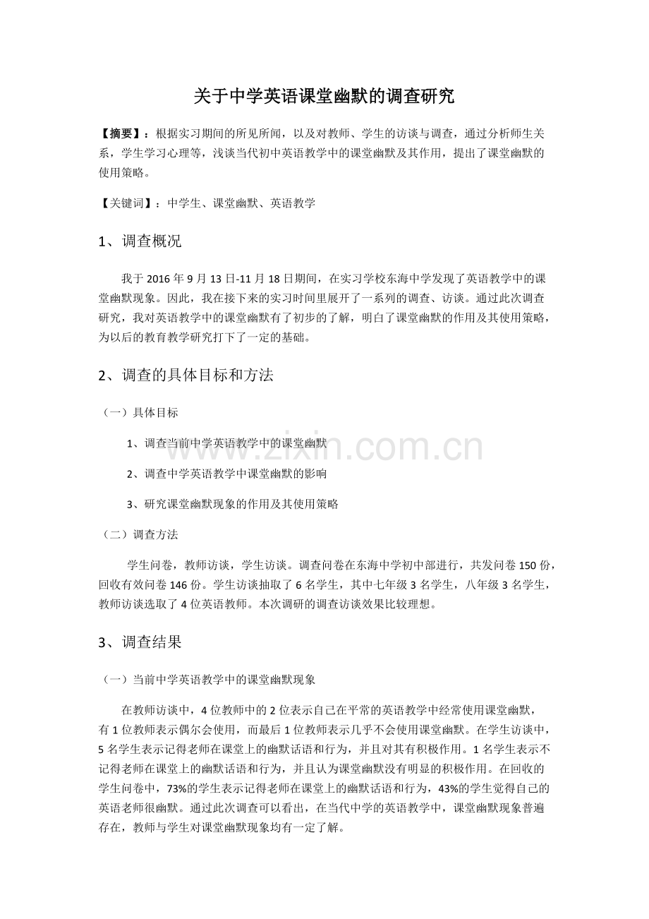 关于中学英语课堂幽默的调查研究关于中学英语课堂幽默的调查研究【摘要摘要】:根据实习期间的所见所闻,以及对教师、学生的访谈与调查,通过分析师生关系,学生学习心理等,浅谈当代初中英语教学中的课堂幽默及其作用,提出了课堂幽默的使用策略。【关键词】:中学生、课堂幽默、英语教学1、调查概况我于 2016 年 9 月 13 日-11 月 18 日期间,在实习学校东海中学发现了英语教学中的课堂幽默现象。因此,我在接下来的实习时间里展开了一系列的调查、访谈。通过此次调查研究,我对英语教学中的课堂幽默有了初步的了解,明白了课堂幽默的作用及其使用策略,为以后的教育教学研究打下了一定的基础。2、调查的具体目标和方法(一)具体目标 1、调查当前中学英语教学中的课堂幽默 2、调查中学英语教学中课堂幽默的影响 3、研究课堂幽默现象的作用及其使用策略(二)调查方法 学生问卷,教师访谈,学生访谈。调查问卷在东海中学初中部进行,共发问卷 150 份,回收有效问卷 146 份。学生访谈抽取了 6 名学生,其中七年级 3 名学生,八年级 3 名学生,教师访谈选取了 4 位英语教师。本次调研的调查访谈效果比较理想。3、调查结果(一)当前中学英语教学中的课堂幽默现象在教师访谈中,4 位教师中的 2 位表示自己在平常的英语教学中经常使用课堂幽默,有 1 位教师表示偶尔会使用,而最后 1 位教师表示几乎不会使用课堂幽默。在学生访谈中,5 名学生表示记得老师在课堂上的幽默话语和行为,并且对其有积极作用。1 名学生表示不记得老师在课堂上的幽默话语和行为,并且认为课堂幽默没有明显的积极作用。在回收的学生问卷中,73%的学生表示记得老师在课堂上的幽默话语和行为,43%的学生觉得自己的英语老师很幽默。通过此次调查可以看出,在当代中学的英语教学中,课堂幽默现象普遍存在,教师与学生对课堂幽默现象均有一定了解。(2)课堂幽默的影响 1、对师生关系的影响 调查显示,多数学生与教师认为,课堂幽默对师生关系有一定的积极作用。多数学生记得英语老师在课堂上的幽默,在这些学生中,82%的学生觉得自己的英语老师有幽默感,84%的学生喜欢自己的英语老师。在教师访谈中,多数教师谈到,课堂幽默有利于加强教师的魅力,促进师生关系的良好发展,有利于教师更加深入地了解学生。2、对学生学习兴趣的影响调查显示,大部分学生喜欢英语是因为英语课堂比较有趣,老师比较幽默,并且他们觉得幽默的英语老师使他们更有动力学好英语。在学生访谈中,大部分学生都表示幽默的英语课堂与老师使他们更有动力学好英语。从调查的结果可以看出,课堂幽默对激发学生的学习兴趣有一定的积极作用。3、对课堂教学的影响调查显示,在喜欢英语的学生中,有 62%的学生认为自己的英语成绩比较优秀,而 28%的学生认为自己的英语成绩一般,剩余 10%的学生认为自己的英语成绩不好甚至很差。在教师访谈中,两位幽默的教师提到,课堂幽默有时也会影响课堂教学,使学生过度放松,注意力分散,影响教学效果。因此,可以看出,课堂幽默对课堂教学有利也有弊。四、分析与研究(1)课堂幽默的积极作用1、激发学生的学习兴趣通过本次的调查研究可以得出,激发学生的学习兴趣是课堂幽默的一大作用。在中学阶段,“玩”是孩子的天性。为什么初中阶段的英语教材多以动画人物做主角?为什么初中阶段的英语交际活动多以游戏的形式进行?这些都是根据学生的阶段性特点而设计的。很多学生都会提到,喜欢英语课就是因为英语课好玩,这说明“好玩”这一特征明显地促进学生努力学英语。就像在本次的调查访谈中,许多学生也提到,他们喜欢英语课堂,就是因为好玩,觉得学英语是一件开心的事情。语言的运用是千变万化的。课堂幽默能让学生感受到英语语言的魅力,从而激发学生的学习兴趣。幽默,这一种语言的运用方式,也有助于学生了解语言的运用,启发学生对语言运用的思考。随着学生对语言的深入了解,学生将获得更大的学习动机,去学习英语语言。2、活跃课堂气氛在当代初中英语教学阶段,因为考试、家庭、学校等诸多方面的原因,学业压力越来越大,这难免会使对原本感兴趣的英语产生倦怠情绪。特别在一些中学,为了应对考试,英语这门学科成为了纯粹的听说读写训练,大量的作业、练习令学生苦不堪言。在这种背景下,英语教师对课堂幽默的运用就显得尤为重要了。在紧张的学习过程中,偶尔的课堂幽默让学生绷紧的神经得到放松,在欢笑中掌握知识。古希腊著名的教育家苏格拉底说过:“教育不是灌输,而是点燃火焰”。那么,课堂幽默就是点燃火焰的“火种”。课堂幽默,能够活跃课堂气氛,使疲惫的学生打起精神,让开小差的学生集中注意力。轻松愉悦的课堂氛围,显然会提高学生的学习效率,提高教学效果。3、促进良好的师生关系“师者,所以传道授业解惑也。”以前,老师与学生的关系是不平等的,老师是神圣的,地位远高于学生。但是在当代社会,我们提倡教师与学生平等,教学以学生为主体。于是乎,教师与学生的关系变得复杂起来:有的学生会“害怕”老师,想问不敢问;有的学生则会不尊重老师,公然违反课堂纪律。师生关系的变化,直接影响着教学的效果。良好的师生关系不仅有助于教师的“教”,也有助于学生的“学”。通过本次的调查研究可以发现