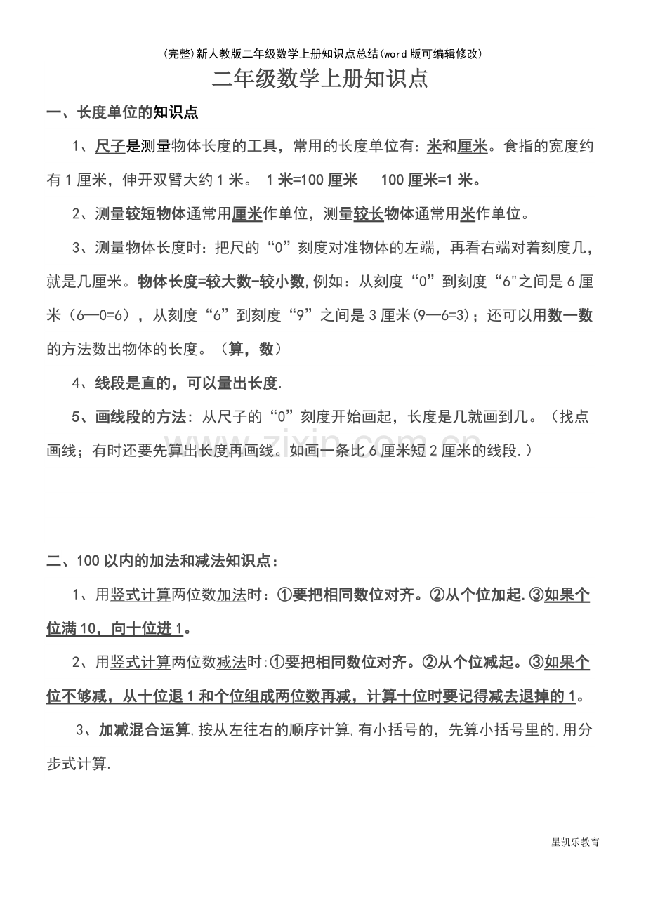 (完整)新人教版二年级数学上册知识点总结(word 版可编辑修改)星凯乐教育(完整)新人教版二年级数学上册知识点总结(word 版可编辑修改)编辑整理:尊敬的读者朋友们:这里是精品文档编辑中心,本文档内容是由我和我的同事精心编辑整理后发布的,发布之前我们对文中内容进行仔细校对,但是难免会有疏漏的地方,但是任然希望((完整)新人教版二年级数学上册知识点总结(word 版可编辑修改))的内容能够给您的工作和学习带来便利。同时也真诚的希望收到您的建议和反馈,这将是我们进步的源泉,前进的动力。本文可编辑可修改,如果觉得对您有帮助请收藏以便随时查阅,最后祝您生活愉快 业绩进步,以下为(完整)新人教版二年级数学上册知识点总结(word 版可编辑修改)的全部内容。(完整)新人教版二年级数学上册知识点总结(word 版可编辑修改)星凯乐教育二年级数学上册知识点二年级数学上册知识点一、长度单位的一、长度单位的知识点 知识点 1、尺子尺子是测量物体长度的工具,常用的长度单位有:米和厘米米和厘米。食指的宽度约有 1 厘米,伸开双臂大约 1 米。1 米=100 厘米 100 厘米=1 米。1 米=100 厘米 100 厘米=1 米。2、测量较短物体较短物体通常用厘米厘米作单位,测量较长物体较长物体通常用米米作单位。3、测量物体长度时:把尺的“0”刻度对准物体的左端,再看右端对着刻度几,就是几厘米。物体长度=较大数-较小数,物体长度=较大数-较小数,例如:从刻度“0”到刻度“6之间是 6 厘米(60=6),从刻度“6”到刻度“9”之间是 3 厘米(96=3);还可以用数一数数一数的方法数出物体的长度。(算,数算,数)4、线段是直的,可以量出长度.线段是直的,可以量出长度.5、画线段的方法:5、画线段的方法:从尺子的“0”刻度开始画起,长度是几就画到几。(找点画线;有时还要先算出长度再画线。如画一条比 6 厘米短 2 厘米的线段.)二二、100 以内的加法和减法知识点:、100 以内的加法和减法知识点:1、用竖式计算两位数加法时:要把相同数位对齐。从个位加起.如果个要把相同数位对齐。从个位加起.如果个位满 10,向十位进 1。位满 10,向十位进 1。2、用竖式计算两位数减法时:要把相同数位对齐。从个位减起。如果个要把相同数位对齐。从个位减起。如果个位不够减,从十位退 1 和个位组成两位数再减,计算十位时要记得减去退掉的 1。位不够减,从十位退 1 和个位组成两位数再减,计算十位时要记得减去退掉的 1。3、加减混合运算加减混合运算,按从左往右的顺序计算,有小括号的,先算小括号里的,用分步式计算.(完整)新人教版二年级数学上册知识点总结(word 版可编辑修改)星凯乐教育4、求“一个已知数”比“另一个已知数”多多少、少多少?用减法计算多多少、少多少?用减法计算,如 70比 25 多多少?19 比 46 少多少?5、多几的问题.未知数比谁多几,就用谁加上几.如:比 29 多 17 的数是多少?(29+17=46)三三、角的初步认识知识点:、角的初步认识知识点:1、角有 1 1 个顶点,2 2 条直边。锐角比直角小,钝角比直角大,钝角比锐角大。锐角直角直角锐角).2、用三角板可以画出直角,直角要标出直角符号(也叫垂足符号).3、所有的直角都一样大。要知道一个角是不是直角,可以用三角板上的直角三角板上的直角比一比。长方形和正方形都有 4 个角,4 个都是直角。4、角的大小与两条边的长短无关长短无关,与两条边叉开的大小有关叉开的大小有关。10、每一个三角板上都有 3 个角,其中有 1 个是直角,另外 2 个是锐角。三角板上都有 3 个角,其中有 1 个是直角,另外 2 个是锐角。5、角的画法:从一个点起,用尺子向不同的方向画两条笔直的线,就画成一个角。(从一点引出两条射线所组成的图形叫作角。)从一点引出两条射线所组成的图形叫作角。)四、六、表内乘法知识点 知识点 1、求几个相同加数的和,用乘法乘法表示更加简便.求几个相同加数的和的简便运算叫做乘法.2、加法和乘法的改写,如:5+5+5+5 写成乘法算式:54 或 45;反之,乘法也可改写成加法。如:84=8+8+8+8(在忘记乘法口诀或口诀记不准时,可把乘法算式改写成加法算式可把乘法算式改写成加法算式来计算.)加法写成乘法时,加法的和与乘法的积相同.(完整)新人教版二年级数学上册知识点总结(word 版可编辑修改)星凯乐教育3、27=14 读作:2 乘 7 等于 142 乘 7 等于 14;3 乘 4 等于 12 写作:34=1234=12.4、乘法算式中,两个乘数(因数)交换位置,积不变两个乘数(因数)交换位置,积不变.如:84=485、看图,写乘加、乘减算式时:乘加:乘加:先把相同的部分用乘法表示,再加上不相同的部分。先算相同再加不同。乘减:乘减:先把每一份数都当作相同的数来算,写成乘法,再把多算进去的数减去。如:加法:5+5+5+5+3=2323 乘加:54+3=2323 乘减:553=23236、“求几个几相加的和是多少”“求几个几相加的和是多少”和“求一个数的几倍是多少”用乘法计算,“求一个数的几倍是多少”用乘法计算,如:7的 3 倍是多少?(73=21),5 个 8 相加的和是多少?(85=40)五、观察物体知识点 知识点 1、从正面看一个立体图形,看到的是长方形,这个立体图形可能是长方体,还可能是圆柱。2、看到的立体图形的一个面是正方形,这个立体图形可能是正方体,还可能是长方体.3、看到的立体图形的一个面圆形,这个立体图形可能是球,还可能是圆柱,圆锥.4、面对面看到的物体形状一样,但方向相反。5、观察