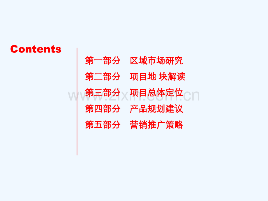 第一部分第一部分 区域市场研究区域市场研究第二部分第二部分 项目地项目地 块解读块解读第三部分第三部分 项目总体定位项目总体定位第四部分第四部分 产品规划建议产品规划建议第五部分第五部分 营销推广策略营销推广策略Contents 第一部分第一部分 五河五河县市市场研究研究 区域价值区域价值-五河县宏观经济五河县宏观经济指标名称单位怀远县五河县固镇县工业固定资产亿元33.84.521.59农业总产值亿元60.732.7工业入库税金万元33.8零售总额亿元5411.311.2农民人均纯收入元4837n五河县总人口达总人口达72万人,其中城区常住人口万人,其中城区常住人口15万万社会消费品零售总额都在呈上升趋势,这些都为五河县商业的展提供了优越的先天条件。n五河县商业现状及经济发展趋势,呼吁大型商业中心的出现。五河城市规划采用“一城四区”的结构形式。老城区以居住和商业为主;城南新区以行政办公和工业园区为主;崇东新区以居住为主;夹河滩休闲区以休闲观光为主。县级行政中心迁至城南新区老五蚌路与城南大道间中心地区。采取“组团发展,突出重点”的方针,充分依托旧城改造建设商业中心,完善建设市区西部、南部和东部各个组团。本本 案案青年圩广青年圩广场场国贸大国贸大厦厦华润苏华润苏果果万福商业万福商业街街新天地商业新天地商业广场广场左岸名城左岸名城商业及小商业及小区区皇都大酒皇都大酒店店五河宾馆五河宾馆五河三五河三小小五河县政府五河县政府小商品市小商品市场场地税局地税局第一中学第一中学华运超市华运超市锦绣兰庭小区锦绣兰庭小区电视台电视台区域价值区域价值-五河县宏观经济五河县宏观经济本案处于老城区中心地带,是城市规划中的重点商业项目。区域价值区域价值-交通便利交通便利,公路运输便捷,公路运输便捷 西距蚌埠50公里,距南京、合肥160公里,从县城出发25分钟可达三个高速公路(蚌宁高速公路沫河口、明光出口和宿迁至南京高速公路双沟出口),104国道、306、304省道把五河与省内外紧密连结。即将开工建设的徐州明光高速公路和规划中的双沟沫河口高速公路在五河县城附近留有出口;铁路:京沪铁路从南部边境通过,拟建的京沪铁路支线沫河口工业区铁路专运线已列入国家计划。水路:千里淮河横贯五河东西,长年满足1000吨级船舶通航,拟建的蚌埠港五河城关作业区和沫河口作业区可供千吨级船舶停靠。区域价值区域价值-经济辐射能力强经济辐射能力强 辐射区域广辐射区域广五河作为蚌埠北部经济核心,其周边辐射能力很强,10公里范围内辐射五个乡镇,辐射辐射面积520平方公里。五河定位于蚌埠东北部新中心,城市化进程日益加快,区域发展迅猛,潜藏着巨大的商业需求。城镇名称城镇名称区域面积区域面积(平方公里)(平方公里)所辖人口所辖人口(人)(人)凤阳县1949.573万泗洪县2729.62729.6108108万万固镇县1363136360.9260.92万万五河商业物业市场分析五河商业物业市场分析商业物业的两种类型:大型集中商业:大型集中商业:国贸;临街商铺临街商铺:万福、新天地沿街商铺等;大型商业物业比较表大型商业物业比较表名称名称规模规模(M(M2 2)商业主力店商业主力店(主题商业主题商业)售价售价返租情况返租情况销售率销售率国贸3万华润苏果8000左右返租8%,共返15年90%新天地15万平方米以服装、鞋子、饰品等业态沿街1万左右内街7千左右无98%万福7.8万平米以服装、鞋子、饰品等业态沿街1万左右内街7千左右无100%西城美墅小区配套商业8000左右无未售模式:确定一个新的商业经营主题,或者以极大的优惠政策引入主力商家,并以返租的形式销售的运作手法;商铺调查表商铺调查表10万万租金和售价的关系租金和售价的关系u五河商铺的租金回报率一般处于4%-5%之间的较低水平;人流量是影响商业街价值的关键因素:人流量是影响商业街价值的关键因素:步行街由于人流量大,服务范围广,业态丰富,经营状况好于服务住宅的社区商业;竞争态势竞争态势-地块周边商业租金处于待发展阶段地块周边商业租金处于待发展阶段根据目前五河县商业中心商业门店的租金调研,本案所处位置租金水平比较高,处于黄金地段中心的位置。但是,本案启动后,随着商业部分的兴起,商业档次与氛围的成长,本案将当之无愧的成为五河的商业核心。五河住宅市场分析五河住宅市场分析西城美墅西城美墅项目总占地66742.6平米,多层、小高层、高层。开发商实力比较雄厚,离县中心比较远,属于新区,项目整体现代风格,整体规划细节比较合理,周边配套不够完善。户型设计比较合理76124平米。五河住宅市场分析五河住宅市场分析亿豪泊景城亿豪泊景城项目总占地66742.6平米,多层、小高层、高层。开发商实力比较雄厚,离县中心比较远,属于新区,项目整体现代风格,整体规划细节比较合理,周边配套不够完善。户型设计比较合理76124平米。五河住宅市场分析五河住宅市场分析畅达城中嘉园畅达城中嘉园项目约5万平米,项目已高层和裙房结合的形式布局,开发商是以前国贸的开发商。五河住宅市场分析五河住宅市场分析腾飞南苑腾飞南苑项目由多层、小高层、小区商业组成。开发商是本地开发商,信誉度不够高,项目整体设计风格比较土气。竞争态势竞争态势五河县现有项目分析五河县现有项目分析项目名称项目名称在售情