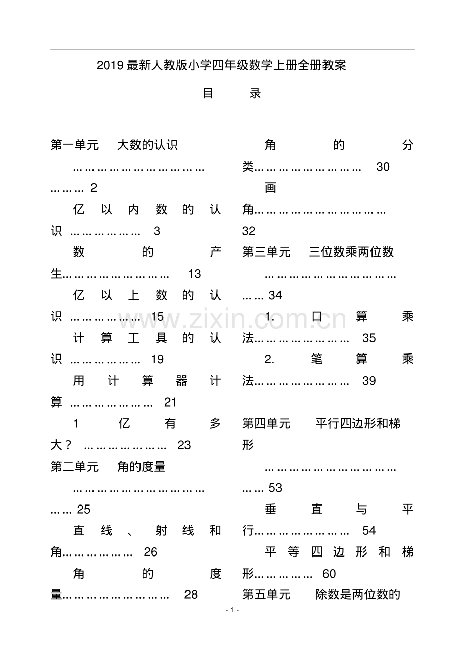 -1-2019 最新人教版小学四年级数学上册全册教案目录第一单元大数的认识 2 亿以内数的认识 3 数的产生 13 亿以上数的认识 15 计算工具的认识 19 用计算器计算 21 1亿有多大?23 第二单元角的度量 25 直线、射线和角 26 角的度量28 角的分类30 画角32 第三单元三位数乘两位数34 1.口算乘法35 2.笔算乘法39 第四单元平行四边形和梯形53 垂直与平行54 平等四边形和梯形 60 第五单元除数是两位数的-2-除法 66 整理和复习91第六单元统计 93 你寄过贺卡吗?99 第七单元数学广角 102 第八单元总复习109 多 位 数 的 认 识 图 复习 110 乘法和除法复习 112 空间和图形复习 114 统计复习116 3 第一单元大数的认识第一课时亿以内数的读法教学内容:人教版四年级上册教科书第25 页的例 1,例 2 教学目标:1 使学生认识计数单位“万”、“十万”、“百万”、“千万”和“亿”。知道亿以内各个计数单位的名称和相邻两个计数单位之间的十进关系。掌握亿以内的数位顺序。2理解多位数的读法,在具体情境中,能够根据数级正确地读出多位数,体会并能阐述多位数读数的规律。3结合现实素材,使学生感受亿以内数的意义,培养学生的数感。4让学生在活动中体会数学与现实生活的联系,培养学生用数学的眼光观察生活和应用数学的意识,培养学生自主探究,自我评价和善于合作的能力。教学重点、难点、关键:1重点:教学读万级的数。2难点:亿以内中间和末尾有0 的数的读法。3关键:让学生熟练掌握数位顺序表。掌握数位的名称、顺序,进率关系。四位分级法以及数的组成等知识。并以万以内数的读法为基础,把个级读的方法推广到万级。能正确地读亿以内的数。教学准备:师准备计数器,学生每人收集现实生活中有关万以内的及比万大的数的信息各两条。教学过程:一、复习1请学生说说自己所收集到的信息,教师将其中的数据进行记录。2考考你:这些数你会读吗?(在万以内数据中选择4 条:一般数、中间有 0 的数,末尾有0 的数、中间、末尾都有0 的数,让学生尝试读数)3说说你是怎么读的?小结万以内的数的读法。4关于万以内的数,你还知道什么知识?(1)计数单位:一(个)、十、百、千。(2)相邻两个单位之间的进率是10。如:10 个一是十,10 个十是一百,10 个一百一千,10 个一千是一万。(3)数位:个位、十位、百位、千位。(4)组成:例 8030 是由 8 个千和 3 个十组成的。二、导入新课同学们,我们已经学习了万以内的数。在日常生活和生产中,我们还经常4 用到比万大的数。同学们这些数据你会读吗?今天我们一起来学习亿以内数的读法,同学们有信心学好吗?板书课题:亿以内数的读法三、教学亿以内数的认识通过预习课文,你了解了亿以内数的哪些新知识?先四人小组讨论,在汇报,师在黑板上作简要记录。1数位名称:万位、十万位、百万位、千万位、亿位。2计数单位:万、十万、百万、千万、亿。边汇报边整理成数位顺序表:亿千百十万千百十个万万万位位位位位位位位位3计数方法:用万作单位,一万一万地数,10 个一万是十万,10 个十万是一百万,10个一百万是一千万,10 个一千万是一亿。由此得出:每相邻两个单位之间的进率都是10。要求学生在小组里拨珠数一数,然后请学生代表在全班进行示范。4分级方法:从个位起每四个数位都是一级。(1)个位、十位、百位、千位是个级,表示的是多少个一。(2)万位、十万位、百万位、千万位是万级,表示的是多少个万。(3)亿位和亿位以上的数位是亿级,表示的是多少个亿。在数位顺序表上补充数位。亿级万级个级亿千百十万千百十个万万万位位位位位位位位位5数的组成:在13819000 中 8 在十万位,表示8 个万,说说其他数位上的数各表示多少?6 总结:把计数单位按照一定的顺序排列起来,他们所占的位置叫做数位。一个数字所占的数位不同,它所表示的数的大小也不同。7练一练:(1)一万一万地数,从九十六万数到一百零三万。(2)十万十万地数,从七十万数到一百万。(3)一千万一千万地数,从八千万数到一亿。(指名读,全班读。)(4)说一说生活中有哪些地方用到万以上的数。(分小组读一读本小组成5 员收集的信息数据。)四、数学亿以内数的读法。看来大家对亿以内数的知识了解得真不少,那么这些亿以内的数你们会不会读呢?2496 24960000 6407000 85000300 1学生试读。2全班交流。(1)在出现不同答案时,鼓励学生各抒己见,阐明理由。教师适当点拨,指正。(2)把每个数的读法用汉字记录下来,开展小组讨论:读数时有哪些规则?(3)小组推荐代表发言,其他同学补充,修正,最后进行归纳:先读万级,再读个级。读万级时,按照个级的读法读,再在后面加读一个“万”字;每级末尾不管有几个 0,都不读,其他数位有一个0 或连续几个 0,都只读一个“零”。(4)试一试:读出下面各数。569000 24600 708000(5)向读得又对又快的同学取经,看怎样读起来更方便?学生可能提出以下几种方法:数出最高位后,按照数位顺序往下读;先分级,用虚线把万级和个级隔开,先读万级,再读个级;(可以进一步询问:为什么用虚线隔开呢?)标上数位再读。肯定学生的方法,然后征求意见:你们会选用哪种方法呢?五、巩固联系1课本第 9 页的第 5 题:你能正确地读出第2 页上的数吗?(先个别读,再同桌互读。)2课本第 8 页的第 2 题:读出下面每组数。(重点是准确读出每一级中间,末尾有 0 的数。)六、课堂小结你有什么收获?还有什么不懂的地