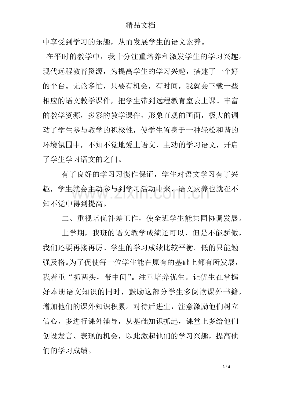 总之,本学期我尽了自己的责任和能力去努力完成了教学工作任务。今后我将继续加倍地努力工作,不断更新自己的教学理念,严格要求自己,时刻注意汲取他人的长处,弥补自己的不足,兢兢业业的做好自己的教学工作,尽量做到最好,为全面提高学生的语文成绩而努力奋斗。