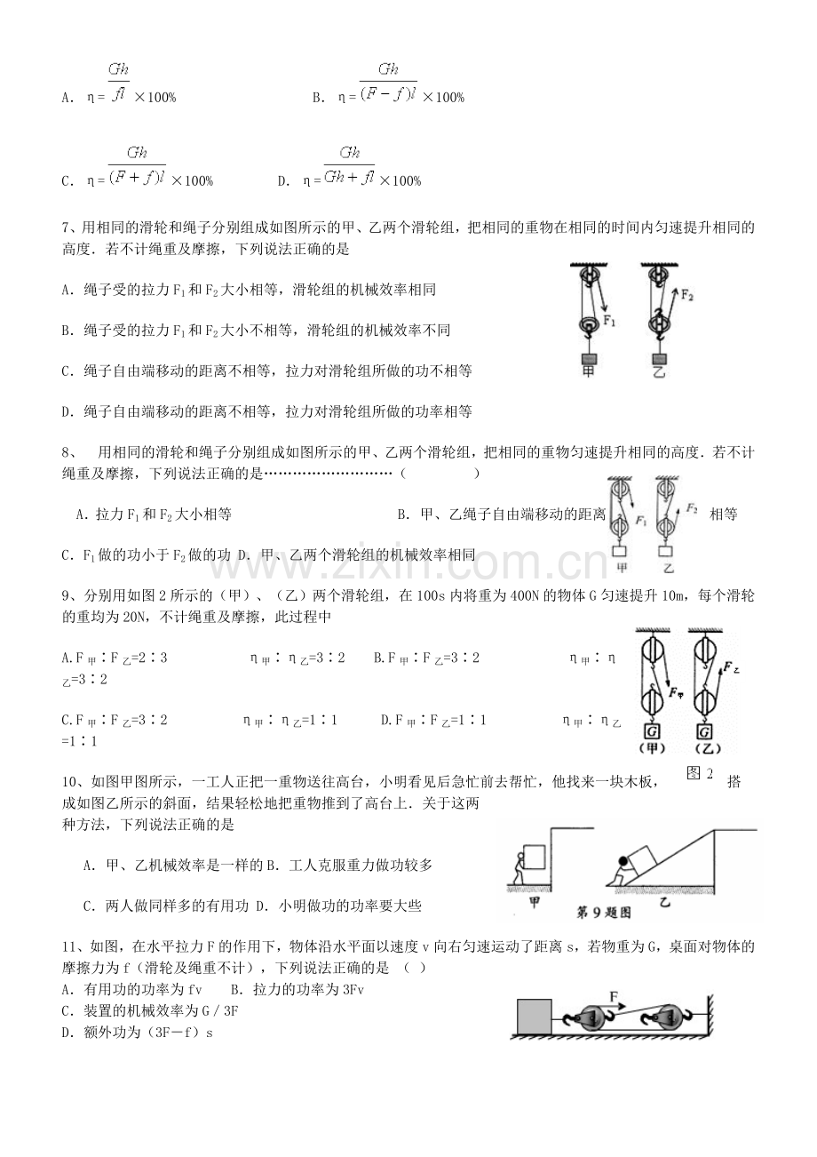 9、分别用如图2所示的(甲)、(乙)两个滑轮组,在100s内将重为400N的物体G匀速提升10m,每个滑轮的重均为20N,不计绳重及摩擦,此过程中