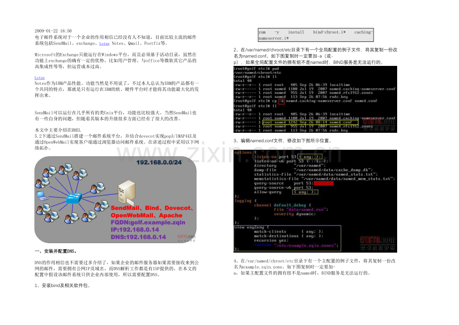DNS的作用相信也不需要过多介绍了,如果企业的邮件服务器如果需要接收来到公网的邮件,需要拥有公网IP及域名,而DNS解析工作都是有ISP提供的。在本文的配置中假设该邮件系统只供企业内部使用,所以需要配置DNS。